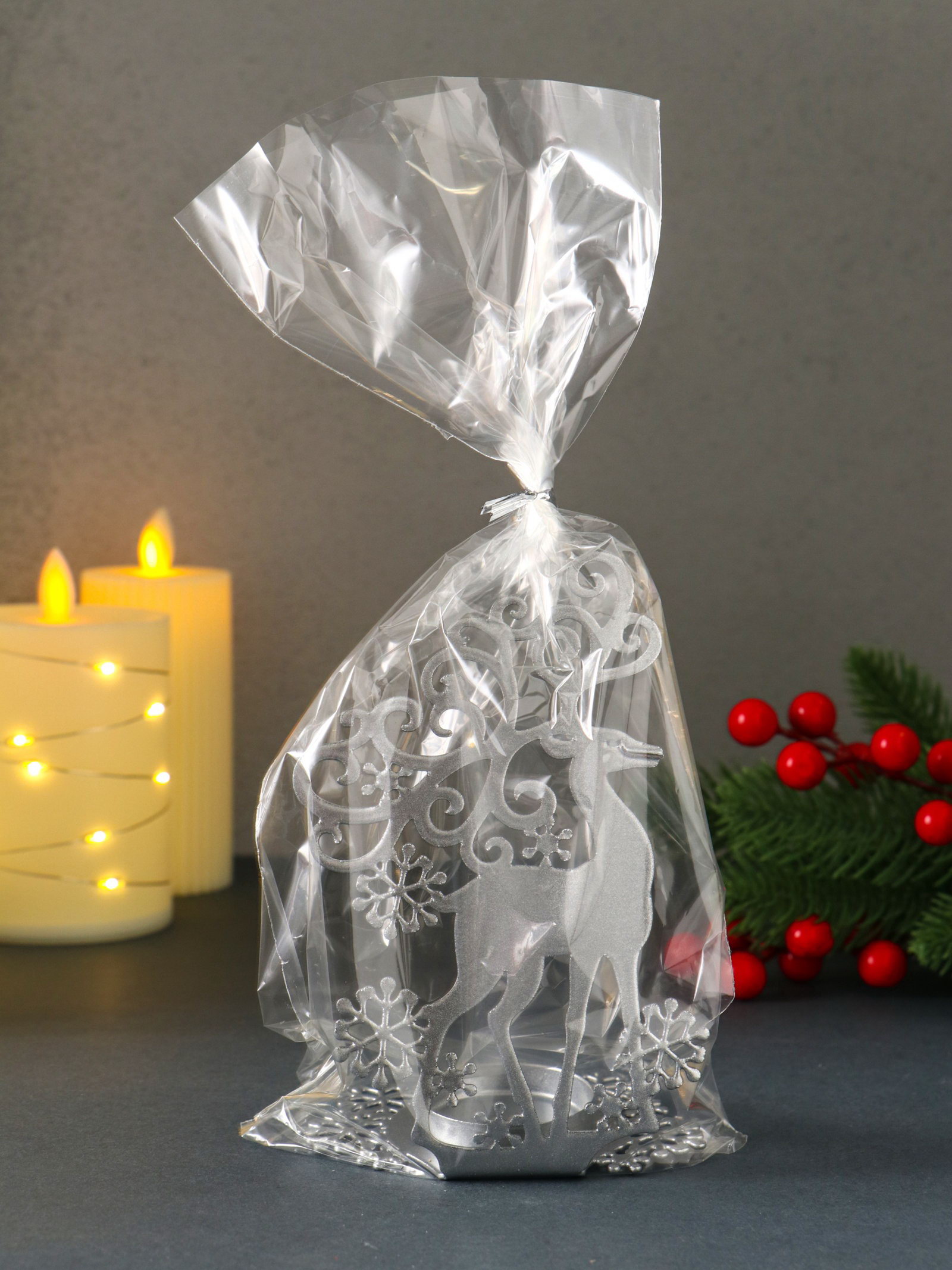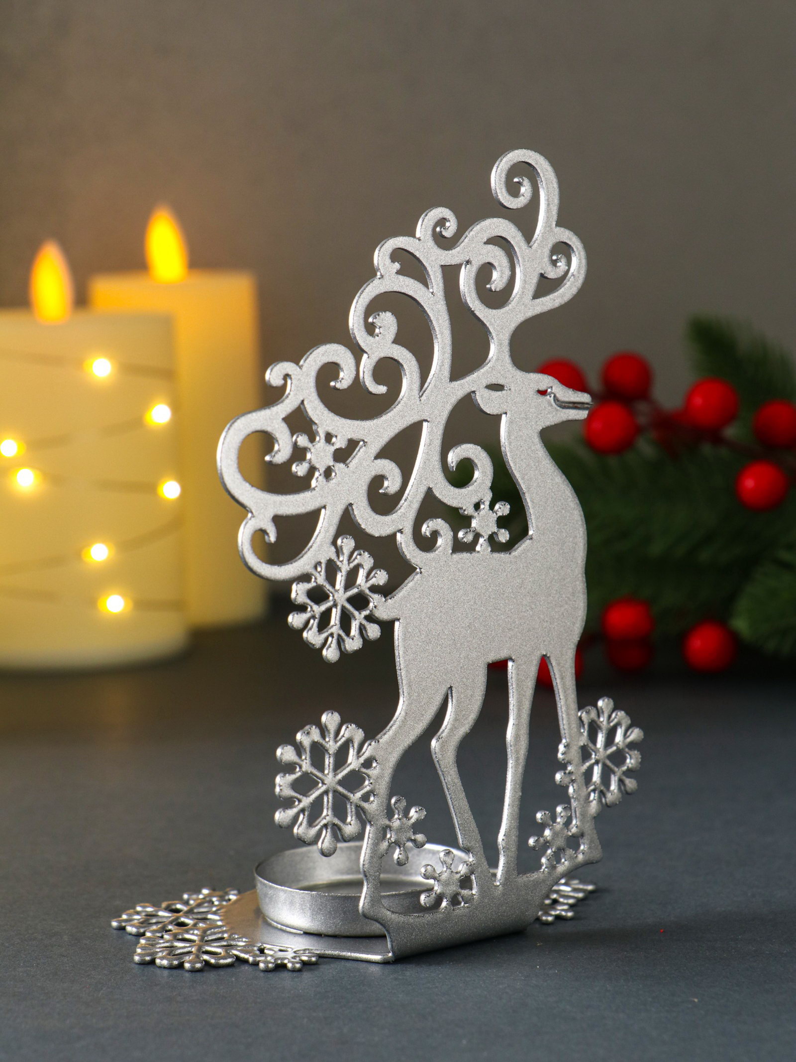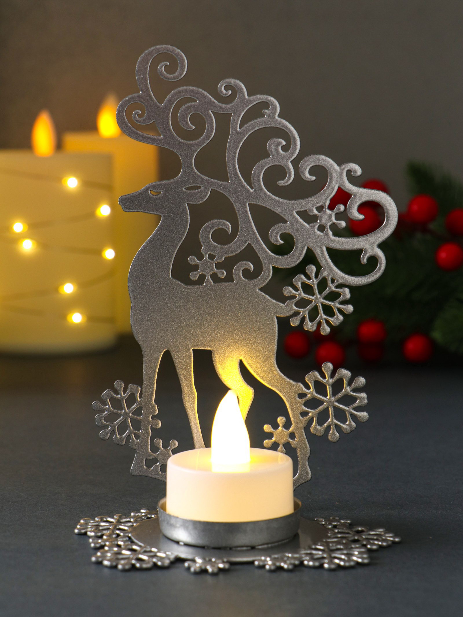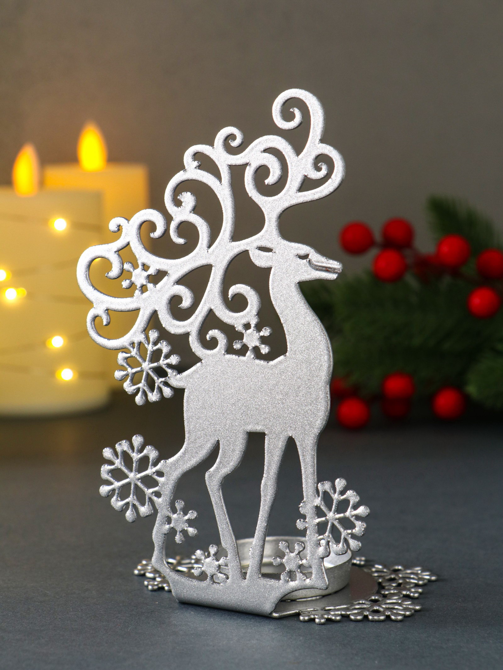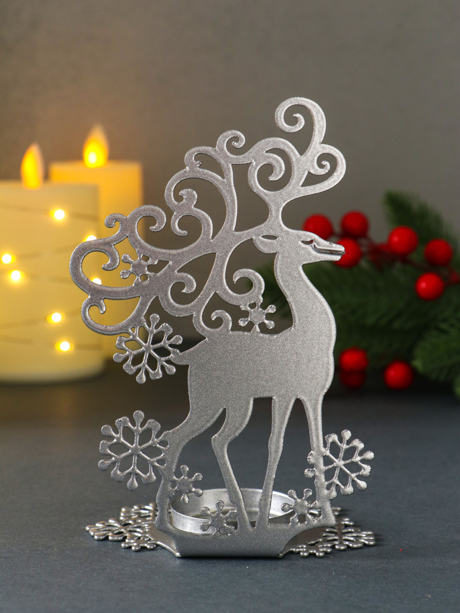 Подсвечник на 1 свечу "Олень новогодний", металл, серебряный, 6.5x9.6x14.5 см, Омский свечной завод, Россия