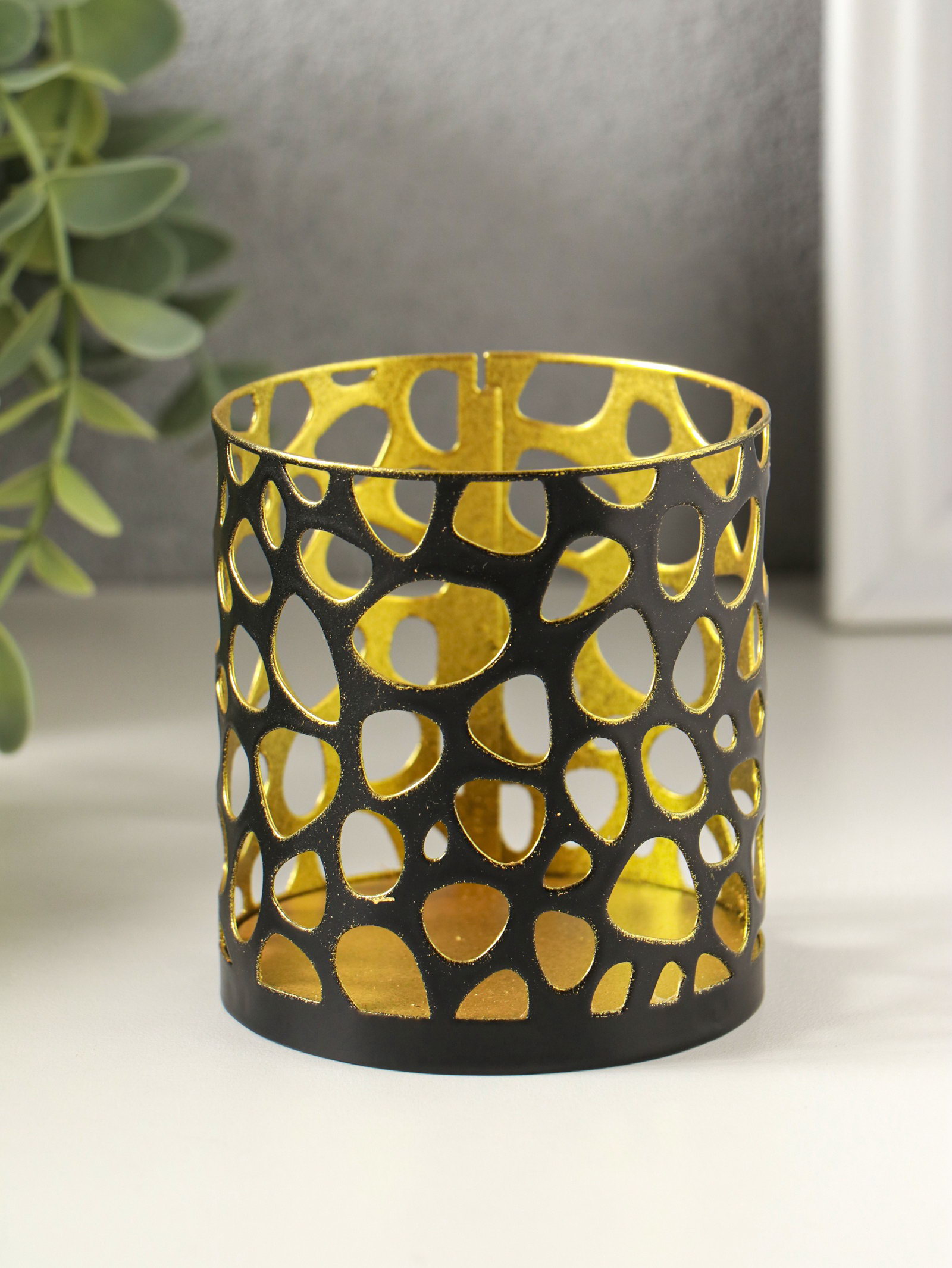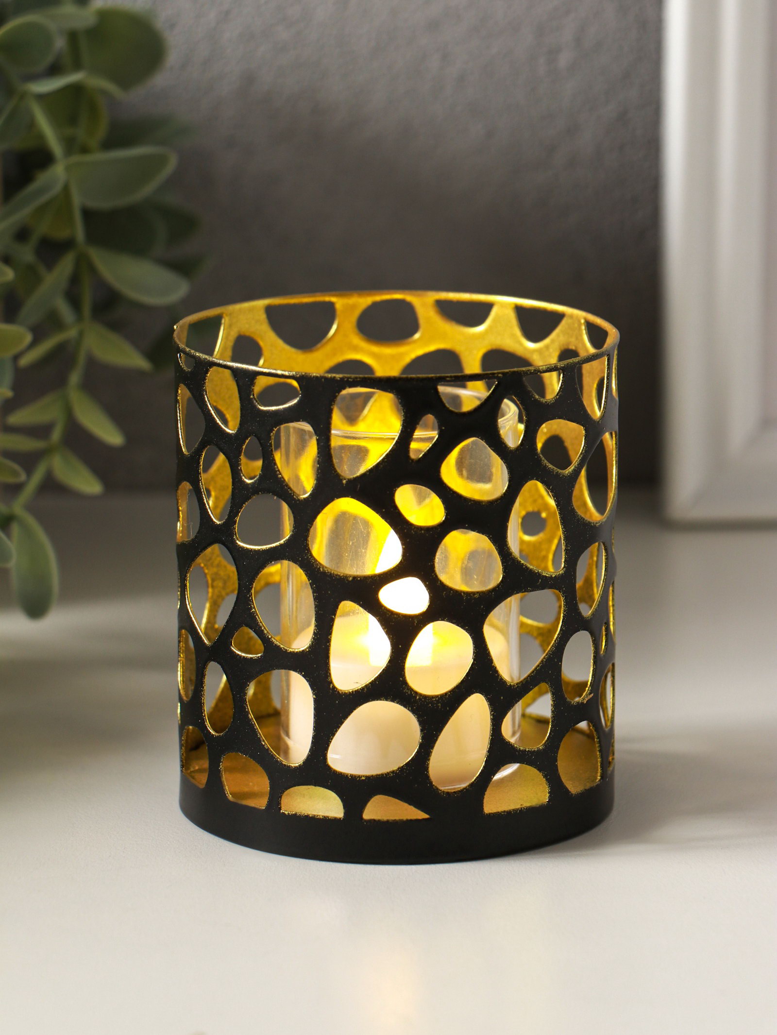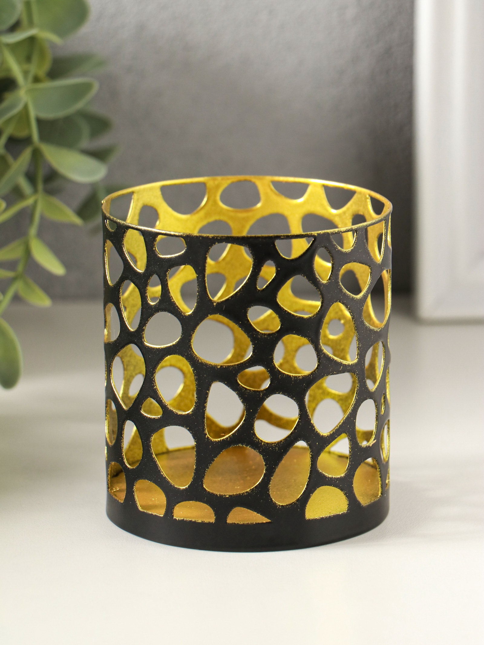 Металлический подсвечник "Цилиндр камушки", 7.5x7.5x8 см, чёрный с золотом, Омский свечной завод, Россия