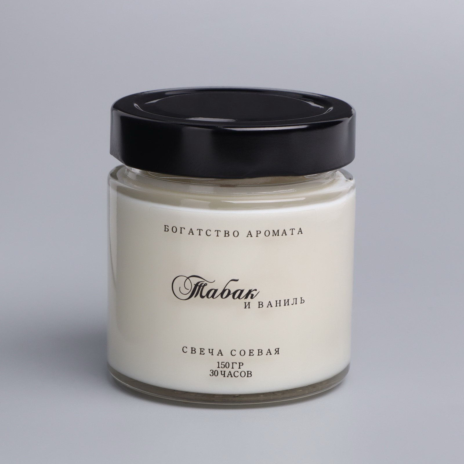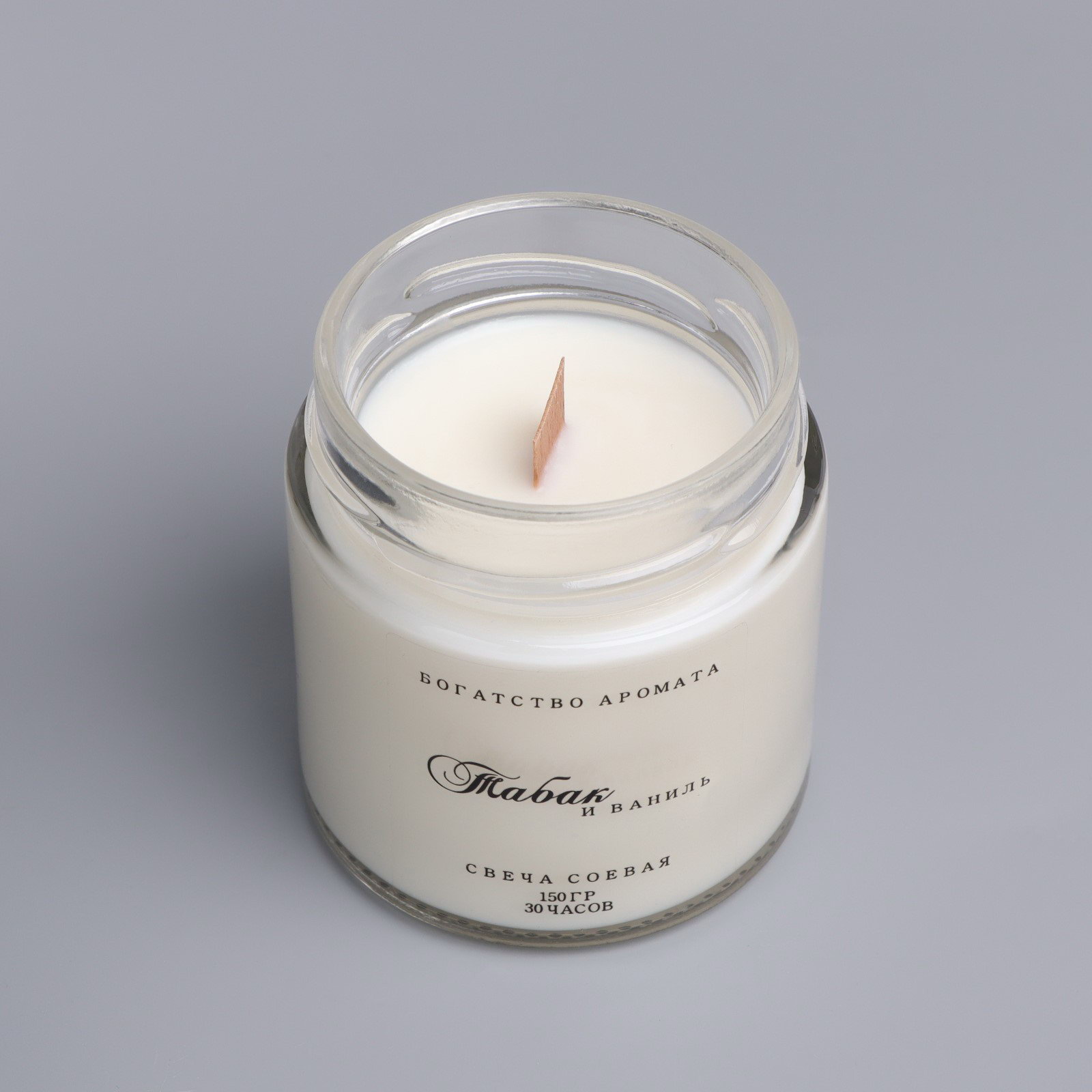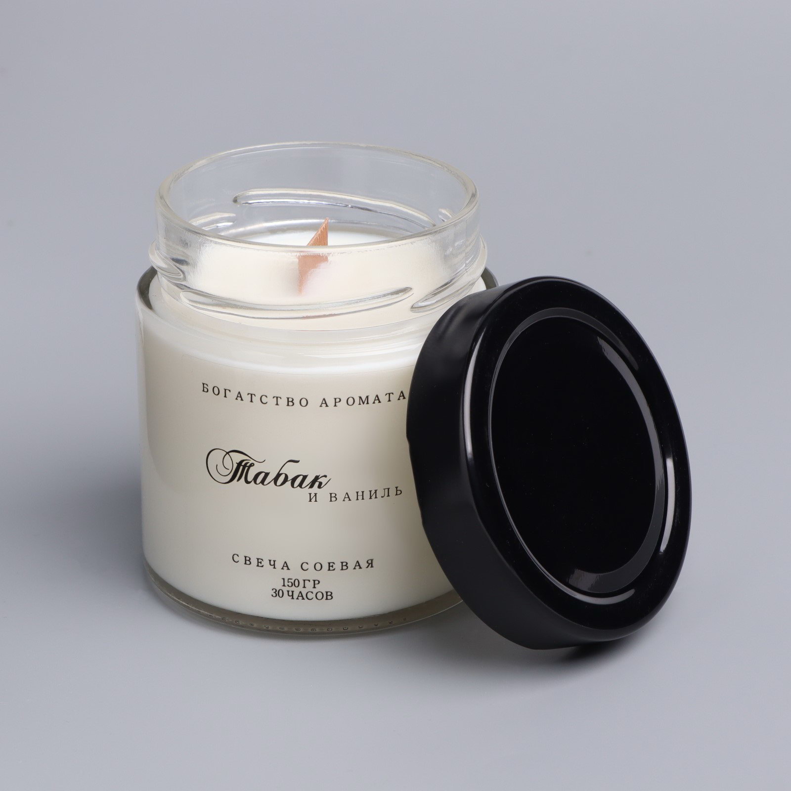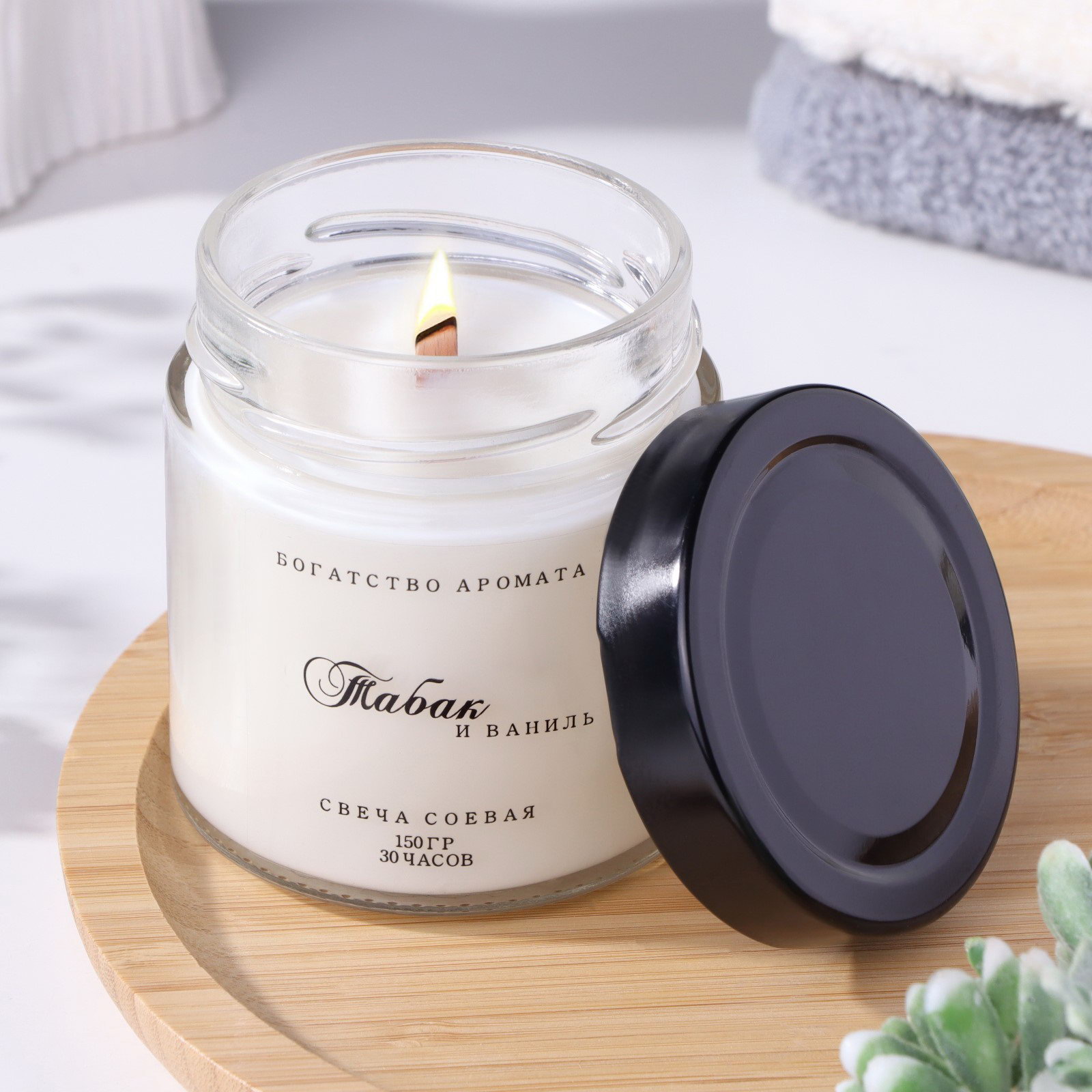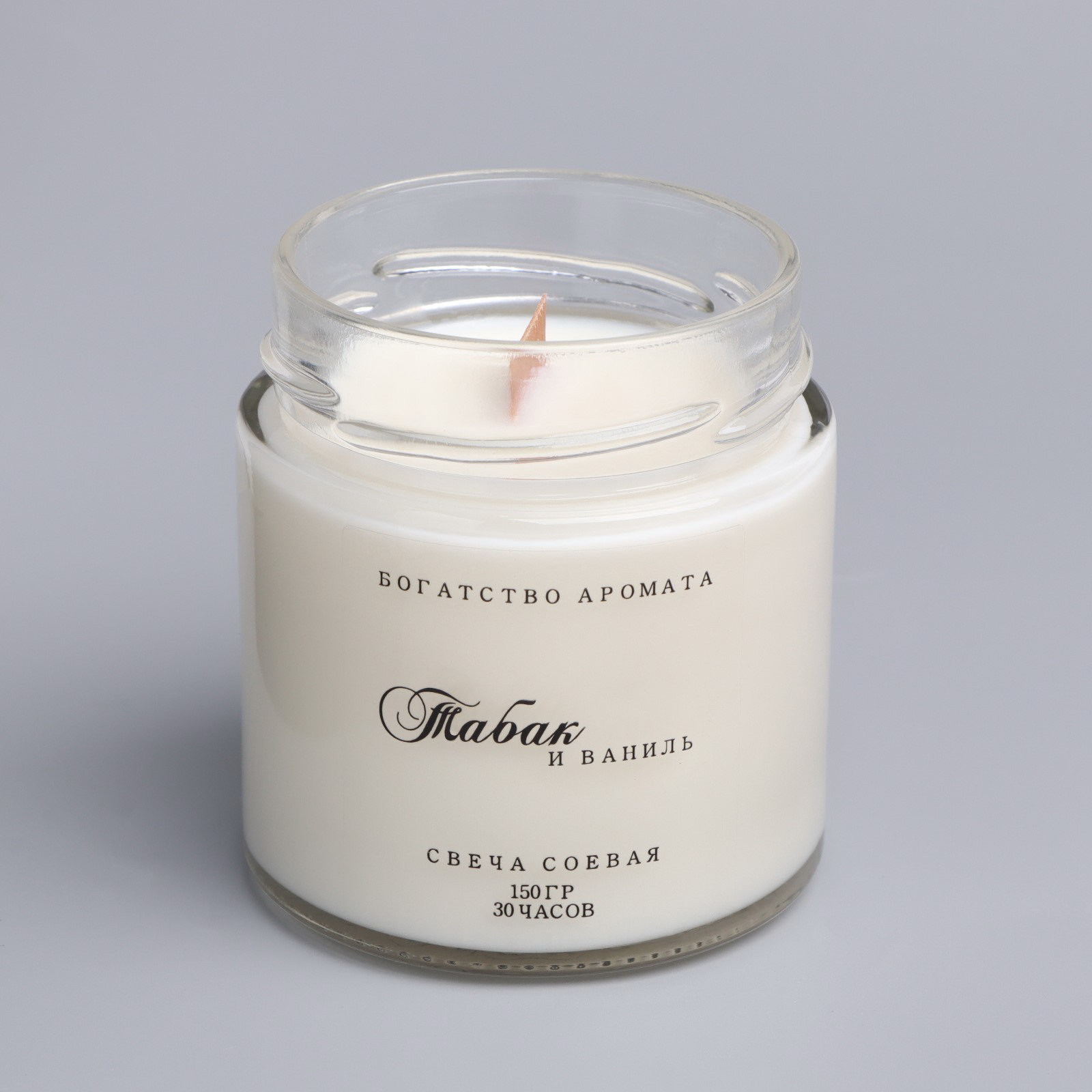 Свеча ароматическая из соевого воска в банке, 150 г, деревянный фитиль, табак и ваниль, Богатство Аромата, Россия