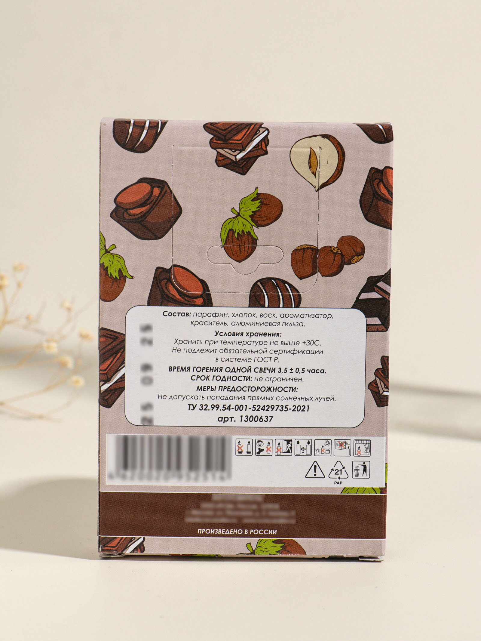 Состав: Воск, Парафин Размер упаковки: 8 x 1.5 x 12 см. tnved: 3406000000 Температурное ограничение: Нет В наборе, шт.: 6 Ароматизированные: Да Тематика праздника: Универсальная тематика Темпер. ограничение НЕ НИЖЕ ℃: -10 Набор: Да Аромат: Шоколад Темпер. ограничение НЕ ВЫШЕ ℃: +25 Форма свечи: Гильза Цвет: Коричневый Набор из шести ароматических свечей с тёплым и уютным запахом шоколада. Идеальное решение для создания расслабляющей атмосферы дома в любое время года. Готовый комплект изящных свечей станет универсальным подарком к празднику или приятным приобретением для себя. Особенности