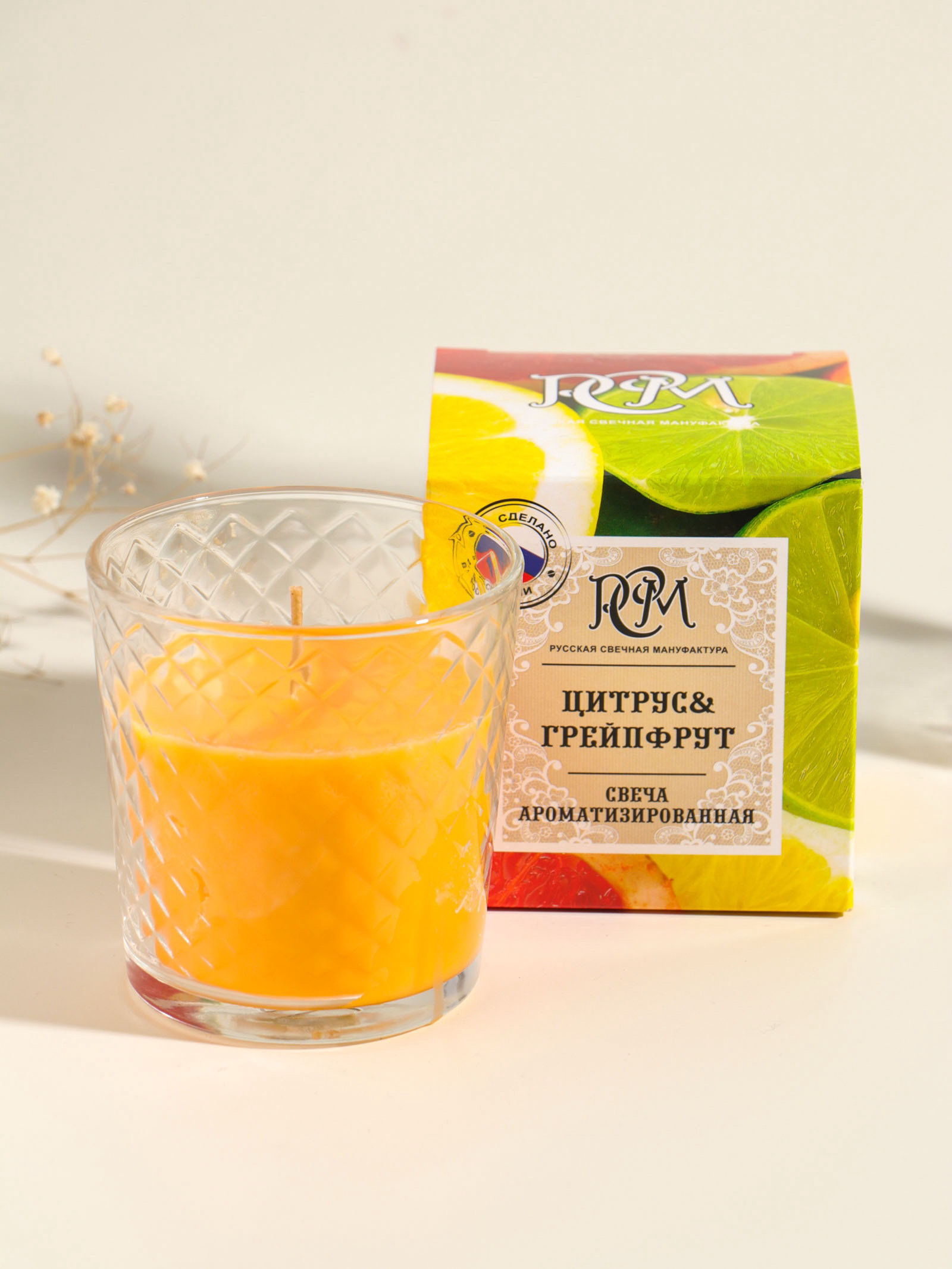 Ароматическая свеча в стакане "Цитрус и грейпфрут", 8x8.5 см, 30 ч, Русская свечная мануфактура, Россия
