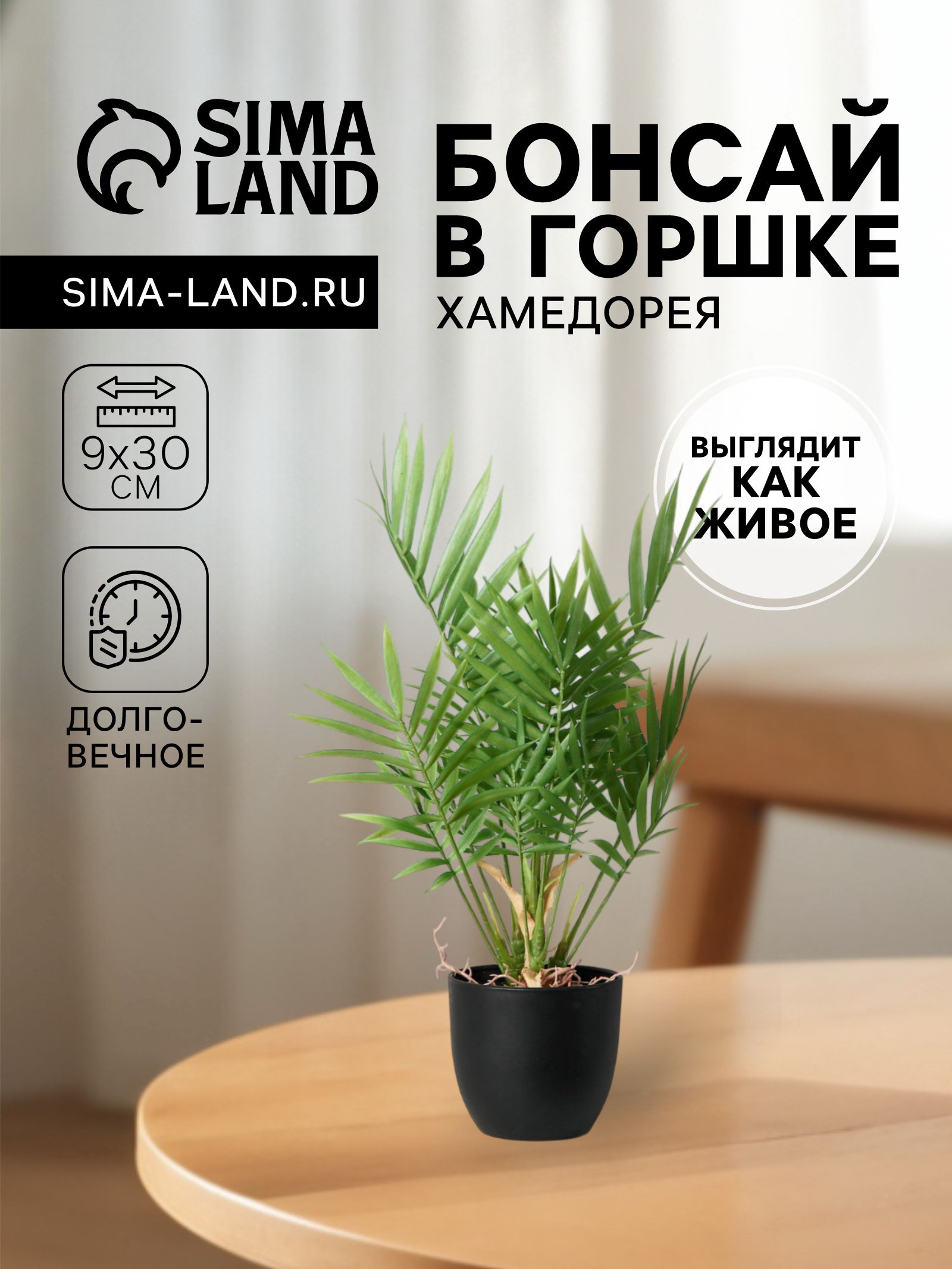 Размер упаковки: 10 x 34 x 10 см. Размер упаковки: 10 x 34 x 10 см. tnved: 6702100000 Высота, см: 30 Цвет: Зелёный Компактная хамедорея в горшке украшение для дома и офиса. Неприхотливая пальма с изящными зелёными листьями создаёт атмосферу тропиков даже в небольшом пространстве. Подходит для тех, кто ценит лаконичный зелёный акцент без сложного ухода. Особенности