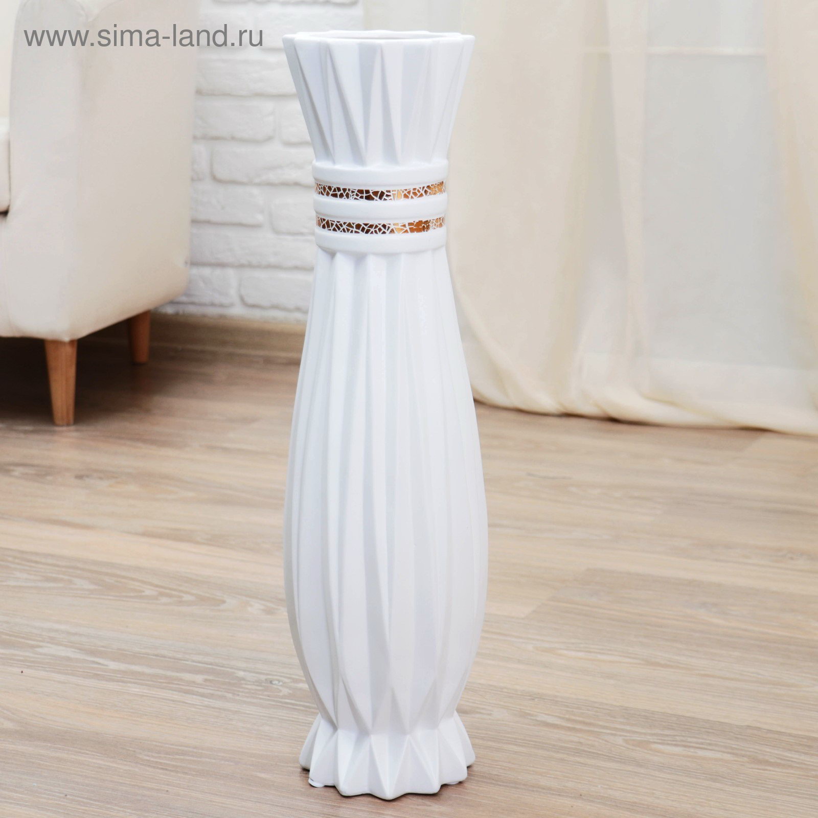 Керамическая ваза для цветов, сухоцветов "Геометрия люкс", вертикальные полосы, напольная, 15x60 см, белый, 15x60 см., Китай
