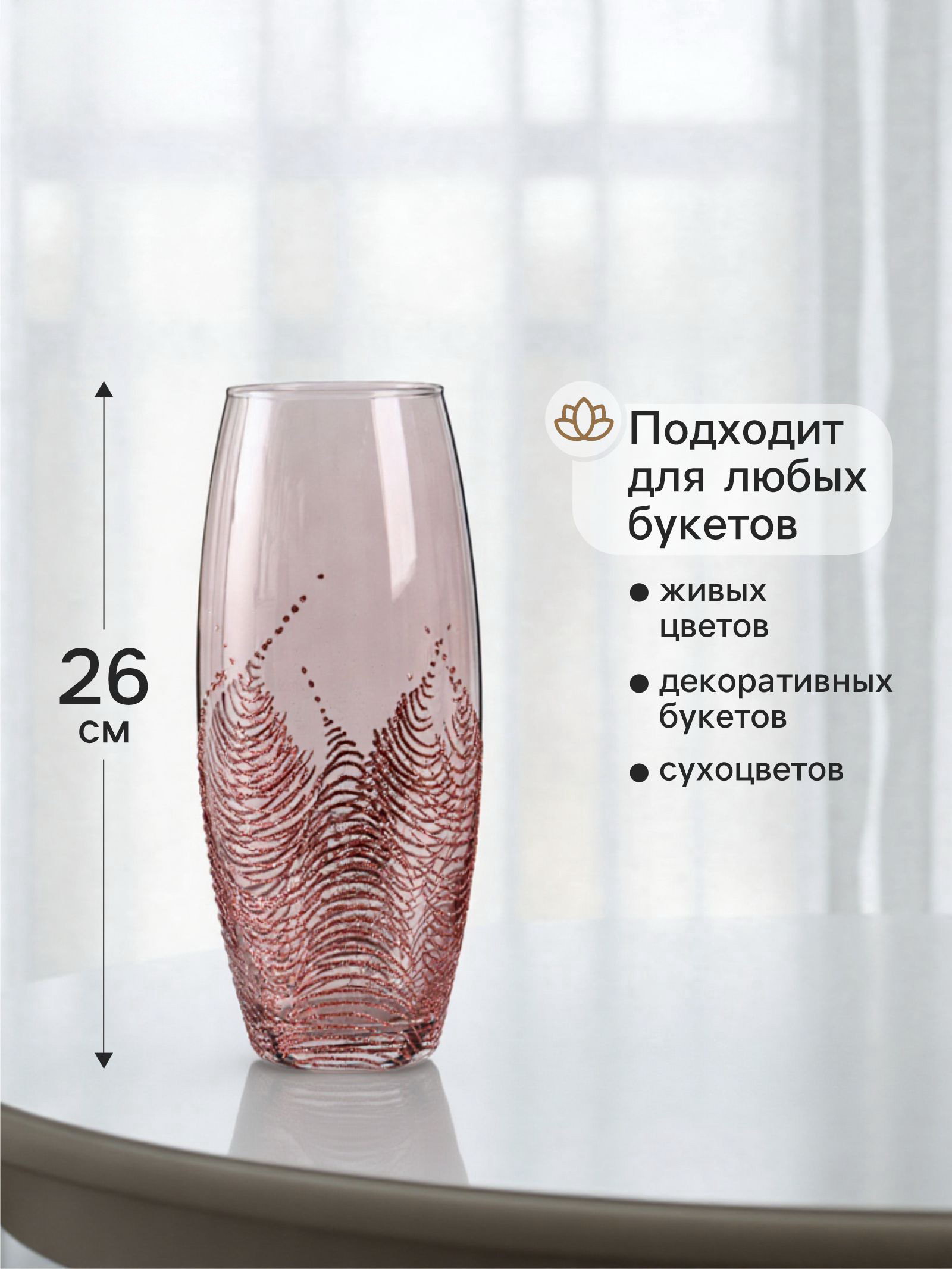 Размер упаковки: 11.5 x 11.5 x 27 см. tnved: 7013500000 Температурное ограничение: Нет Запрет реализации по сегментам: 00000000272 Высота, см: 26 Вид вазы: Настольная Цвет: Розовый | ||