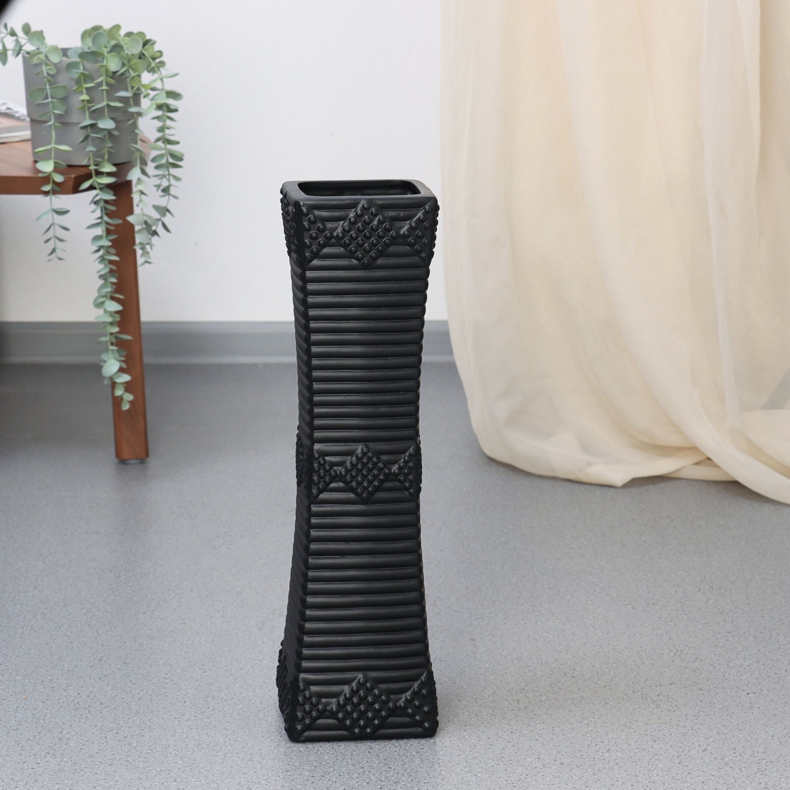 Размер упаковки: 14 x 46 x 14 см. Запрет реализации по сегментам: 00000000272 Оформление: Рельефные Цвет: Чёрный Вид вазы: Напольная Высота, см: 46 Высота, мм: 460 Высота, мм: 460 tnved: 6913910000 Строгий акцент для вашего интерьера . Напольная ваза "Харви" это скульптурный объект, превращающий пустой угол в завершённую композицию. Чёрная керамика и выразительный рельеф создают игру света и тени, добавляя пространству глубины и характера.