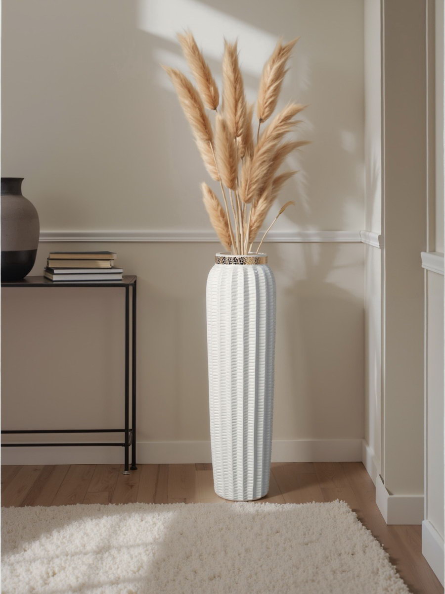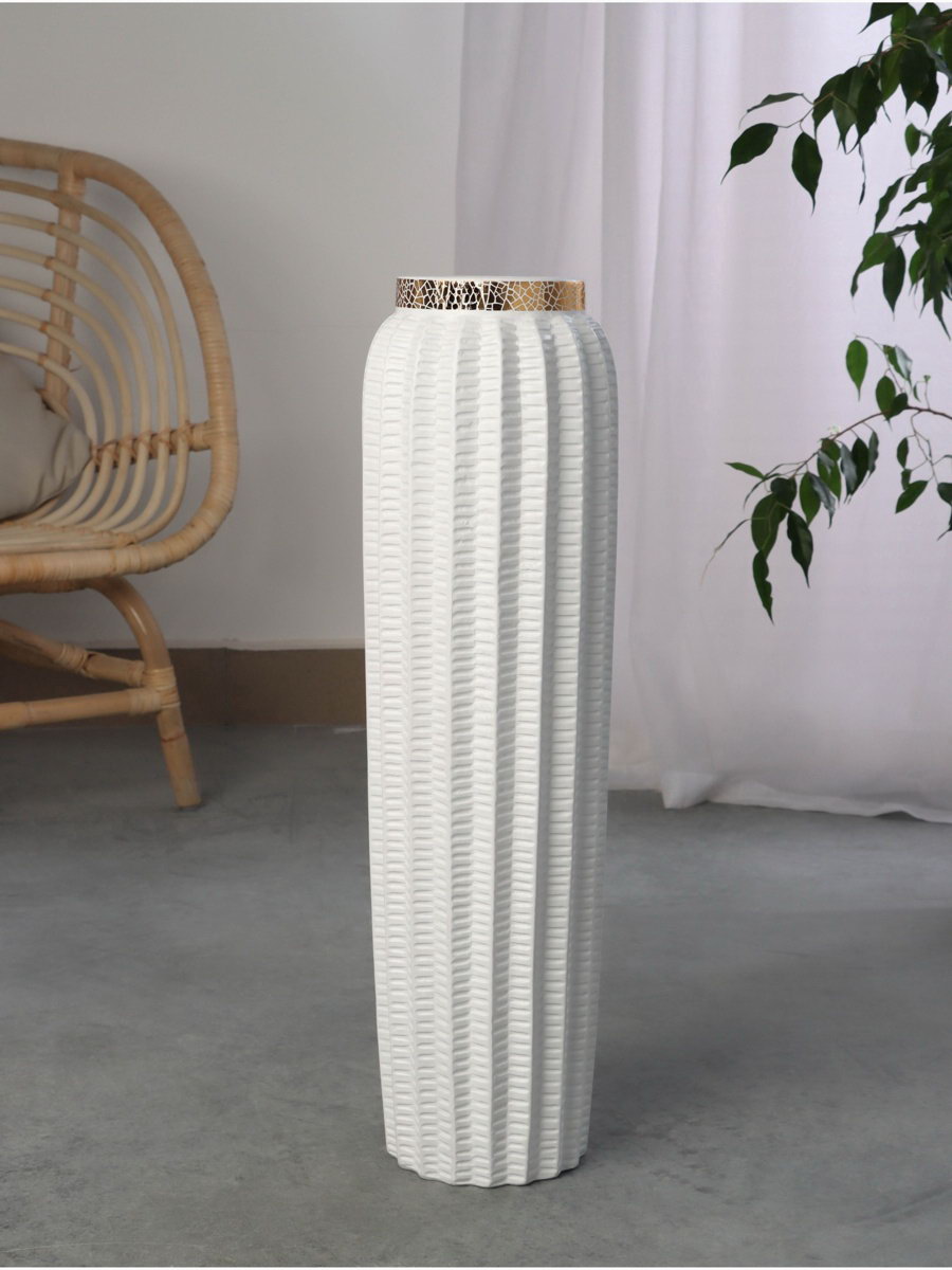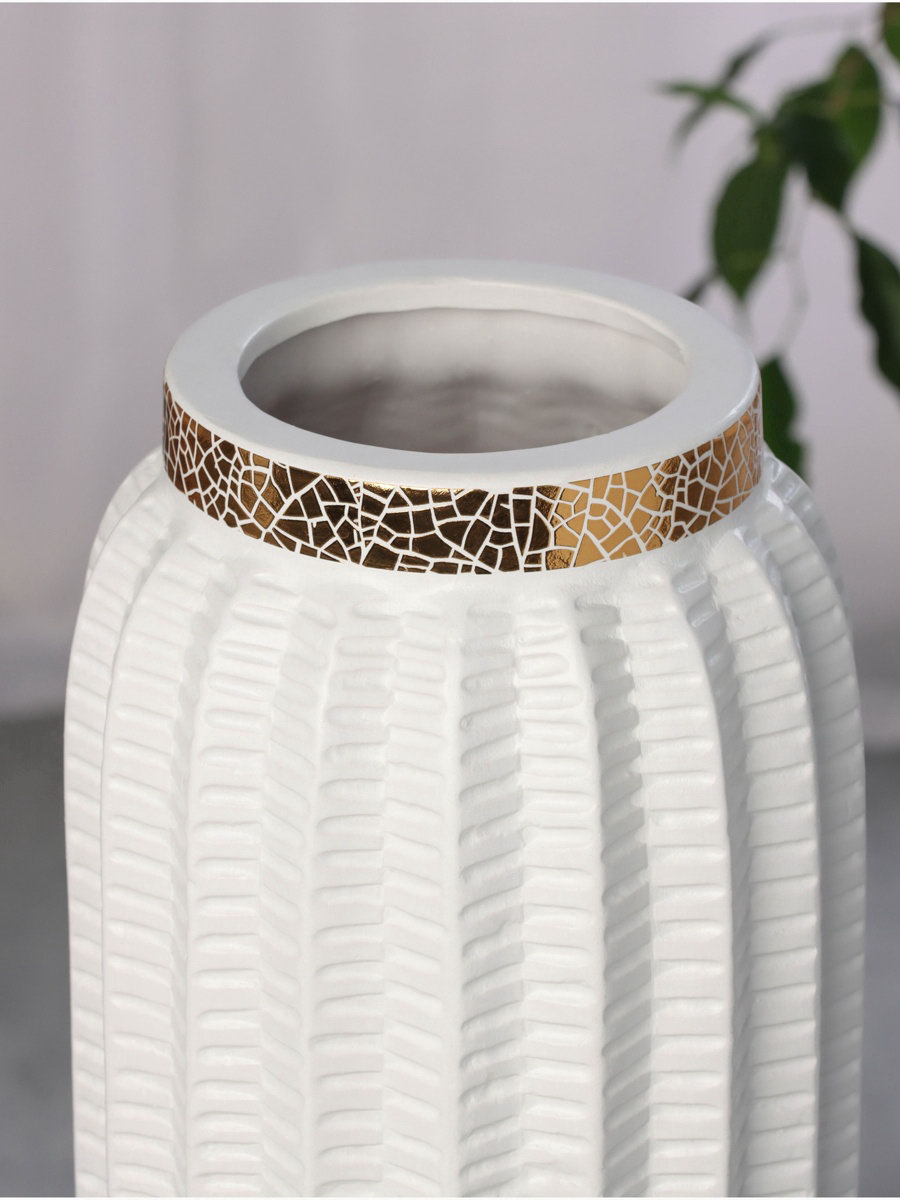 Размер упаковки: 18 x 18 x 61 см. Запрет реализации по сегментам: 00000000272 Высота, см: 59 Цвет: Белый Вид вазы: Напольная Высота, мм: 590 Оформление: Декор золотистый tnved: 6913909000 Текстура: С рельефом Эта напольная ваза станет изысканным элементом вашего интерьера, добавляя светлые акценты и современный стиль. С высотой 59 см и рельефным оформлением, она идеально подходит для создания выразительных цветочных композиций или как самостоятельный декор. Преимущества
