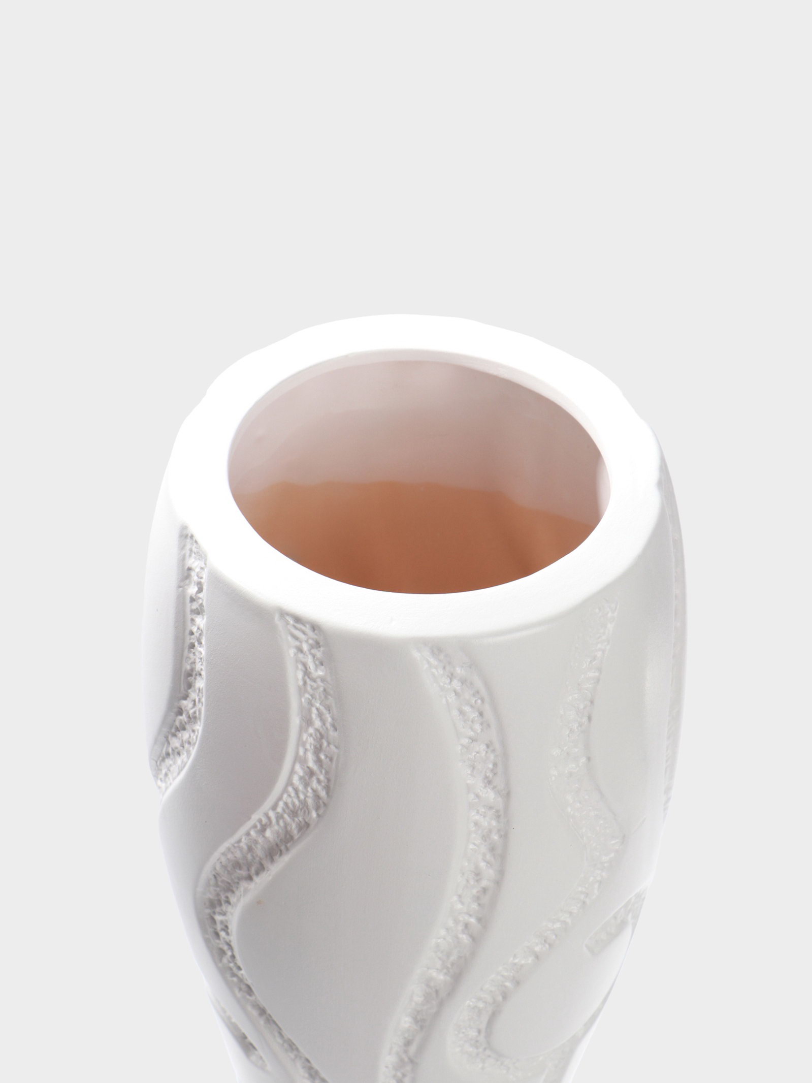 Размер упаковки: 17 x 57 x 17 см. tnved: 6913910000 Запрет реализации по сегментам: 00000000272 Цвет: Белый Высота, см: 56 Вид вазы: Напольная Текстура: С рельефом Строгий силуэт и благородная фактура для современного интерьера. Напольная ваза "Висент" из белой керамики это скульптурный акцент, который придает пространству завершенность и авторский характер. Её лаконичная форма и тактильный рельеф создают игру света и тени, оживляя монохромную палитру.