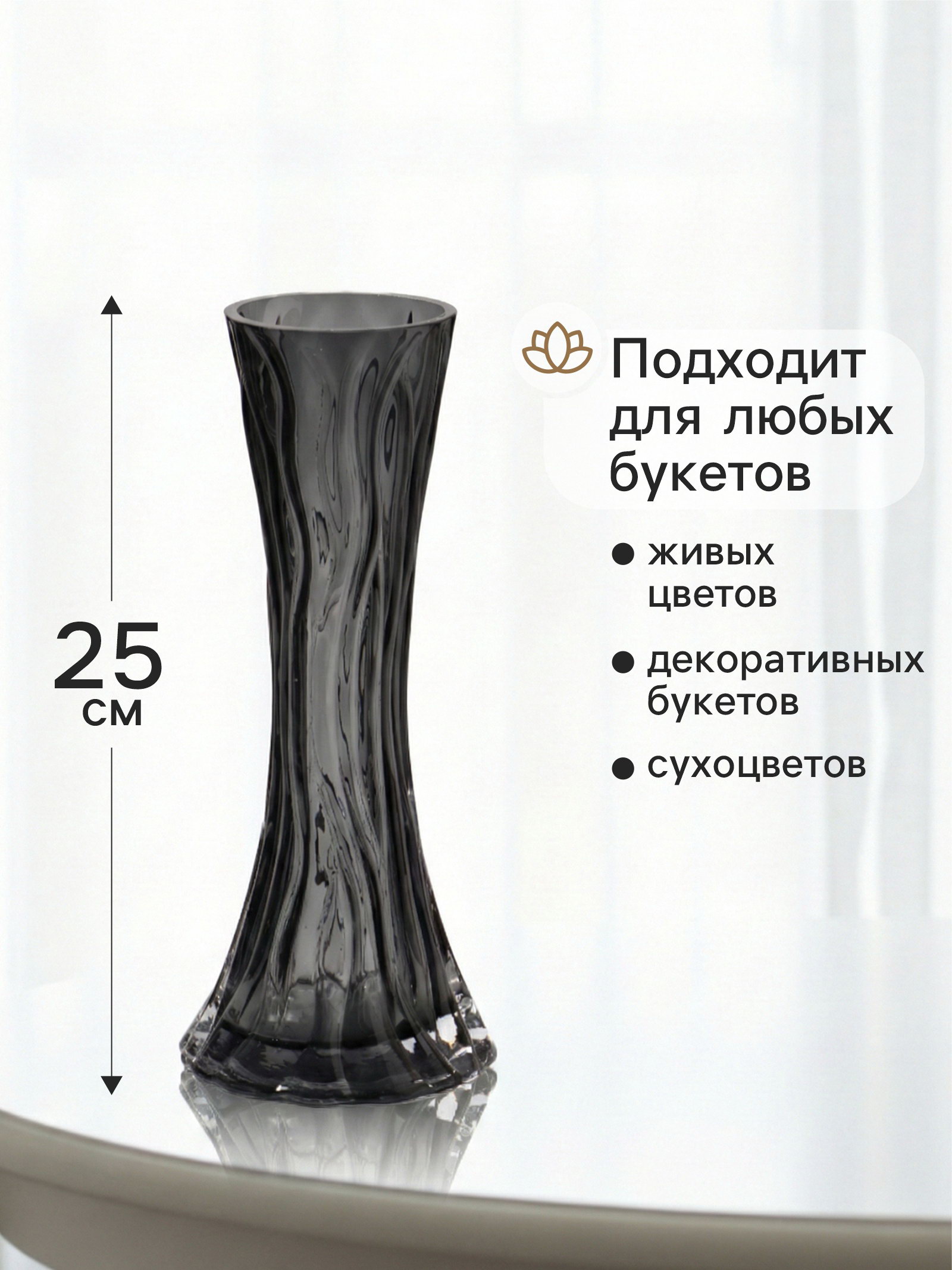 Где и как использовать: Эта стеклянная ваза решает задачу быстрого и стильного обновления пространства. Она одинаково уместна в строгом кабинете, на кухне с полевыми цветами или в гостиной с роскошными розами. Рельефная текстура делает её самодостаточным предметом декора, который не требует постоянного наполнения. Простая, но небанальная форма делает эту модель удачным выбором для подарка она понравится тем, кто ценит лаконичный дизайн и качественные материалы. | ||