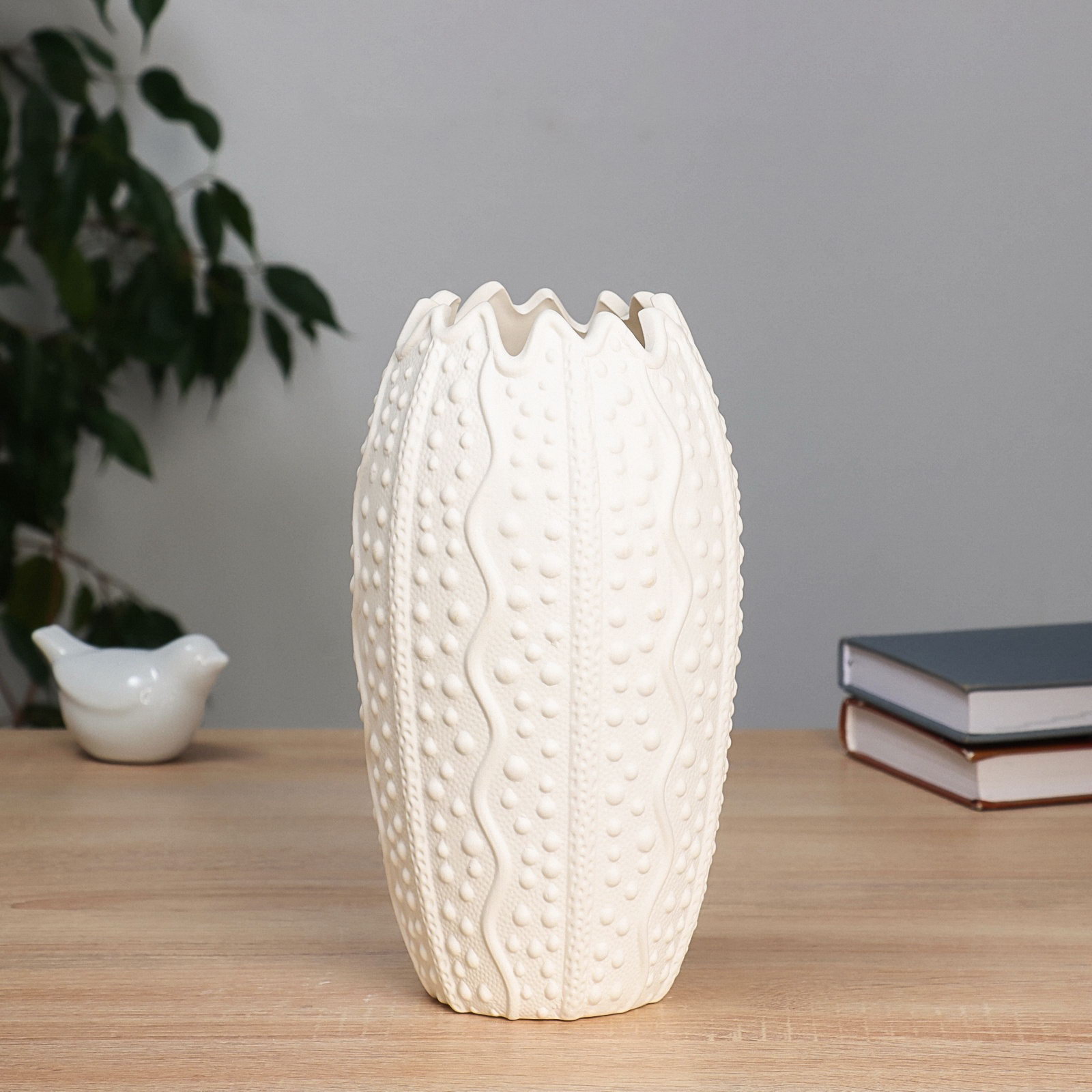 Размер упаковки: 13 x 23 x 13 см. Запрет реализации по сегментам: 00000000272 Цвет: Белый Вид вазы: Настольная Высота, см: 23 tnved: 6913910000 Текстура: С рельефом Высота, мм: 230 Поддержите уют и стиль в вашем доме с настольной вазой, которая станет ярким акцентом на любом столе или полке. Эта керамическая ваза в нежном белом цвете с рельефной текстурой добавит изысканность и элегантность вашему интерьеру, идеально сочетаясь с живыми или сухими цветами, а также простым декором. Преимущества