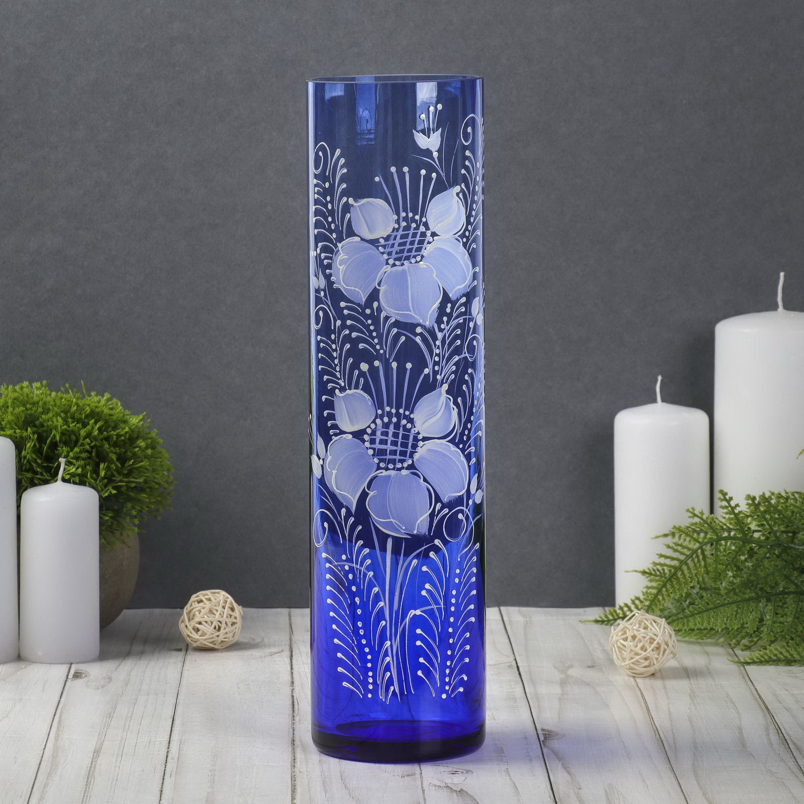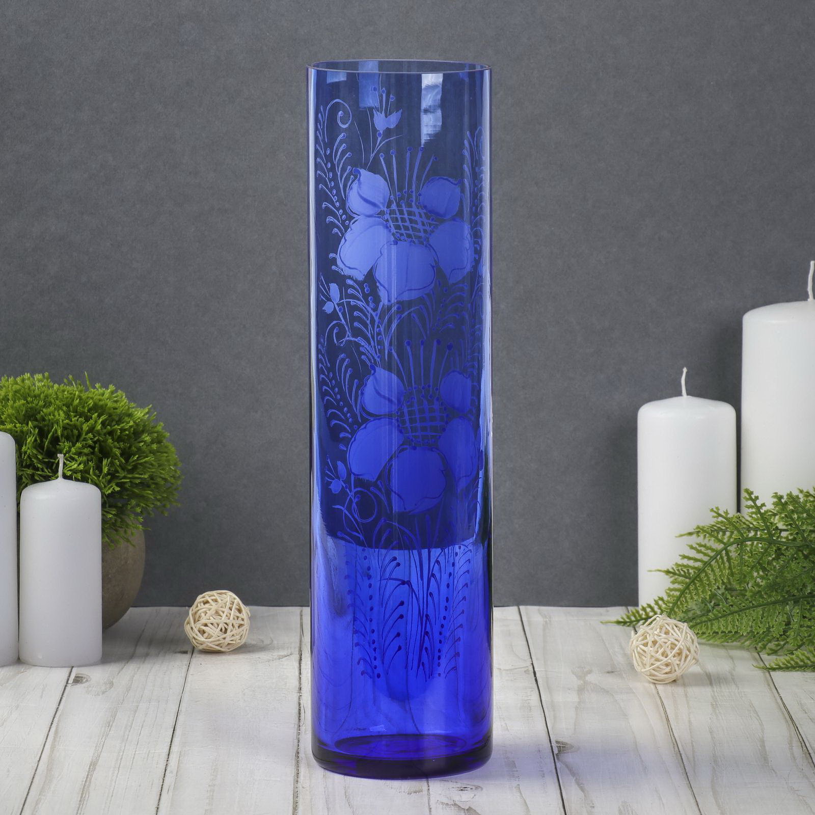 Ваза "Цилиндр", h=30 см, d=8 см, стекло, ручная роспись, синяя, 8x8x30 см., Россия