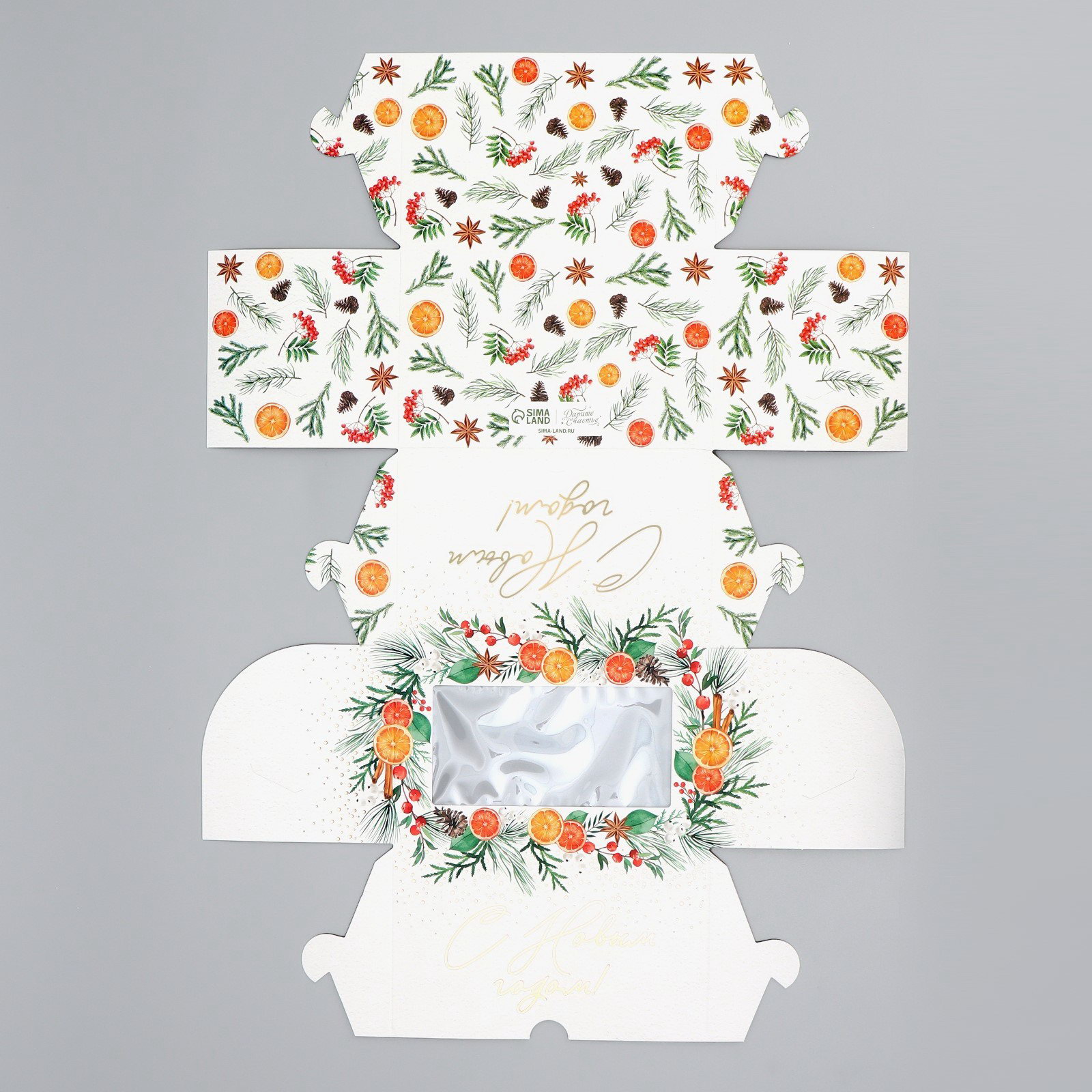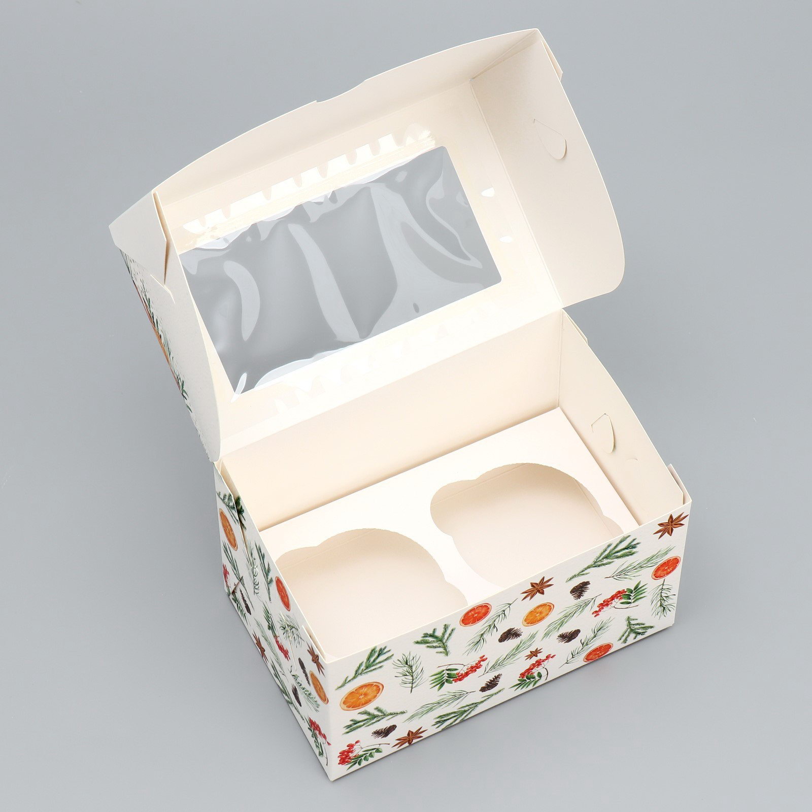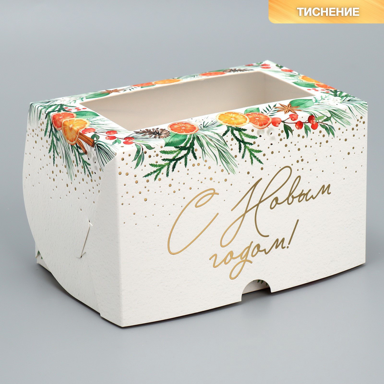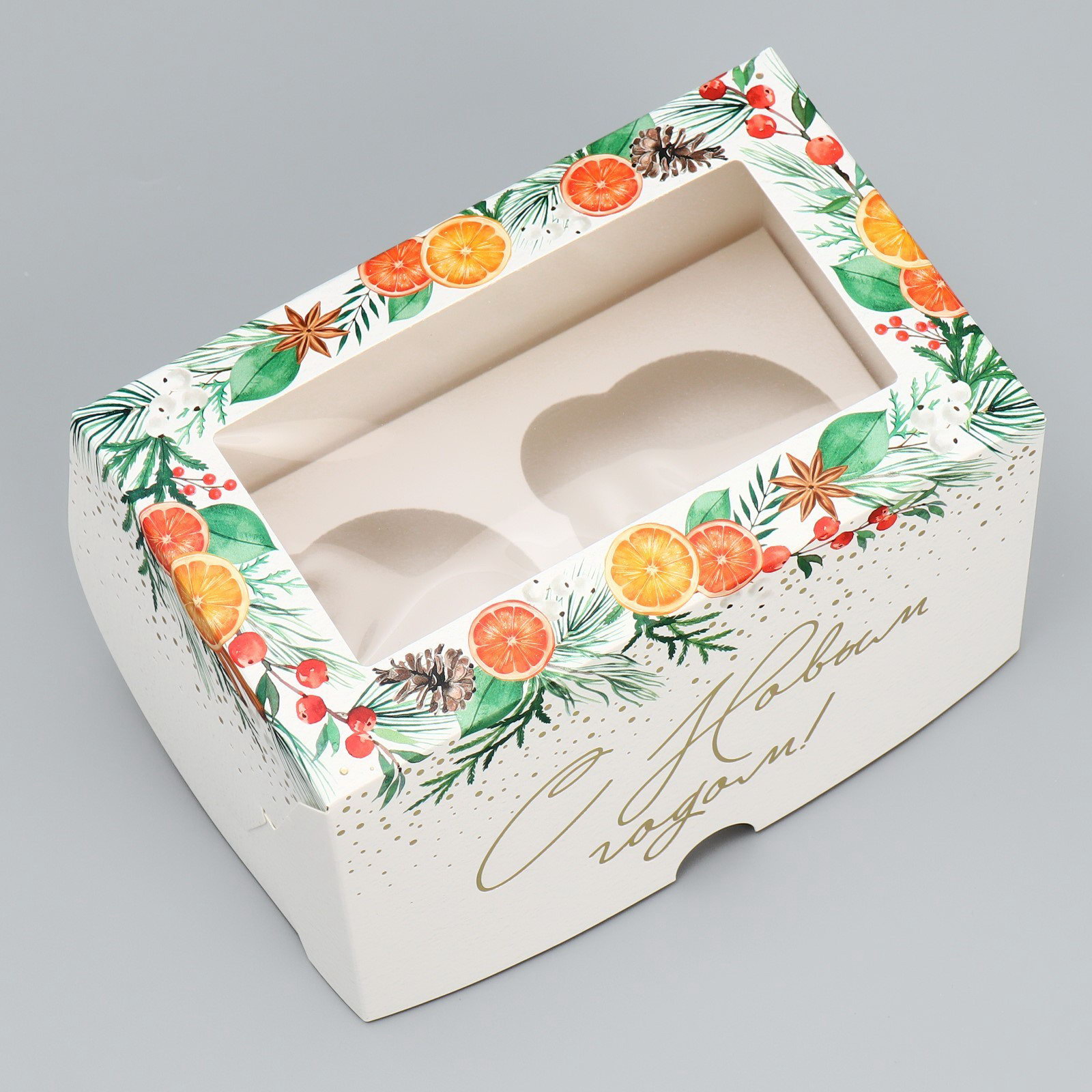 Коробка складная на 2 капкейка с окном "С Новым годом!", мандарины, 10x16x10 см, 16x10x10 см., Дарите Счастье, Китай