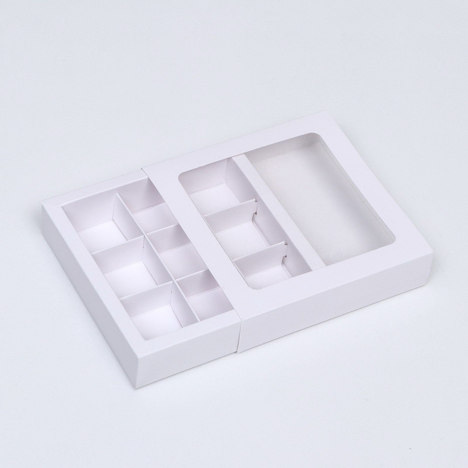 Коробка под 9 конфет с обечайкой, с окном, с тонкими разделителями, белый 14.7x14.7x3.4 см, UPAK LAND, Россия