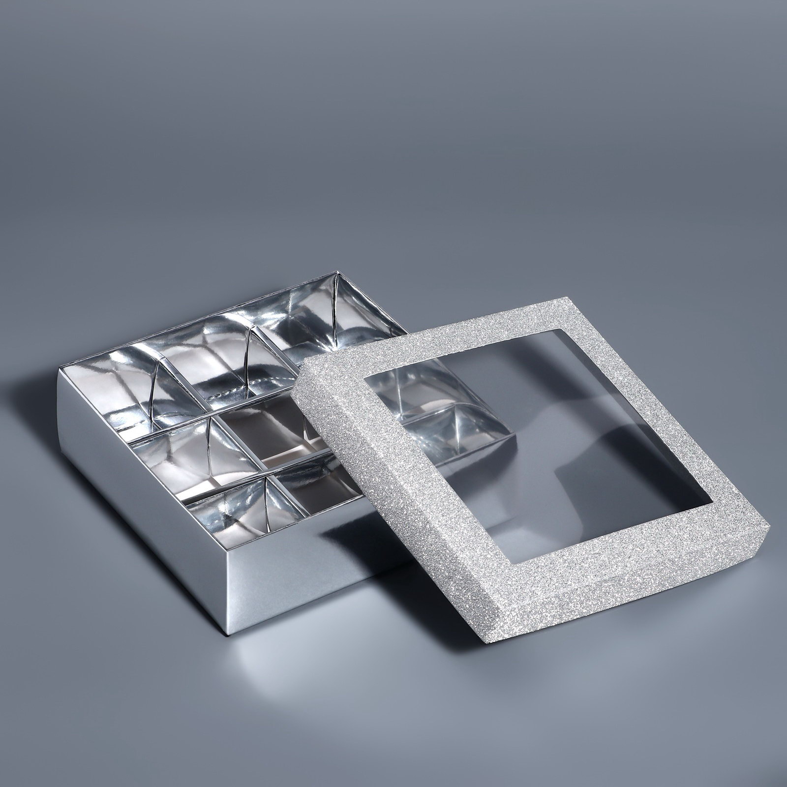 Коробка для 9 конфет серебро глиттер, 12.5x12.5x4 см Кондитерская упаковка, 12.5x12.5x4 см., UPAK LAND, Китай