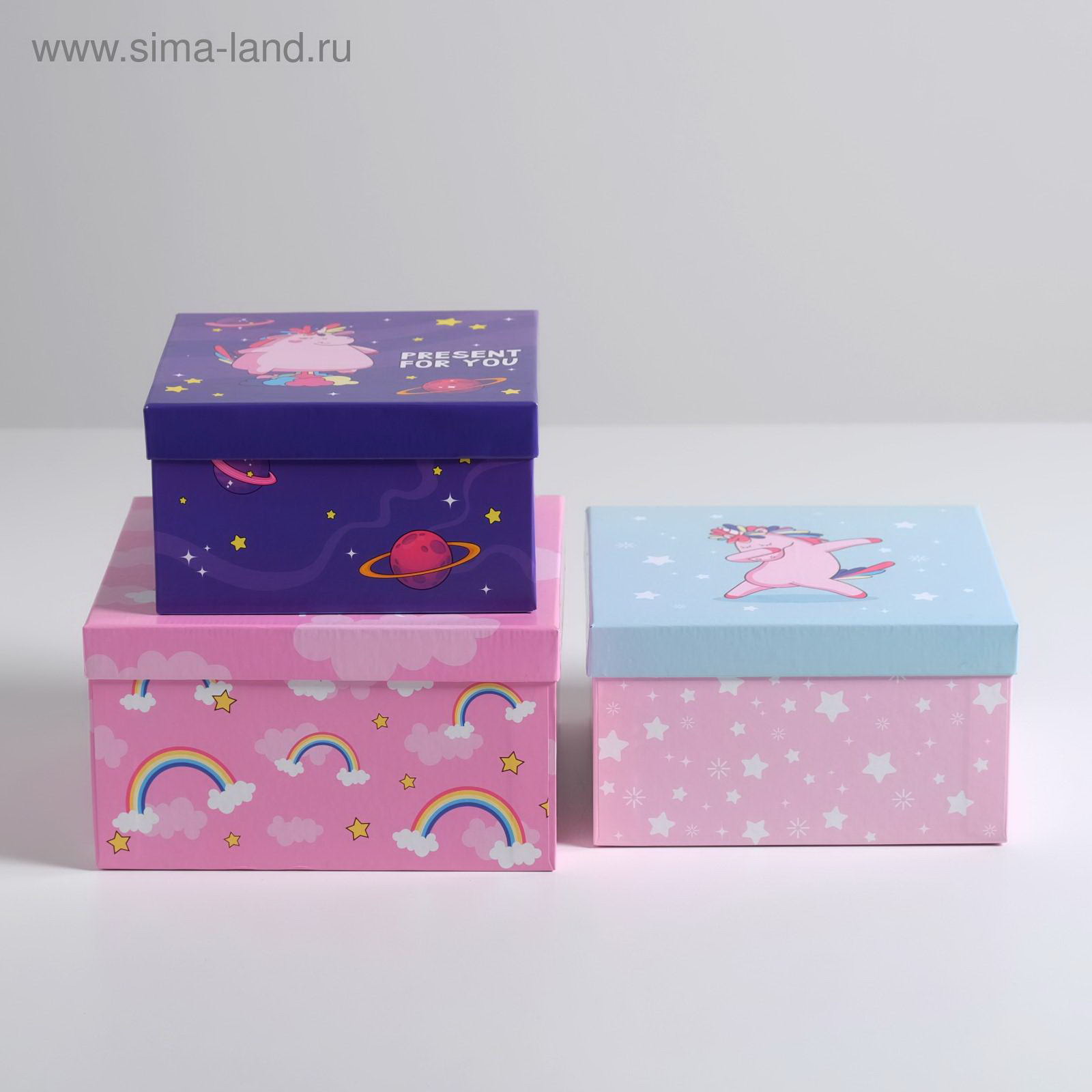 Тематика: Детская, Сказочные животные Цвет: Розовый, Фиолетовый Размер упаковки: 22.5 x 22.5 x 12.5 см. Плотность, г/?2: 1000 Толщина, мм: 1.5 Толщина, мм: 1.5 tnved: 4811900000 Форма: Квадратная Тематика праздника: Универсальная тематика Количество вложений в наборе: 3 в 1 Длина большей коробки, см: 22 Высота большей коробки, см: 12 Ширина большей коробки, см: 22 Температурное ограничение: Нет Вид: Наборы коробок Декоративные элементы: Без декора Размер: Средний (18-24 см) см