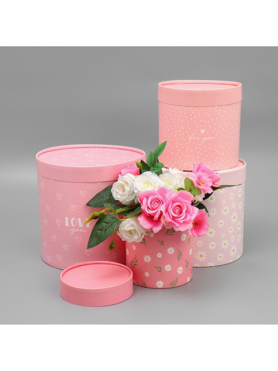 Набор шляпных коробок 4 в 1, упаковка подарочная, "Ромашки", 12 x 12 x 12 - 20 x 20 x 20 см, Дарите Счастье, Россия