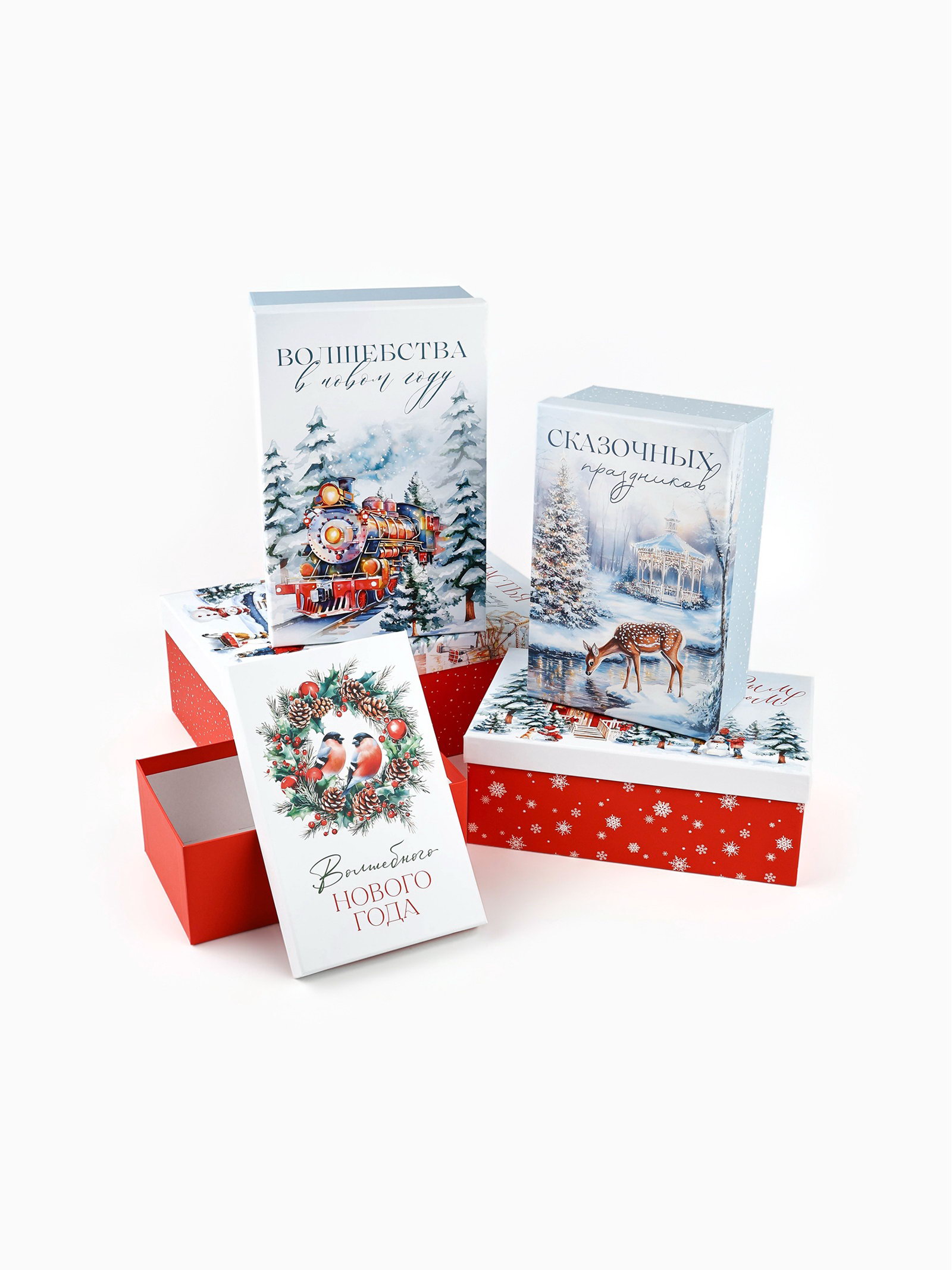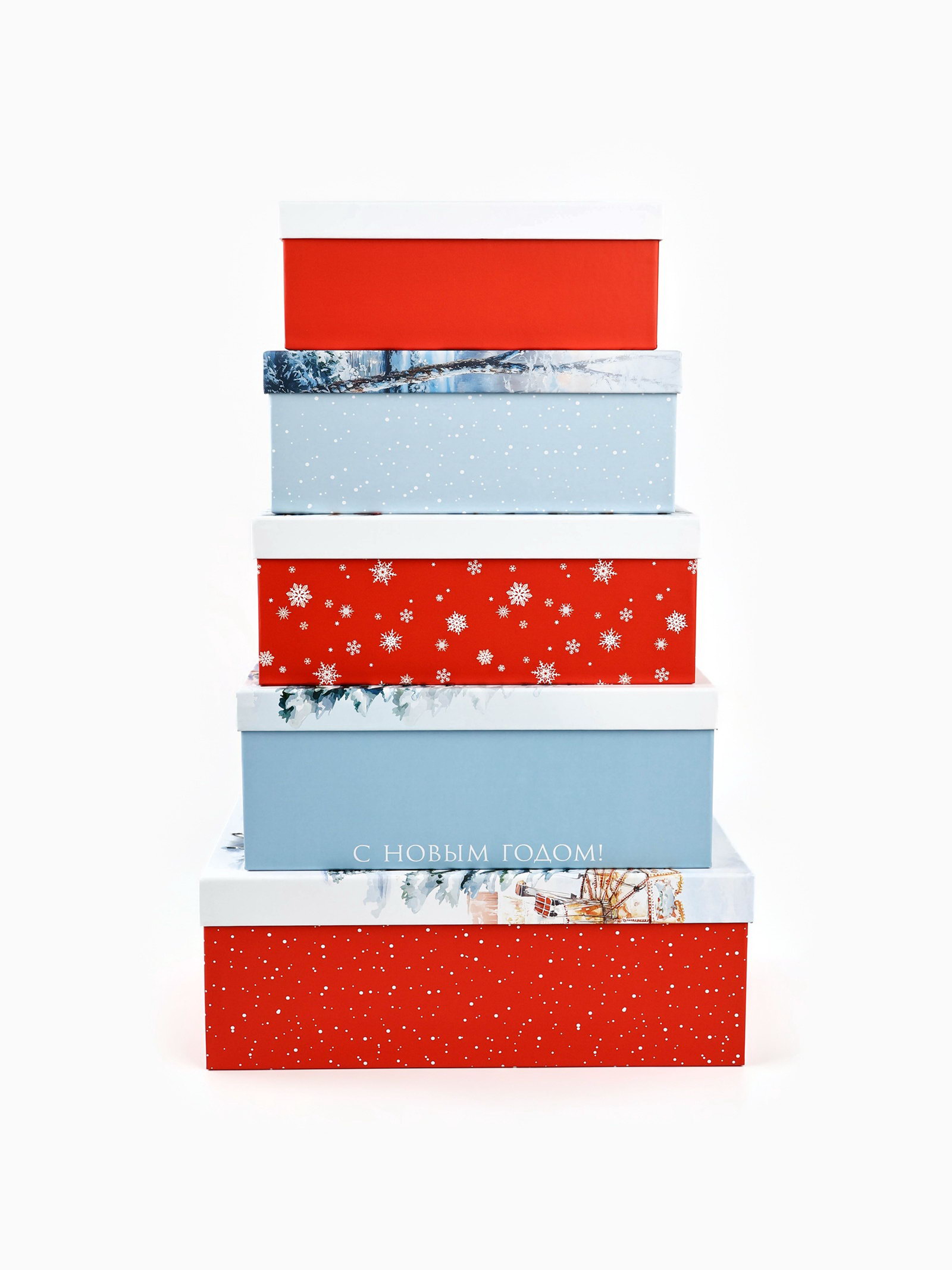 Набор подарочных коробок 5 в 1 "Сказочная новогодняя акварель", 32.5x20x12.5 - 22x14x8.5 см, Дарите Счастье, Россия