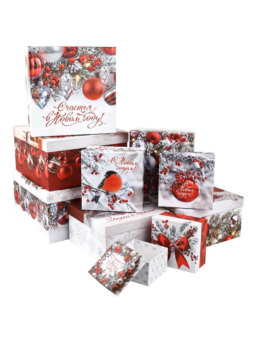 Набор подарочных коробок 10 в 1 "Счастливого Нового года", 10x10x6–28x28x15 см, Дарите Счастье, Россия
