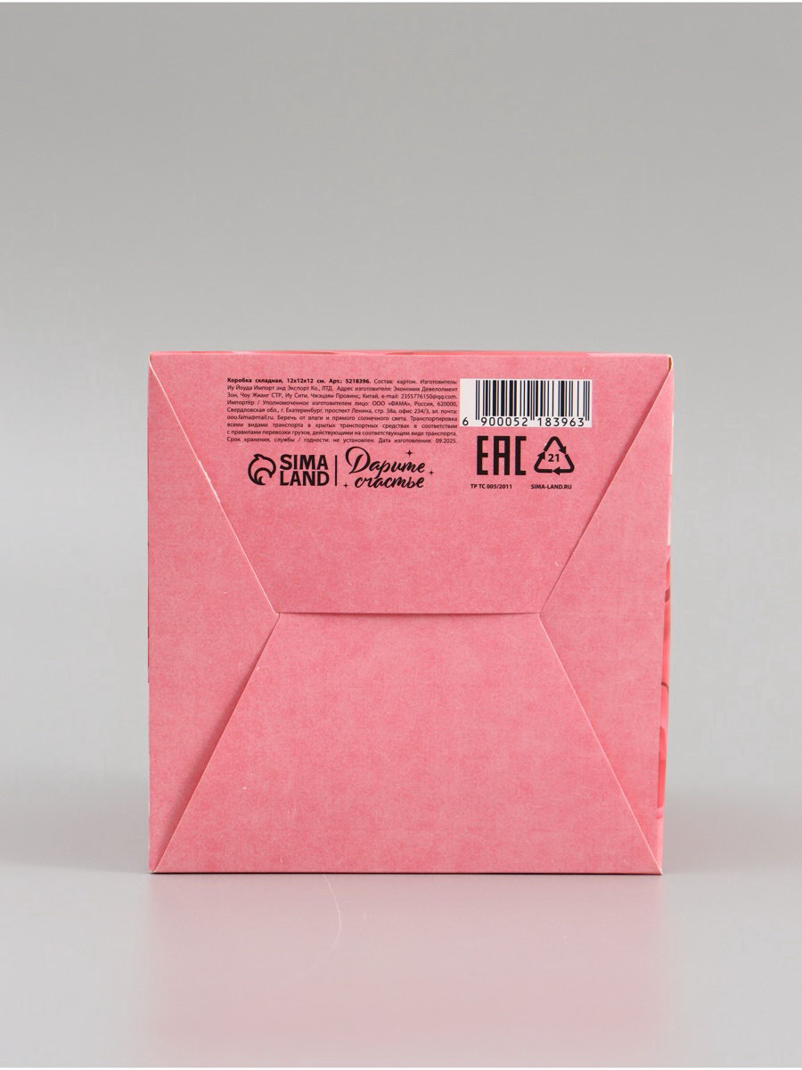 Размер упаковки: 24 x 28 x 0.1 см. Крышка-дно: Нет Окошко: Нет tnved: 4819200000 Для кого: Для женщины Набор: Нет Дизайн: С рисунком, надписью Вид: Складные коробки Тематика праздника: 8 Марта Цвет: Розовый Тематика: Цветочно-растительная Размер: Малый (11-17 см) см Форма: Куб Плотность, г/?2: 250 Температурное ограничение: Нет Высота, см: 12 Длина, см: 12 Ширина, см: 12 Допустимый вес вложения, г: 350 | ||