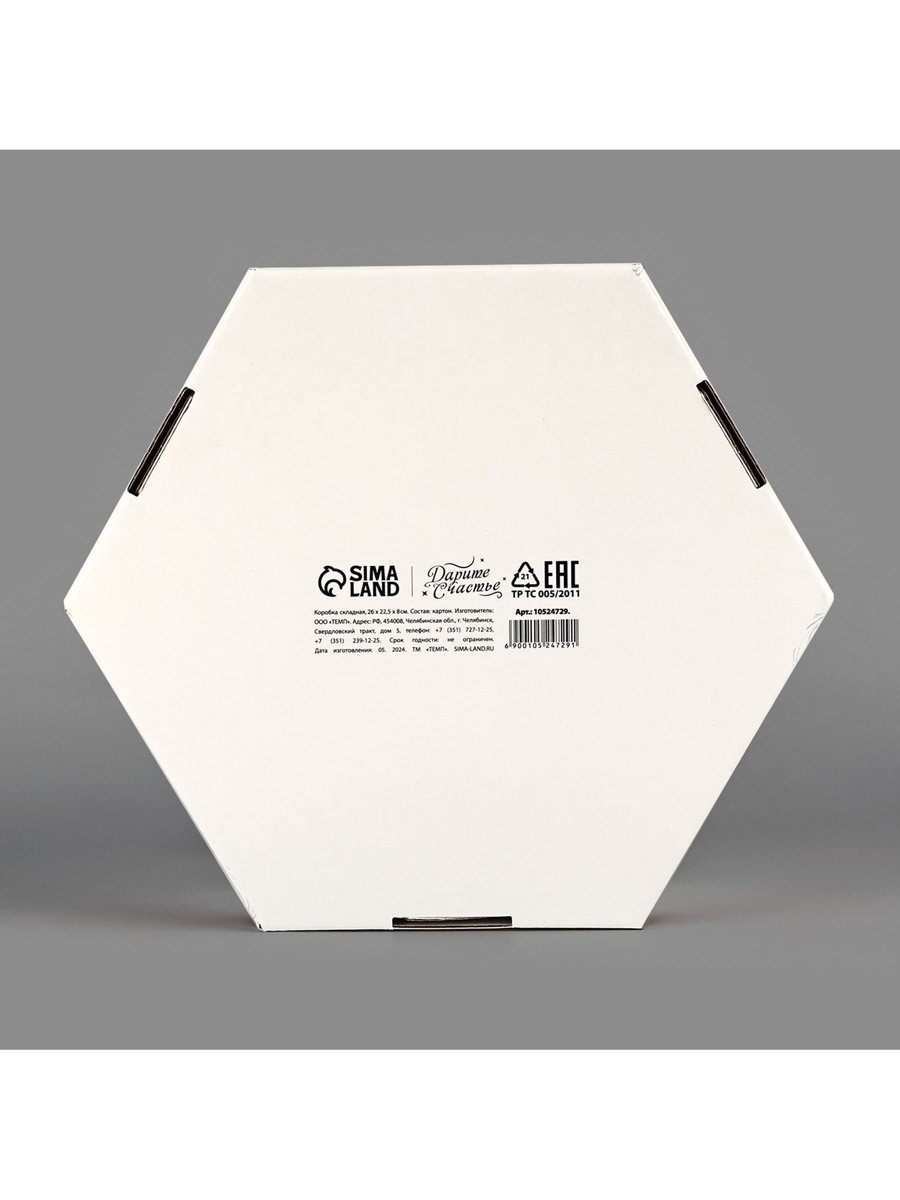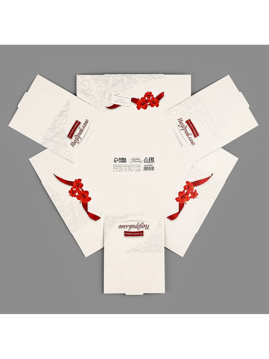 Цвет: Белый, Красный Тематика праздника: 8 Марта, Универсальная тематика Размер упаковки: 34 x 34 x 0.5 см. Вид: Складные коробки Размер: Большой (25-45 см) см Тематика: Банты Форма: Шестиугольная Высота, см: 8 Длина, см: 26 Ширина, см: 22.5 Крышка-дно: Да Окошко: Нет Окошко: Нет tnved: 4819200000 | ||