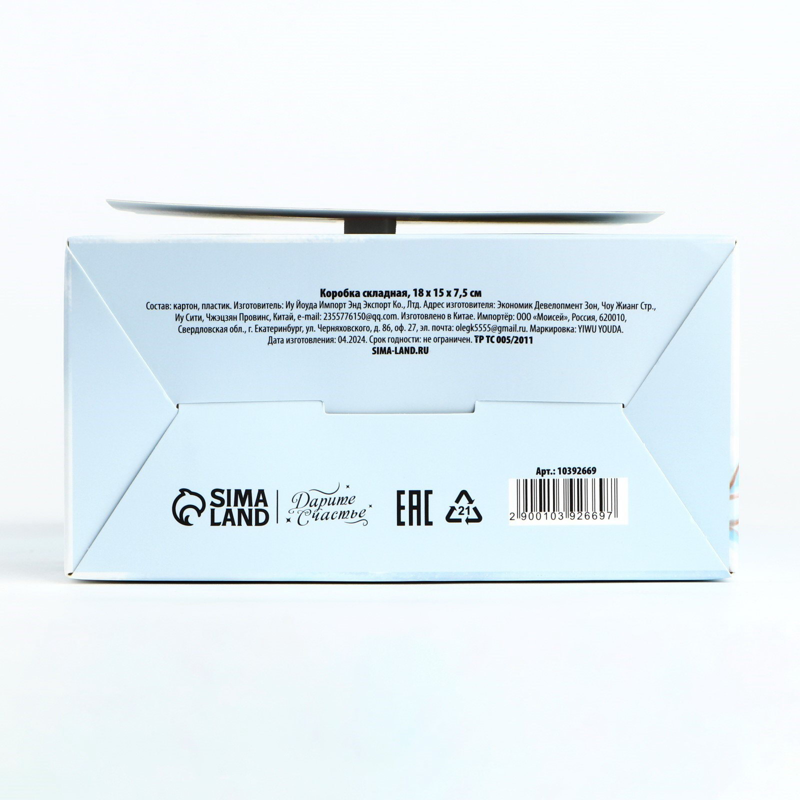 Размер упаковки: 22.5 x 38 x 0.2 см. Символ года: Нет Размер: Средний (18-24 см) см Цвет: Голубой Тематика: Новогодняя Вид: Складные коробки Форма: Прямоугольная Тематика праздника: Новый год Плотность, г/?2: 250 Ширина, см: 7.5 Длина, см: 15 Высота, см: 18 Крышка-дно: Нет Окошко: Да tnved: 4819200000 tnved: 4819200000 | ||