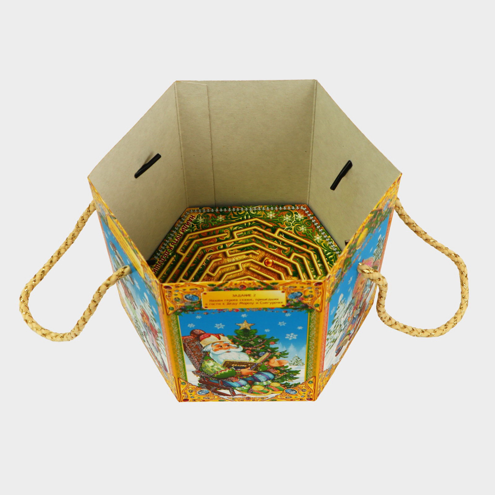 Подарочная коробка новогодняя Шестигранник малый "Время сказок" с веревочными ручками, 210x210x185 мм, Россия