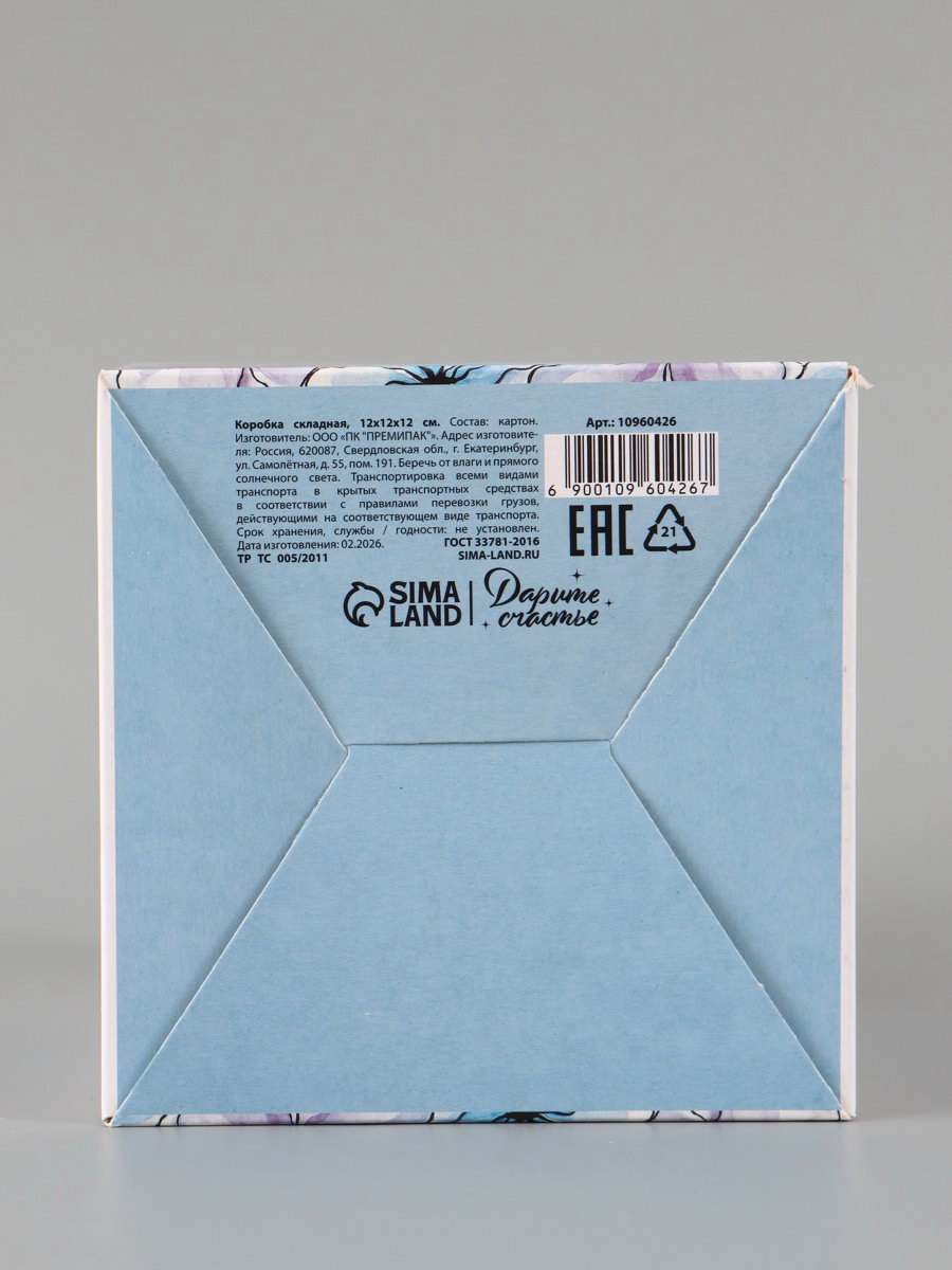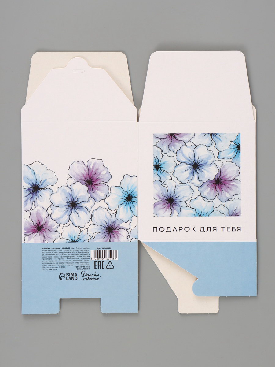 Вид: Квадратные, Складные коробки Размер упаковки: 24 x 27 x 0.2 см. tnved: 4819200000 Допустимый вес вложения, г: 350 Тематика праздника: Универсальная тематика Символ года: Нет Форма: Куб Окошко: Нет Крышка-дно: Нет Ширина, см: 12 Дизайн: С рисунком, надписью Плотность, г/?2: 250 Длина, см: 12 Высота, см: 12 Размер: Малый (11-17 см) см Тематика: Цветочно-растительная Цвет: Белый Подарочная коробка "Акварельные цветы" это упаковка, которая сама выглядит как подарок. Белый куб с мягким цветочным рисунком создаёт настроение ещё до того, как получатель заглянет внутрь.