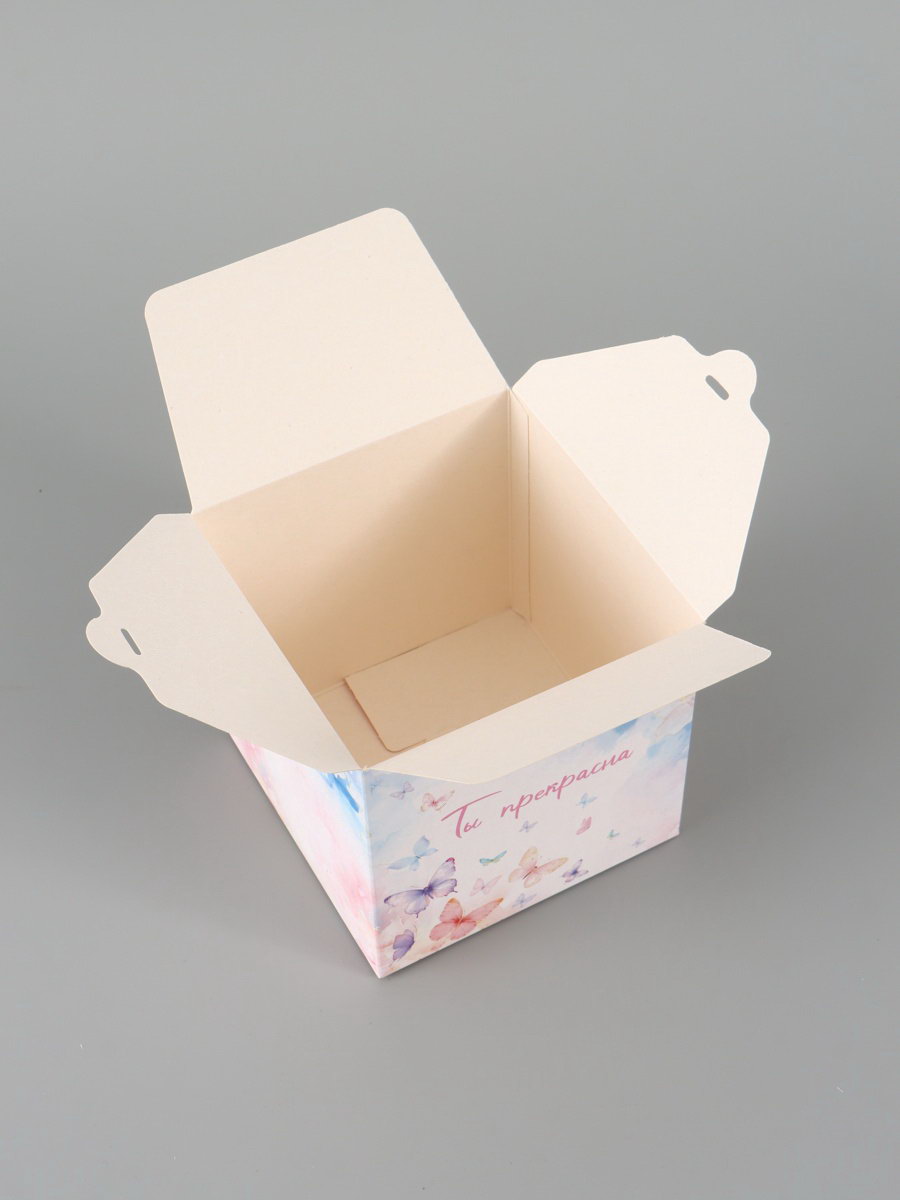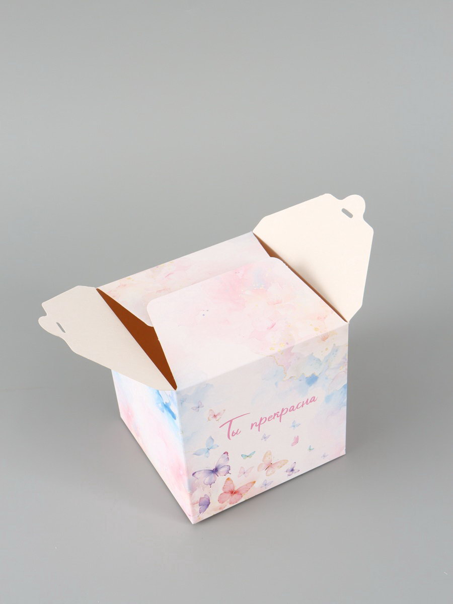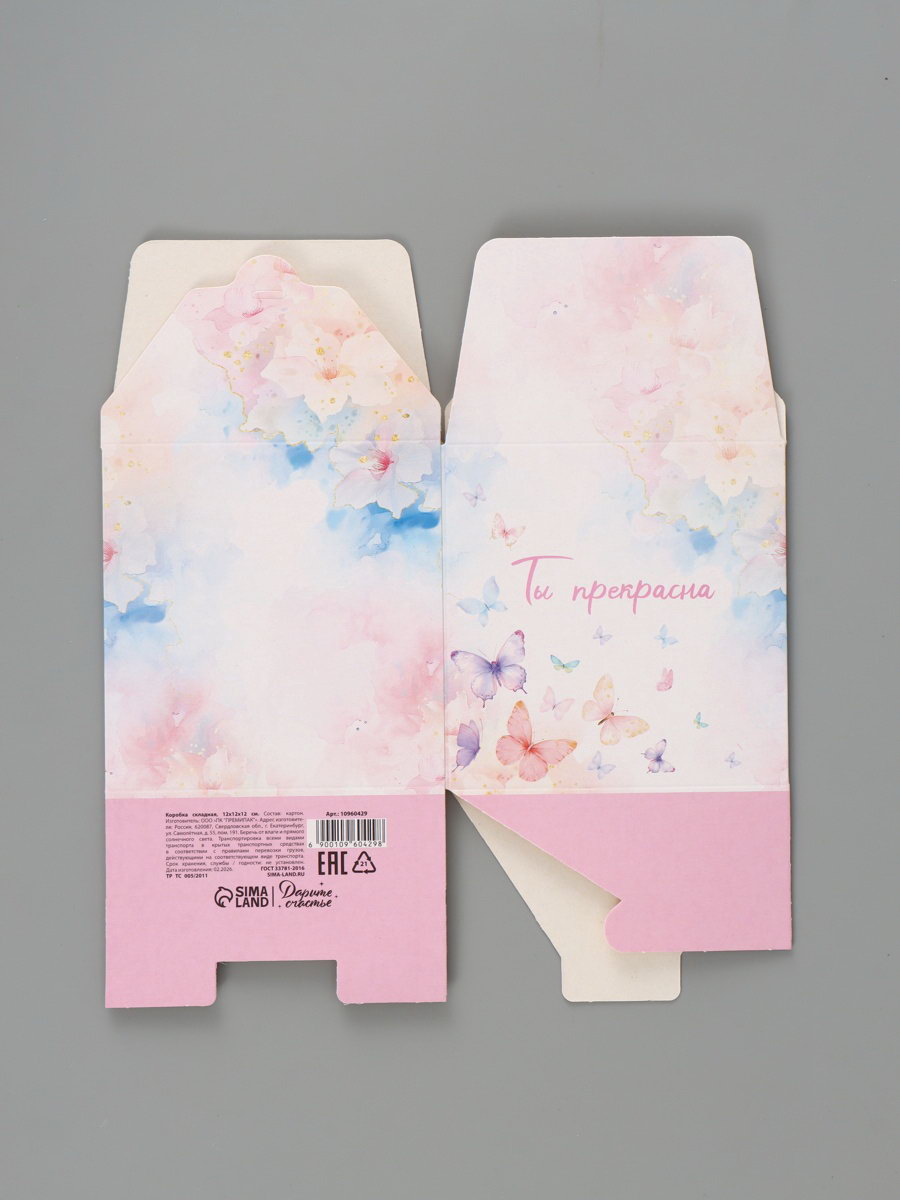 Вид: Квадратные, Складные коробки Тематика: Бабочки, Надписи, цифры, буквы Размер упаковки: 24 x 27 x 0.2 см. tnved: 4819200000 Длина, см: 12 Высота, см: 12 Допустимый вес вложения, г: 350 Плотность, г/?2: 250 Ширина, см: 12 Тематика праздника: Универсальная тематика Символ года: Нет Форма: Куб Окошко: Нет Крышка-дно: Нет Размер: Малый (11-17 см) см Дизайн: С рисунком, надписью Цвет: Разноцветный Подарочная коробка "Ты прекрасна" это упаковка, которая делает комплимент вместо открытки. Спокойный дизайн с бабочками и тёплой надписью создаёт лёгкое настроение ещё до того, как получатель заглянет внутрь.