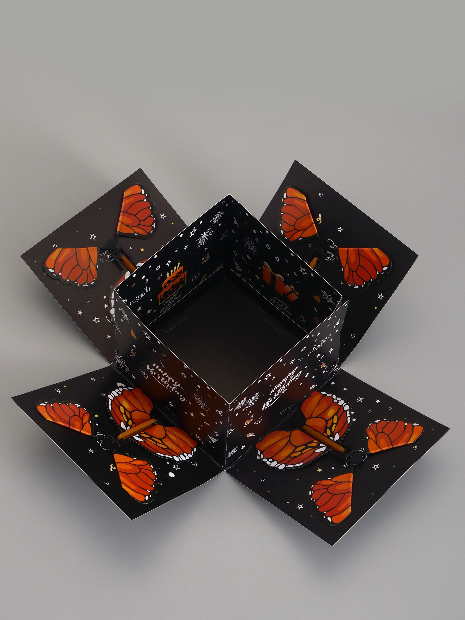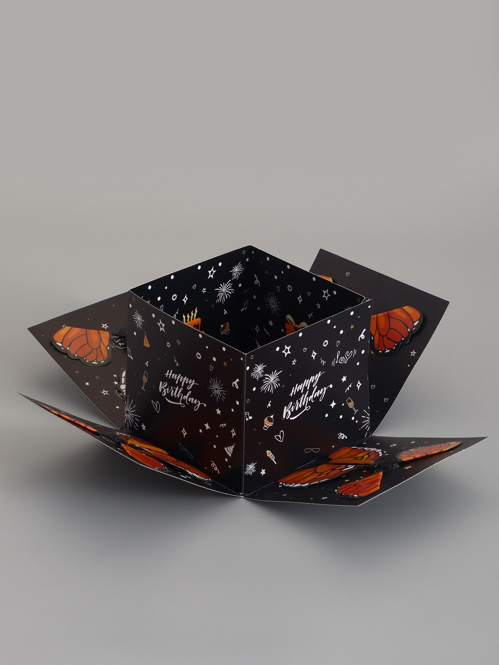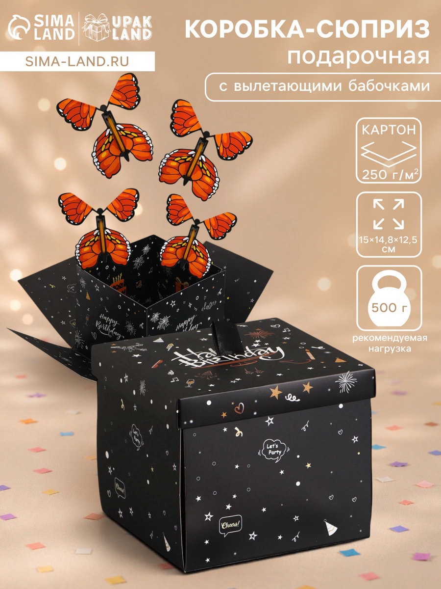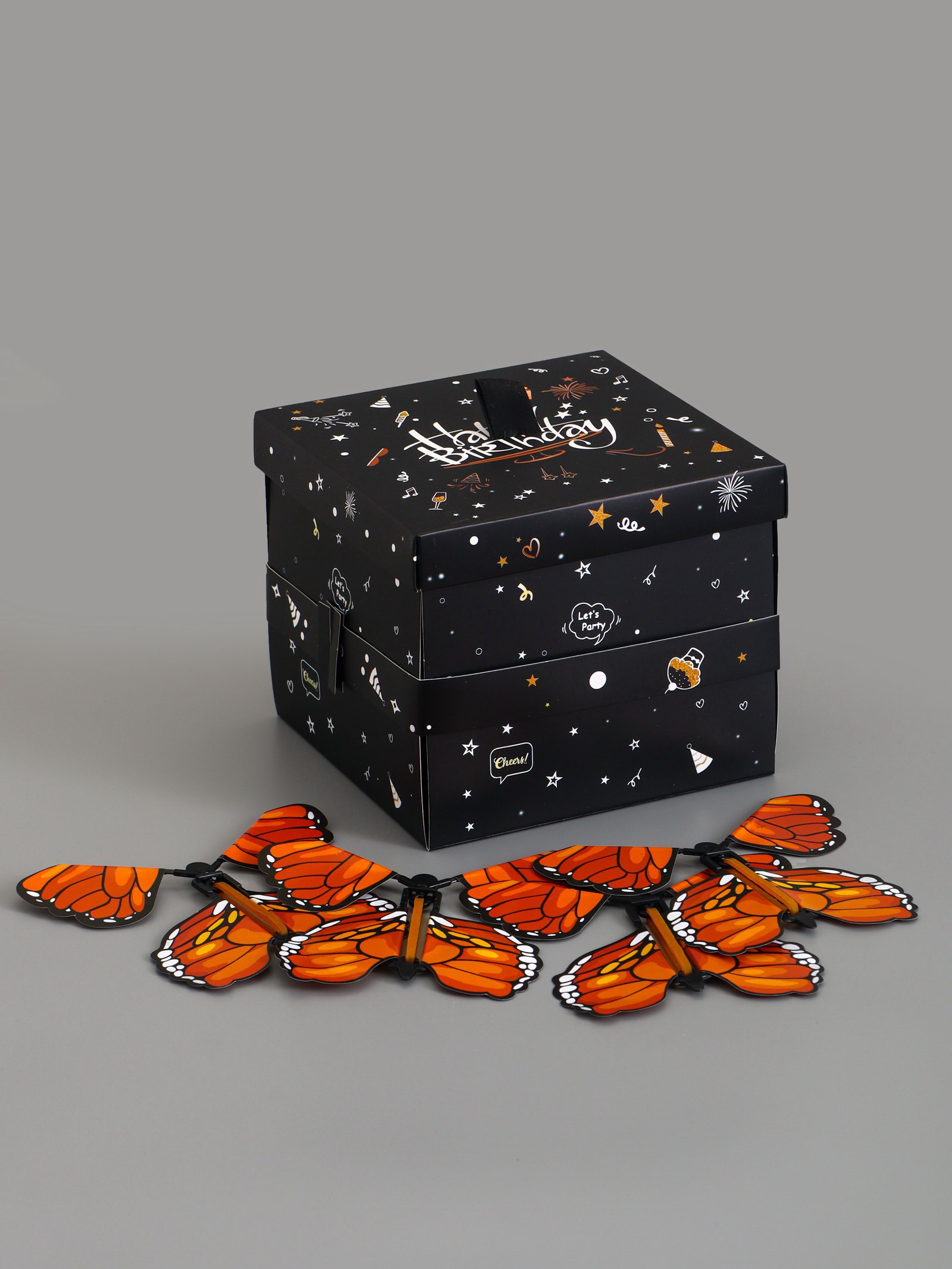 Коробка-сюрприз подарочная "Бабочки, День рождения" чёрная, с вылетающими бабочками, 15x14.8x12.5 см, 14.8x15x12.5 см., UPAK LAND, Китай