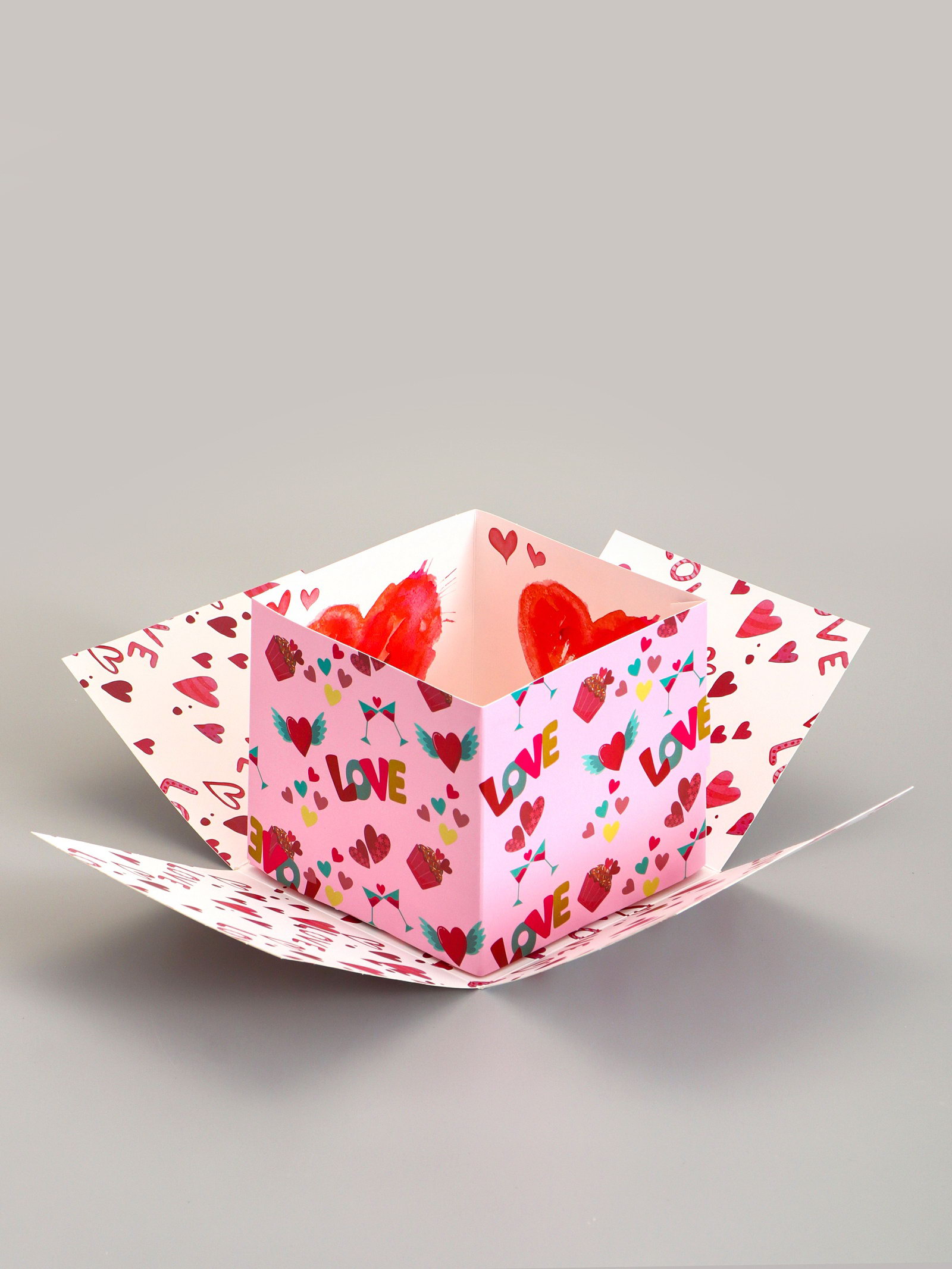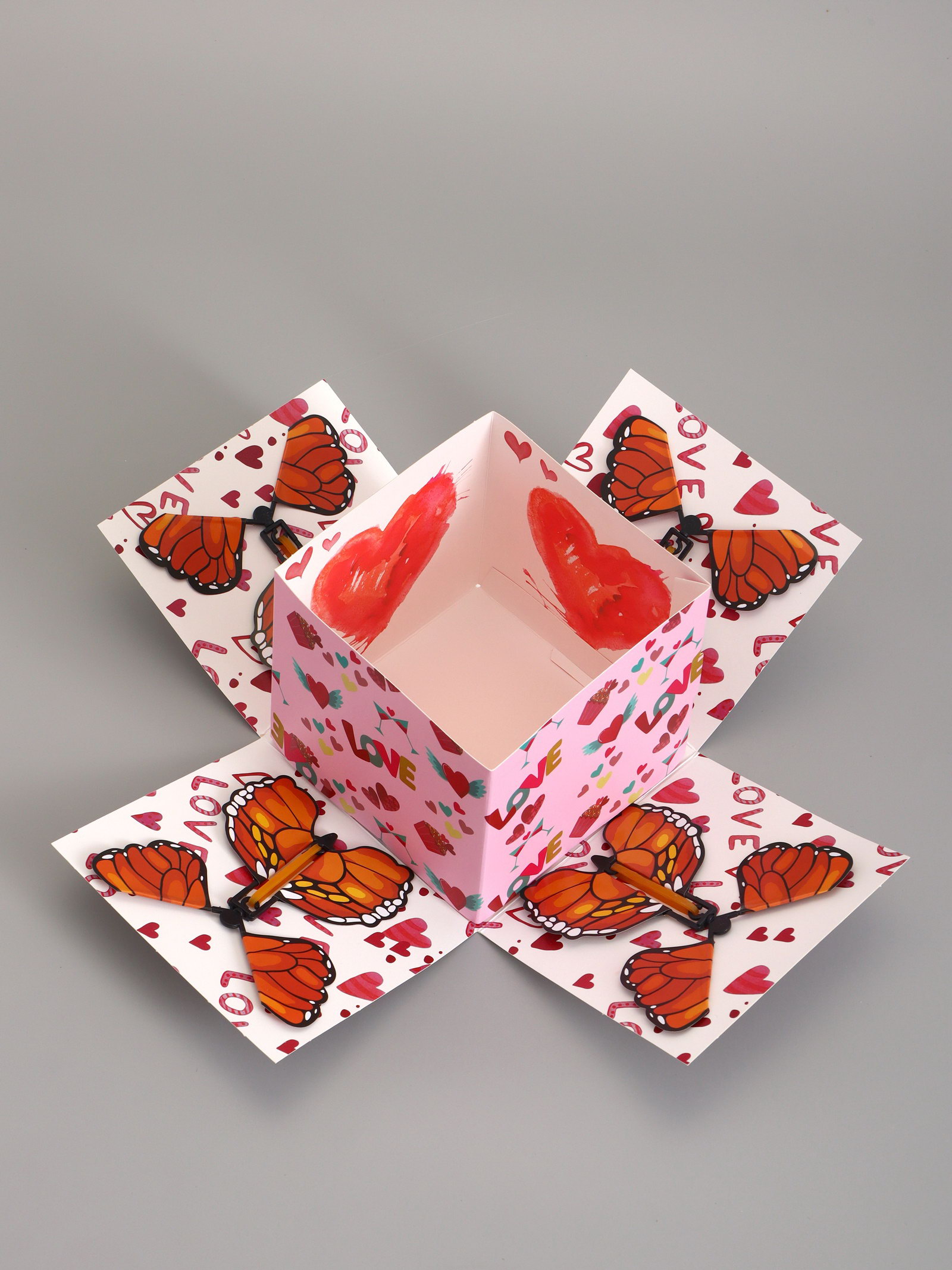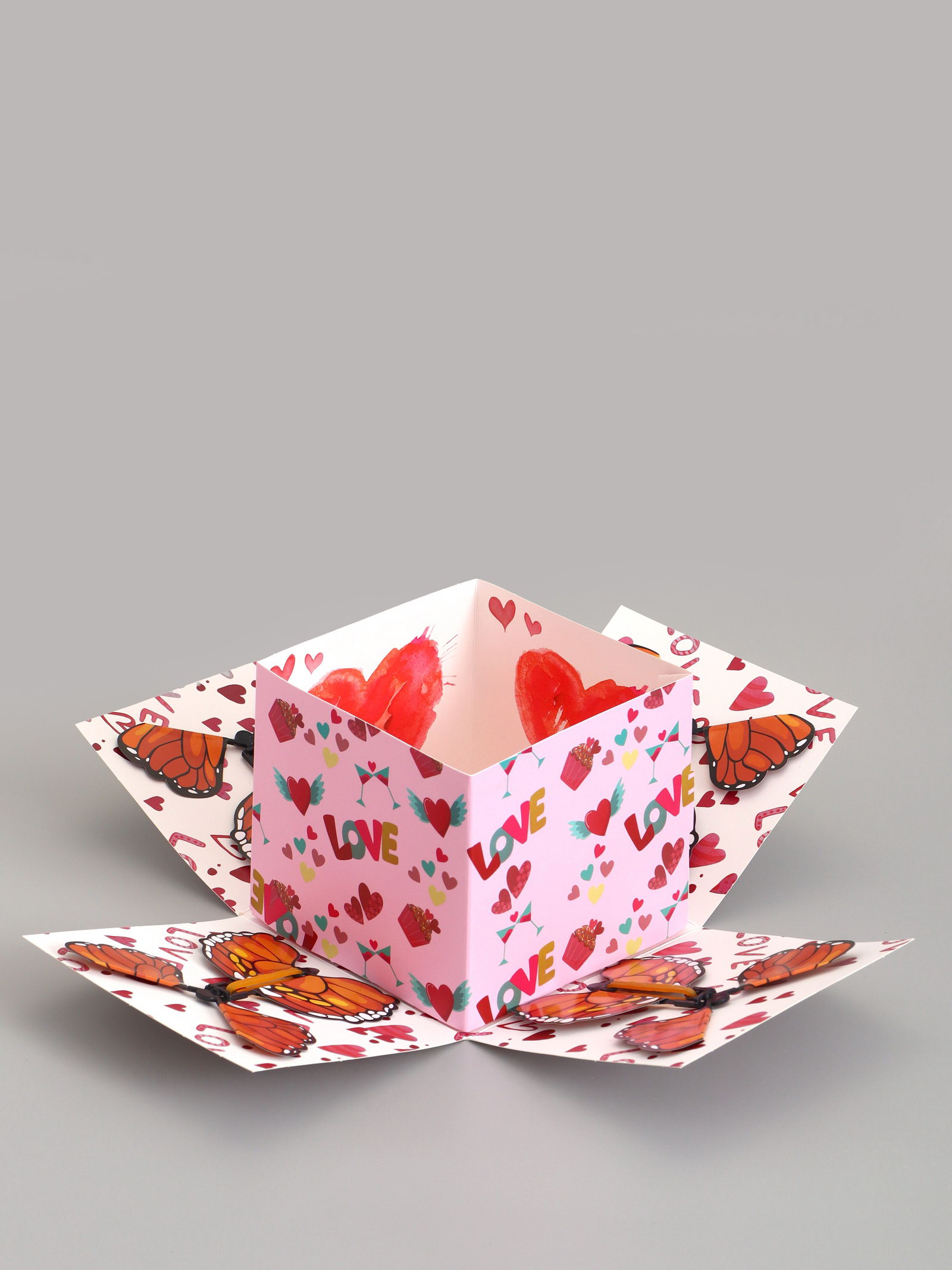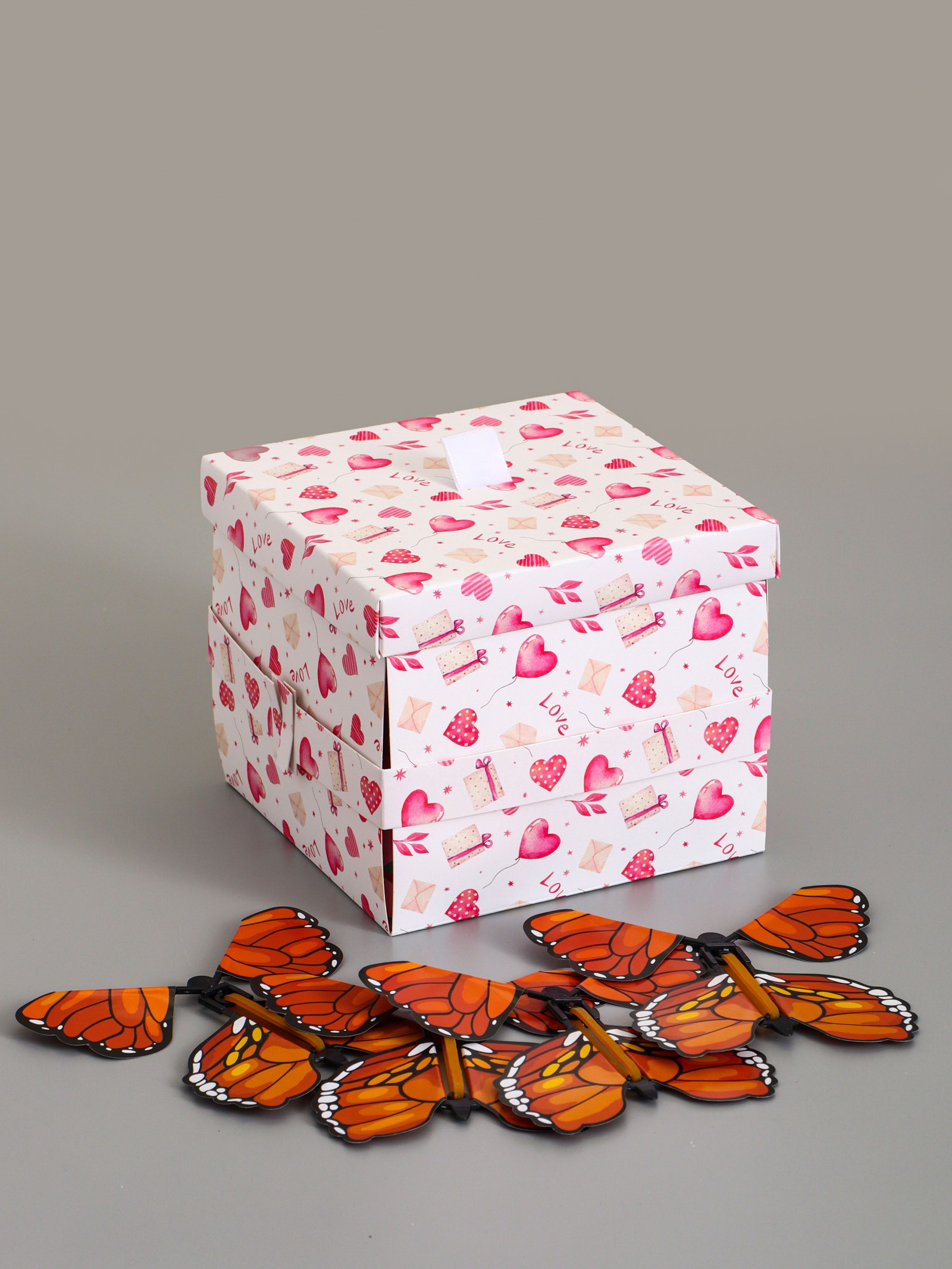 Коробка-сюрприз подарочная "Бабочки, Сердца" розовая, с вылетающими бабочками, 15x14.8x12.5 см, 14.8x15x12.5 см., UPAK LAND, Китай