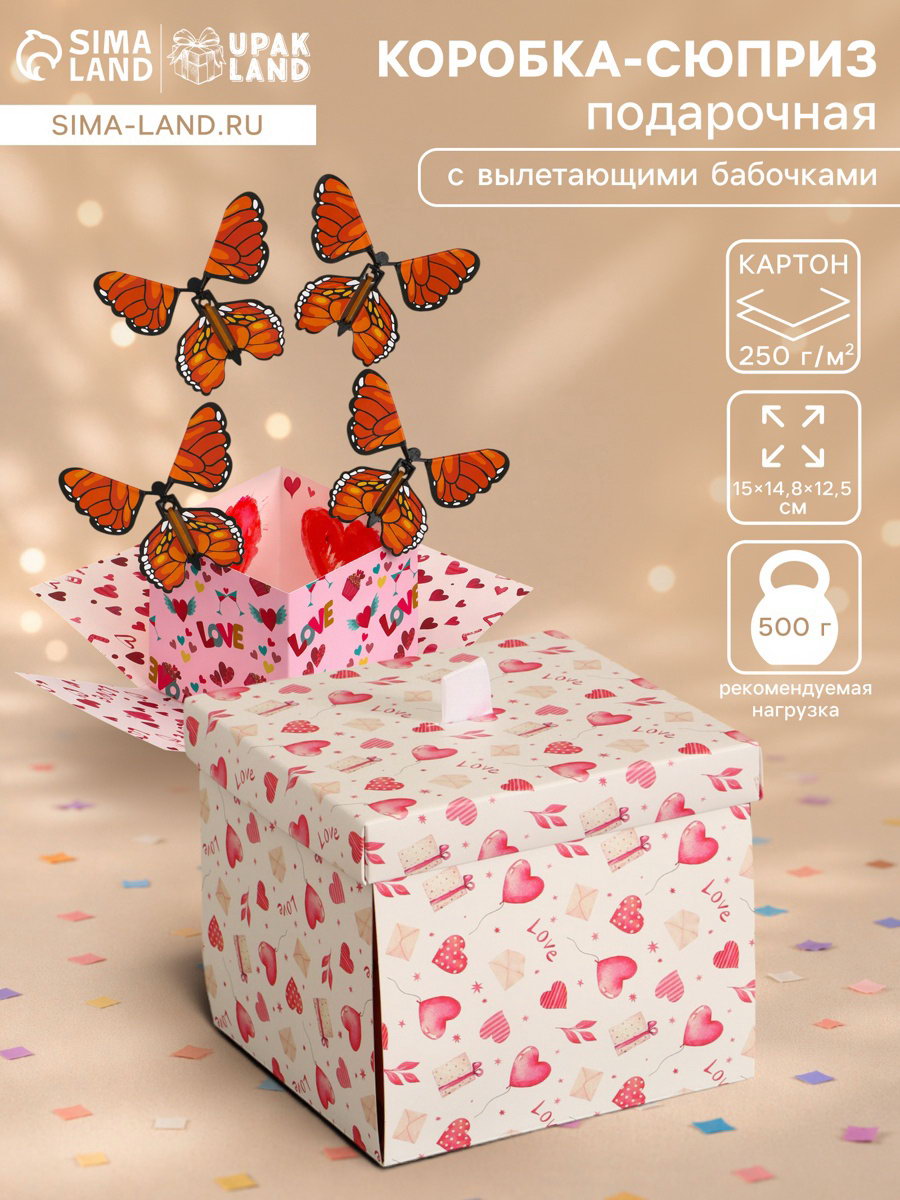 Тематика: Женская, Любовь, Надписи, цифры, буквы, Праздник, С сердечками Тематика праздника: 14 Февраля, Универсальная тематика Вид: Интерактивные, Складные коробки Размер упаковки: 15 x 2 x 15 см. tnved: 4819200000 Крышка-дно: Да Цвет: Розовый Символ года: Нет Размер: Малый (11-17 см) см Дизайн: С рисунком, надписью Ширина, см: 15 Допустимый вес вложения, г: 500 Плотность, г/?2: 250 Высота, см: 12.5 Длина, см: 14.8 Окошко: Нет Форма: Квадратная Розовая коробка-сюрприз "Бабочки, Сердца" с вылетающими бабочками (15x14.8x12.5 см) – это нежная и романтичная подарочная упаковка с интерактивным эффектом, которая превращает вручение подарка в трогательное и запоминающееся событие. При открытии крышки из коробки вылетают лёгкие бабочки, создавая эффект неожиданности и вызывая искренние эмоции радости и восторга. Такой формат подачи усиливает впечатление от подарка и делает его по-настоящему особенным.