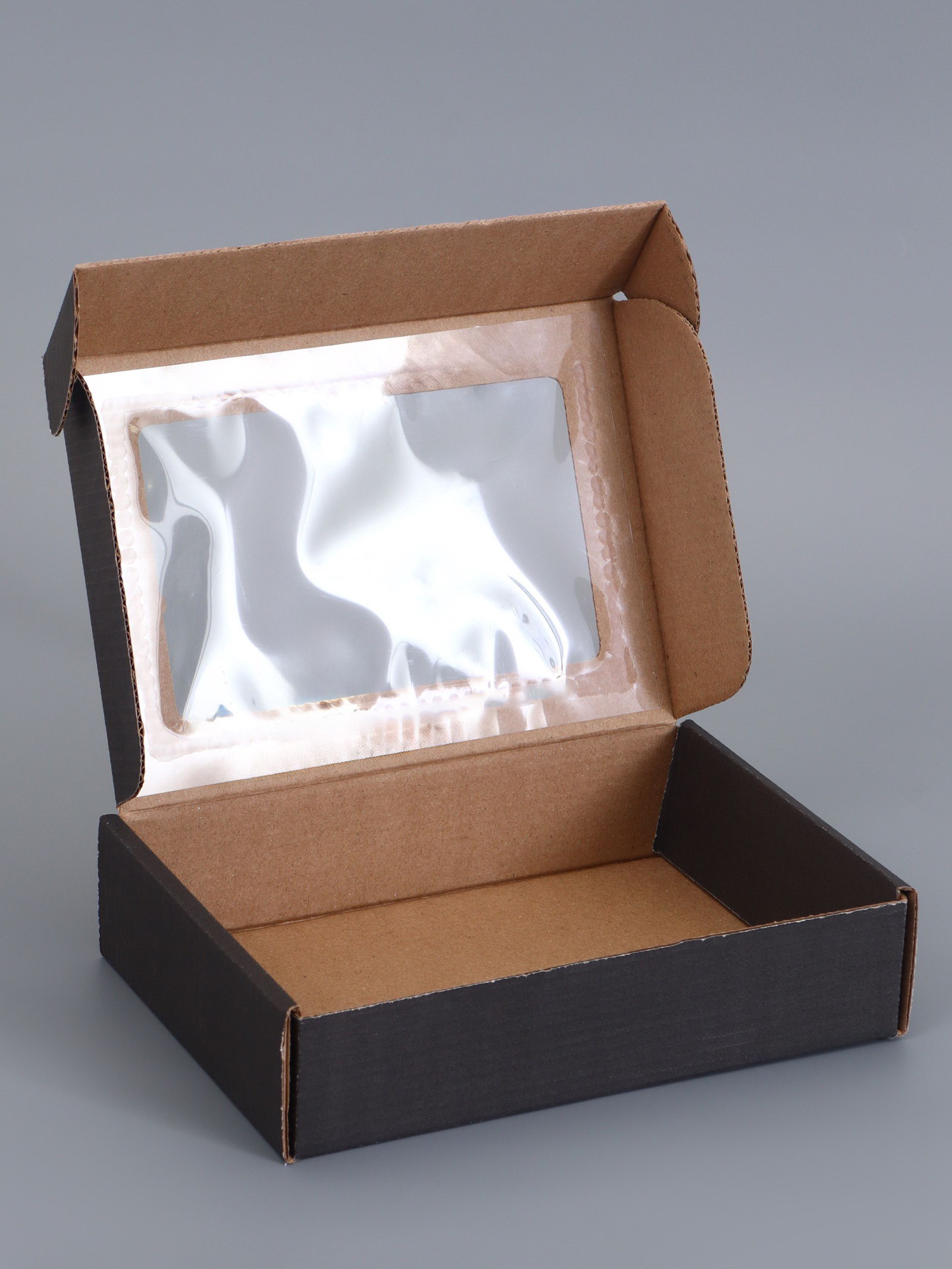 Для подарков, склада и отправок Эта чёрная коробка с окном решает три задачи: показывает товар, защищает его и экономит место на полке. Берите для упаковки ювелирных изделий, мерча, сувениров или сладких наборов. Для хранения сложите внутри провода, зарядки, бижутерию. Для отправки заклейте скотчем, и коробка выдержит стандартные нагрузки перевозки. Микрогофрокартон не размокает от конденсата, не пахнет клеем, не оставляет следов на содержимом. | ||