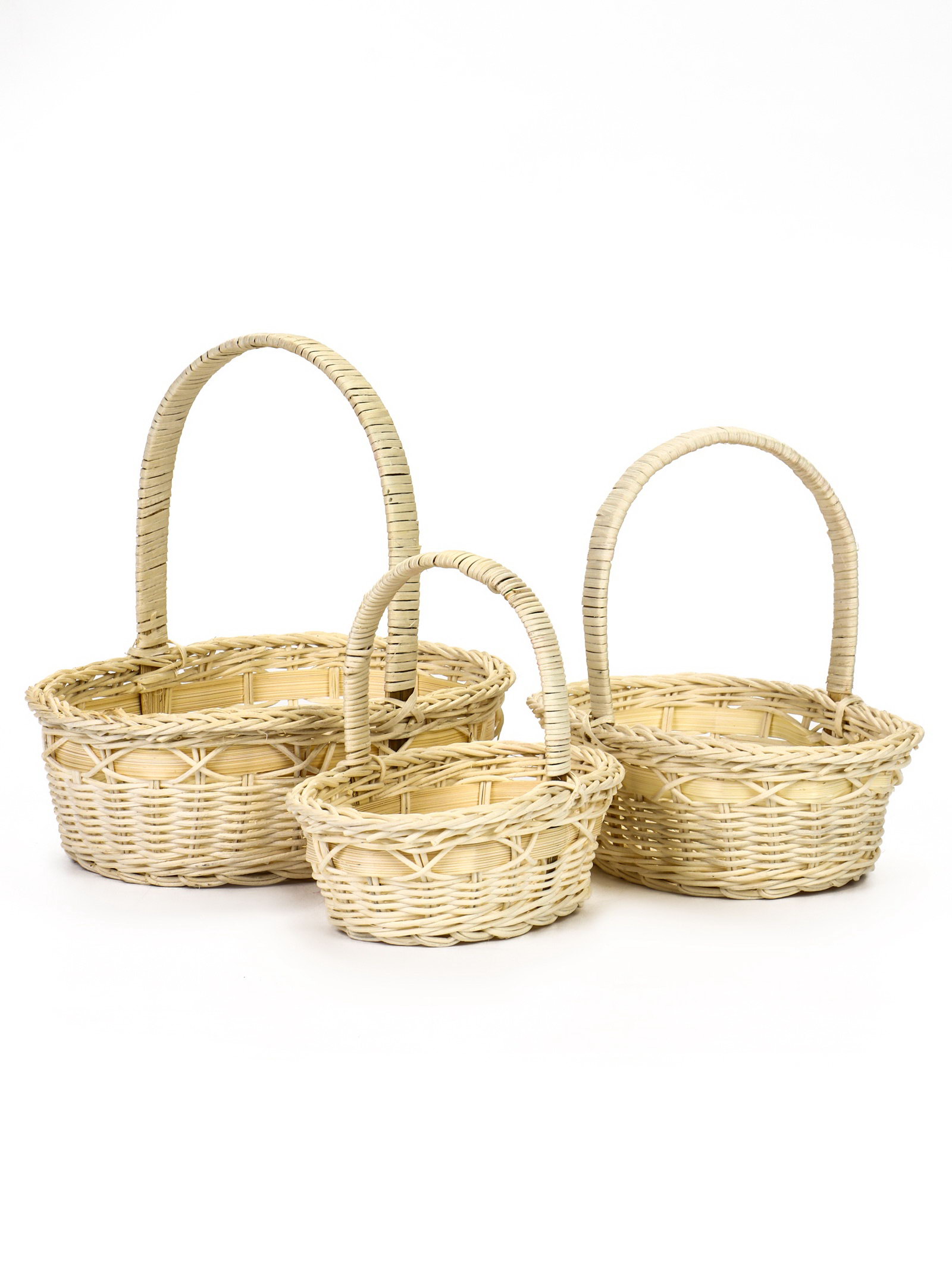 Ширина, см: 12, 15, 18 Высота без ручки, см: 7, 7.5, 8.5 Глубина, см: 7, 7.5, 8.5 Высота с ручкой, см: 15, 19, 23 Длина, см: 17, 21, 24.5 Высота, см: 15, 19, 23 Размер упаковки: 20 x 27 x 20 см. tnved: 4601999000 Крышка: Нет Дизайн: Однотонный Цвет: Бежевый С ручкой: Да Температурное ограничение: Нет Форма: Овальная Набор: Да В наборе, шт.: 3 Запрет реализации по сегментам: 00000000485 Плетёные корзины – эко изделия, актуальные во все времена. Их можно использовать в качестве: