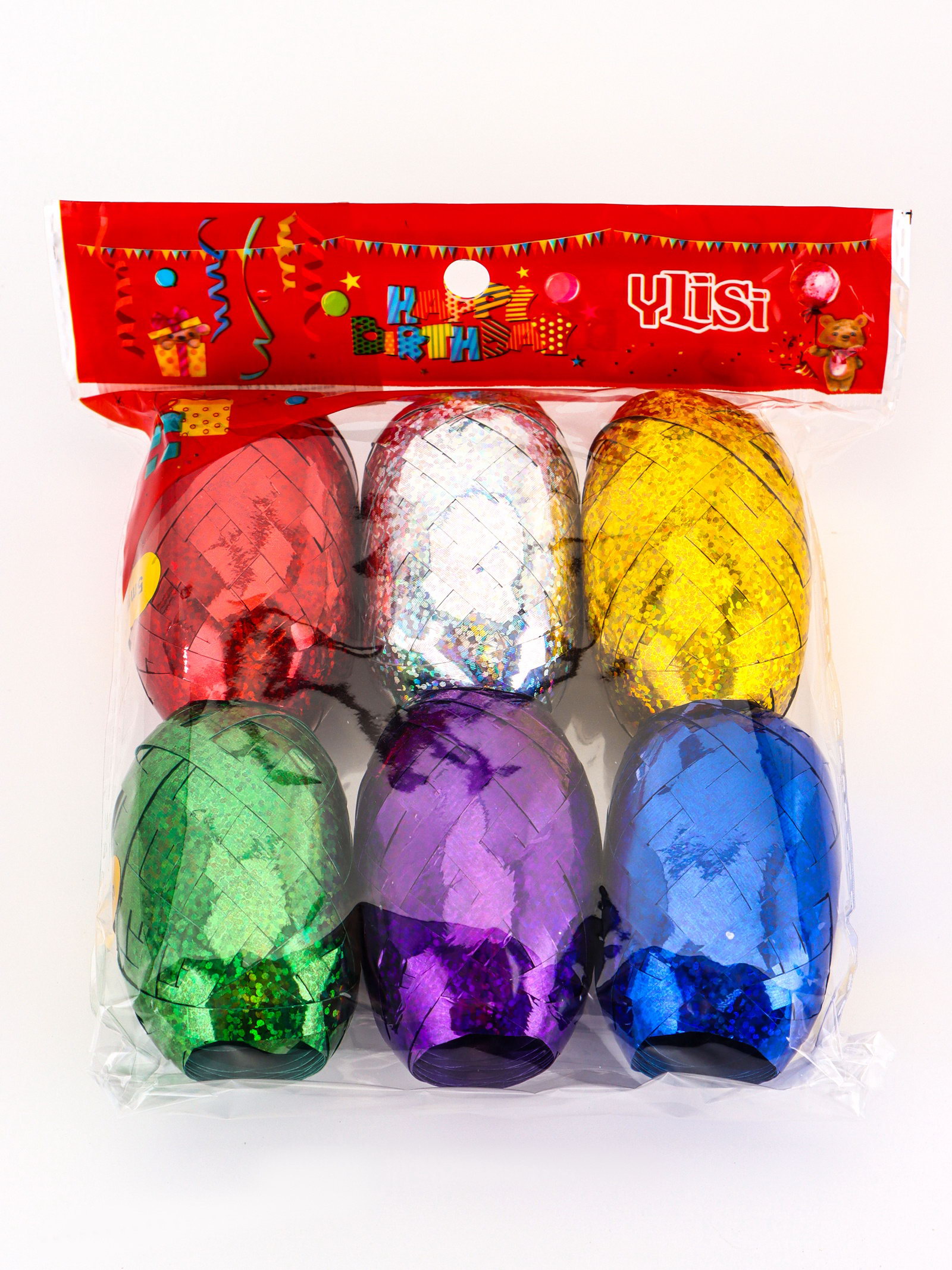 Лента упаковочная голографическая, для воздушных шаров и подарков, ассорти, набор 6 шт., 0.5 см x 10 м, 13x13x3.5 см., UPAK LAND, Китай