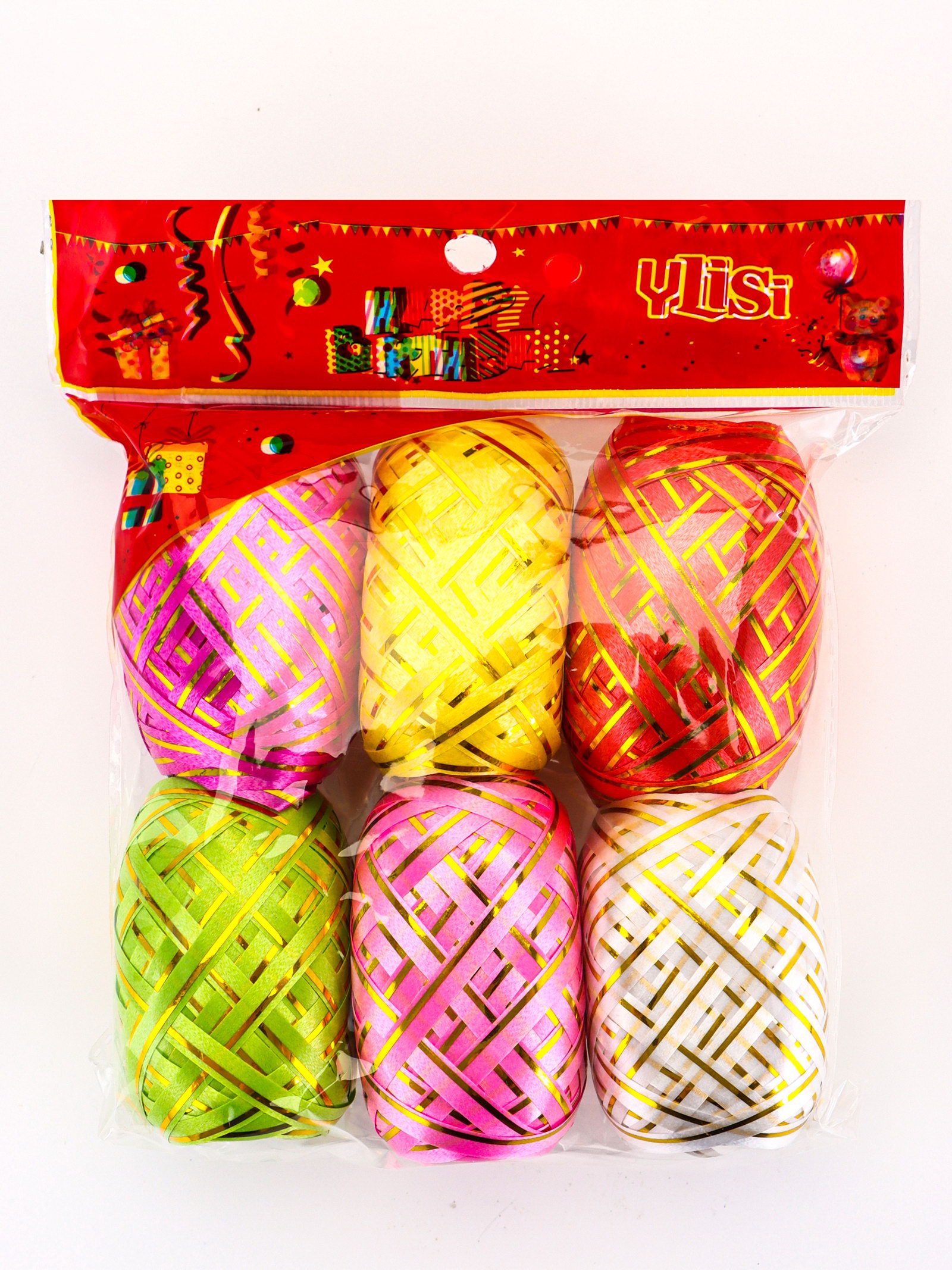 Лента упаковочная для воздушных шаров и подарков, с золотой полосой, ассорти, набор 6 шт., 0.5 см x 10 м, 13x13x3.5 см., UPAK LAND, Китай
