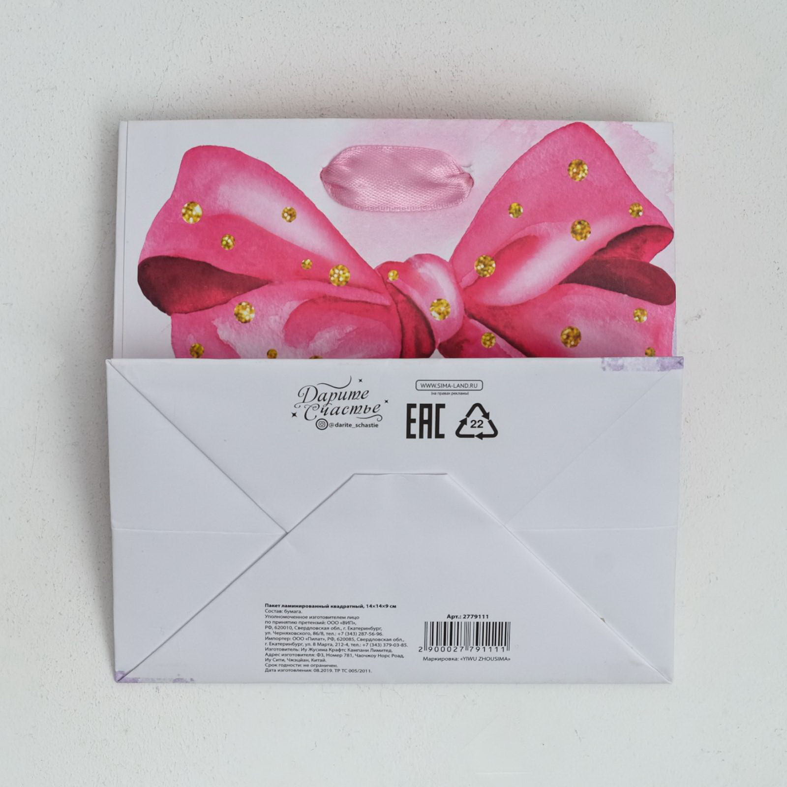Пакет подарочный ламинированный квадратный, упаковка, "Поздравляю!", 14 x 14 x 9 см, 9x14x14 см., Дарите Счастье, Китай