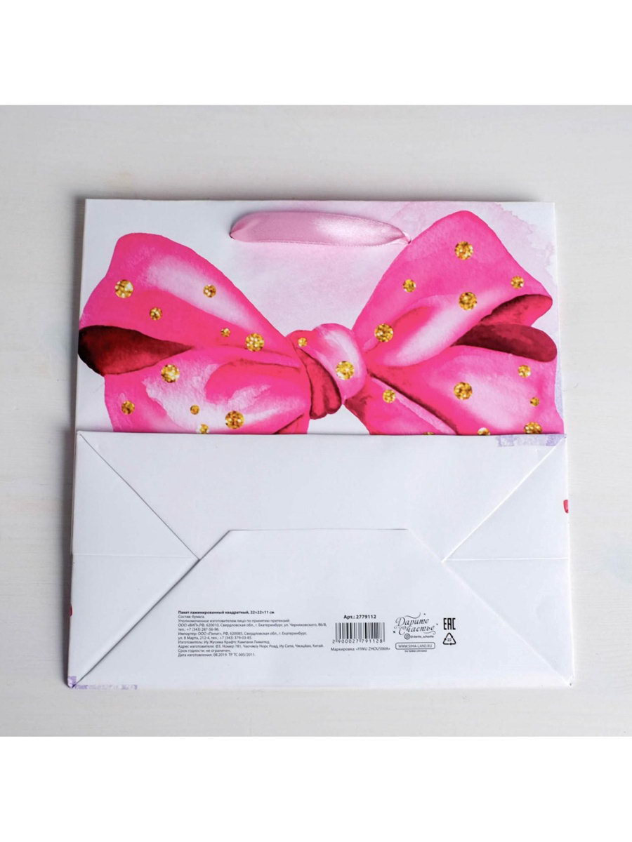 Тематика: Банты, Женская Цвет: Белый, Розовый Тематика праздника: 8 Марта, Универсальная тематика Размер упаковки: 22 x 0.3 x 22 см. Вид ручки: Ручка-лента Примерный размер: M (~ 17см x 23см) Для кого: Для женщины Для кого: Для женщины tnved: 4819400000 Рисунок: Да Плотность, г/?2: 150 Отделка пакета: Ламинация Особенности: Квадратные Допустимый вес вложения, г: 1000 Любой подарок начинается с упаковки. Что может быть трогательнее и волшебнее, чем ритуал разворачивания полученного презента. И именно оригинальная, со вкусом выбранная упаковка выделит ваш подарок из массы других. Она продемонстрирует самые тёплые чувства к виновнику торжества и создаст сказочную атмосферу праздника. Пакет подарочный ламинированный квадратный, упаковка, "Поздравляю!", 22 x 22 x 11 см это то, что вы искали. | ||