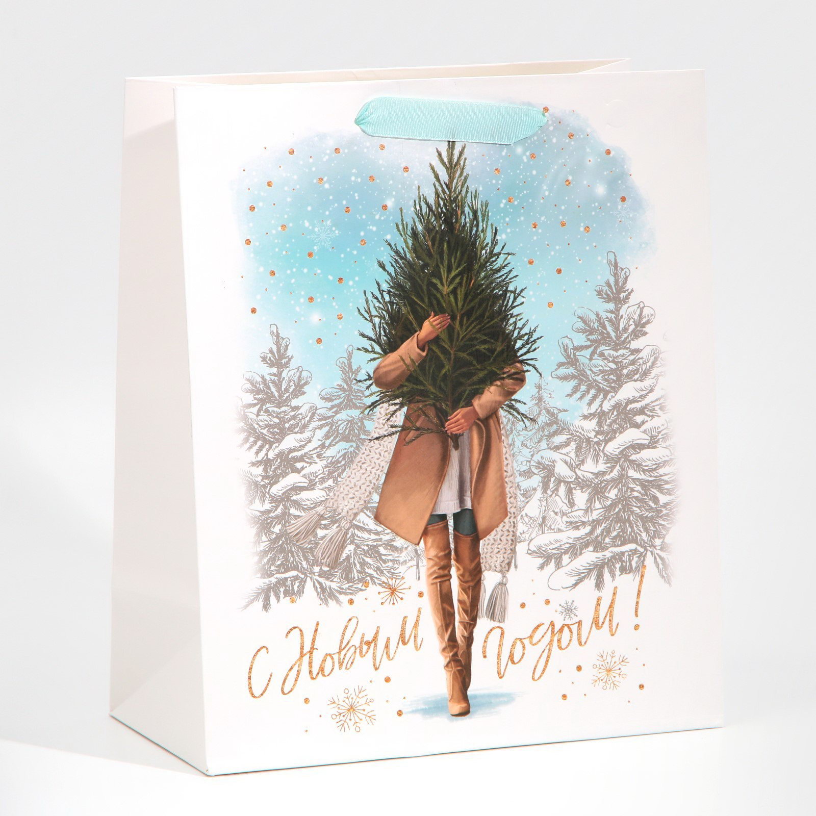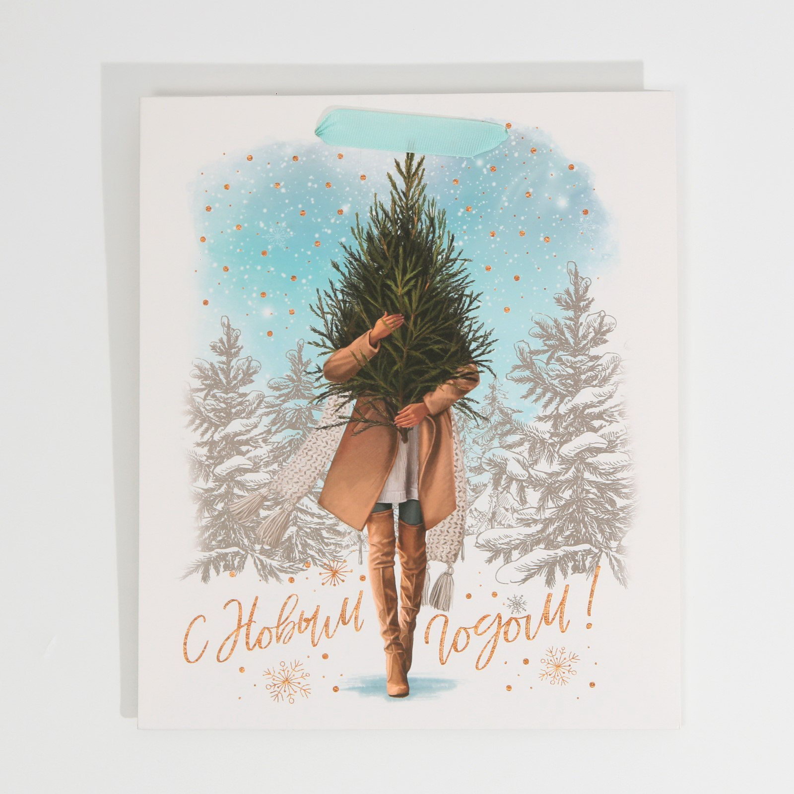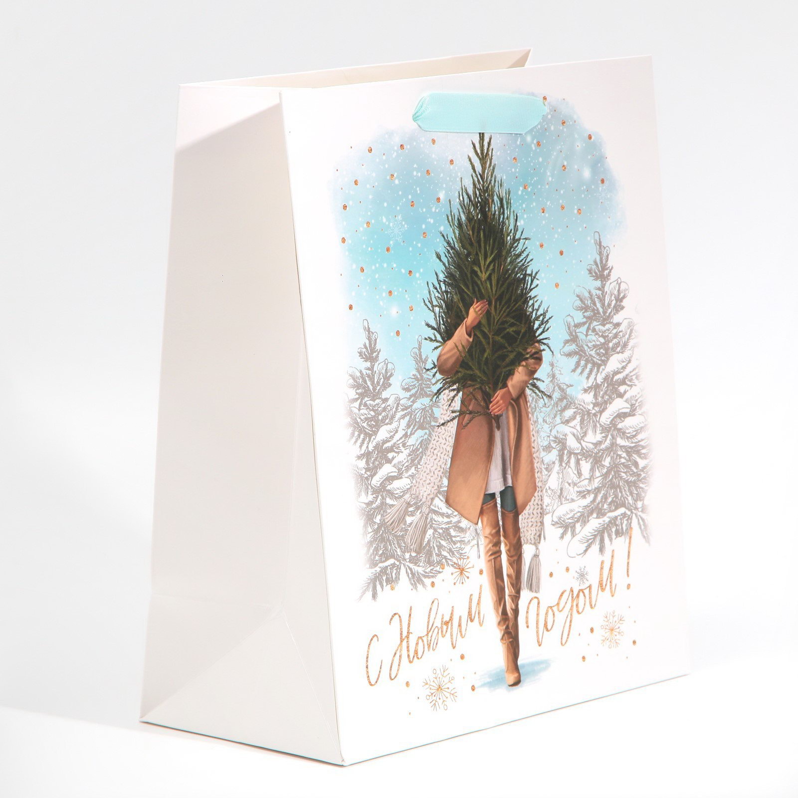 Пакет подарочный новогодний ламинированный "Девушка с ёлкой", ML 23x27x11.5 см, 27x23x11.5 см., Дарите Счастье, Китай