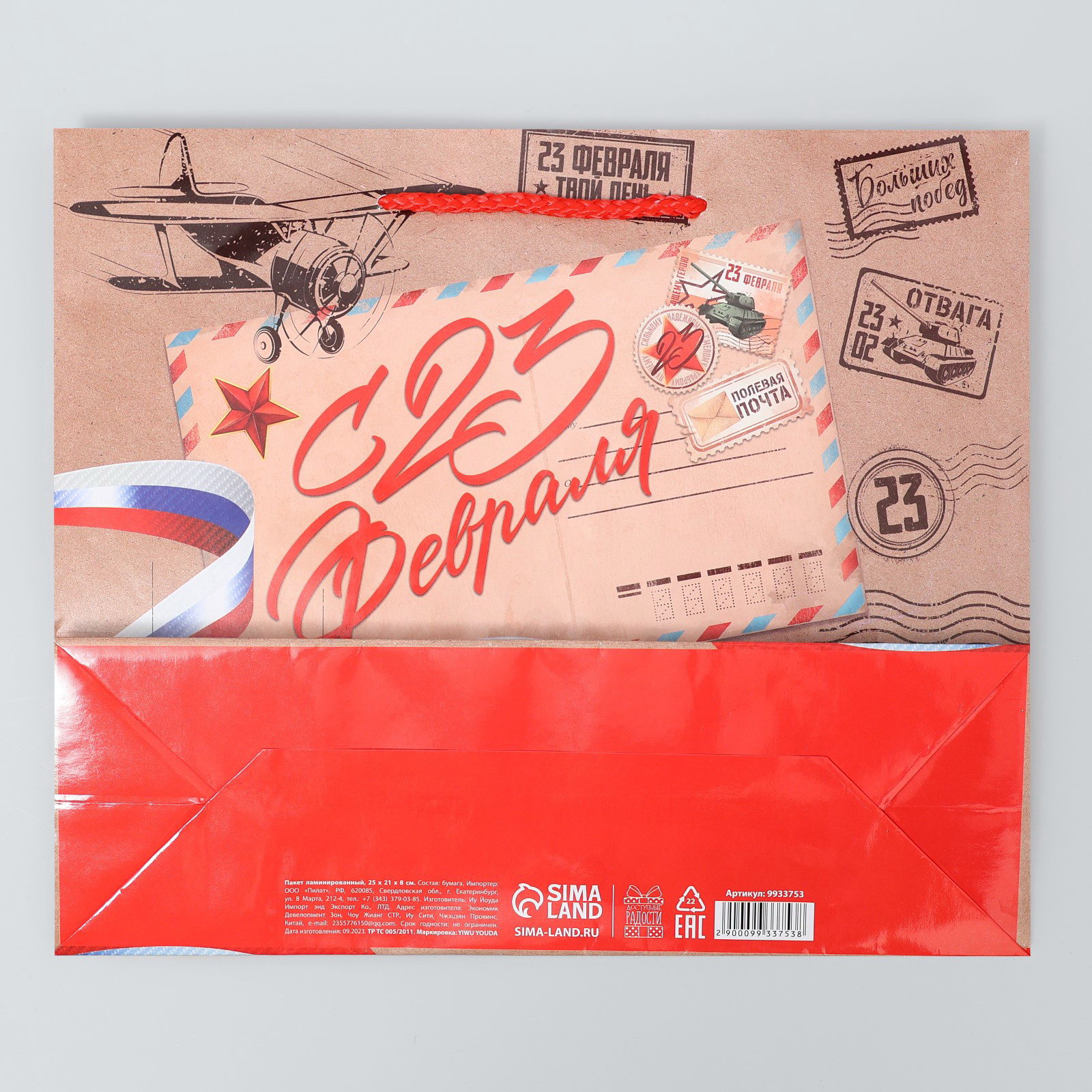 Пакет подарочный ламинированный, упаковка, "С 23 февраля", ML 25 x 21 x 8 см, 25x21x8 см., Доступные Радости, Китай