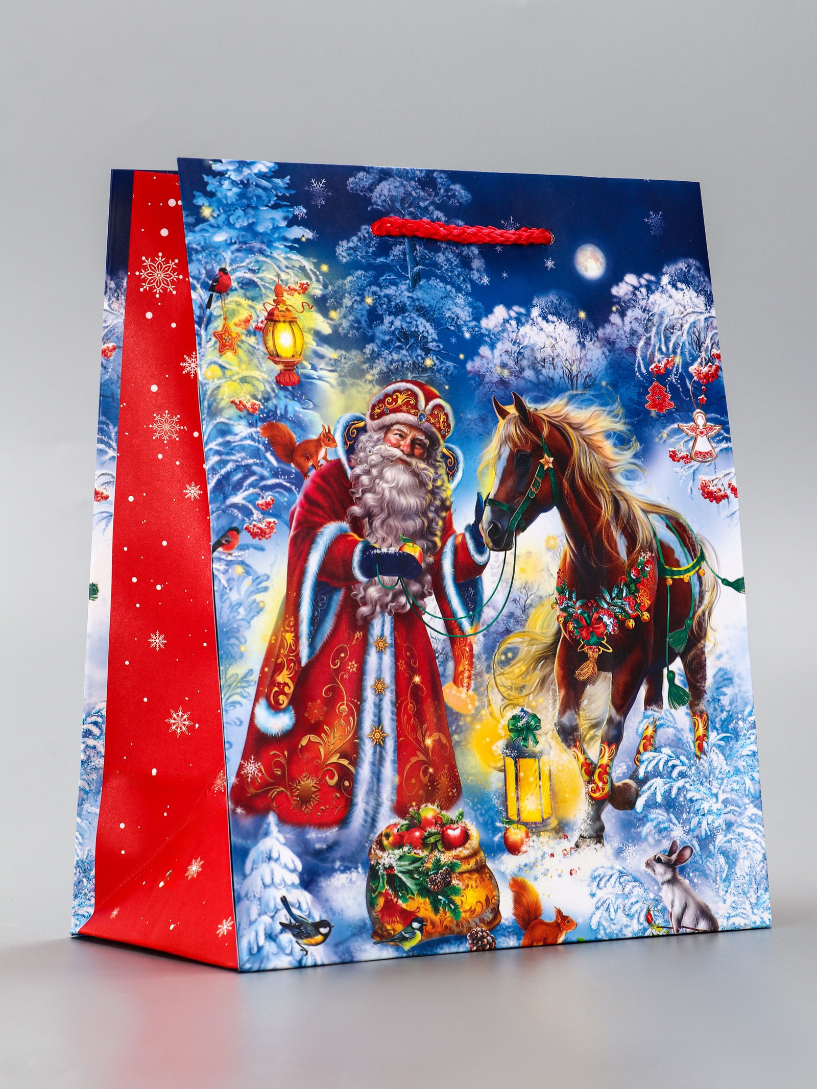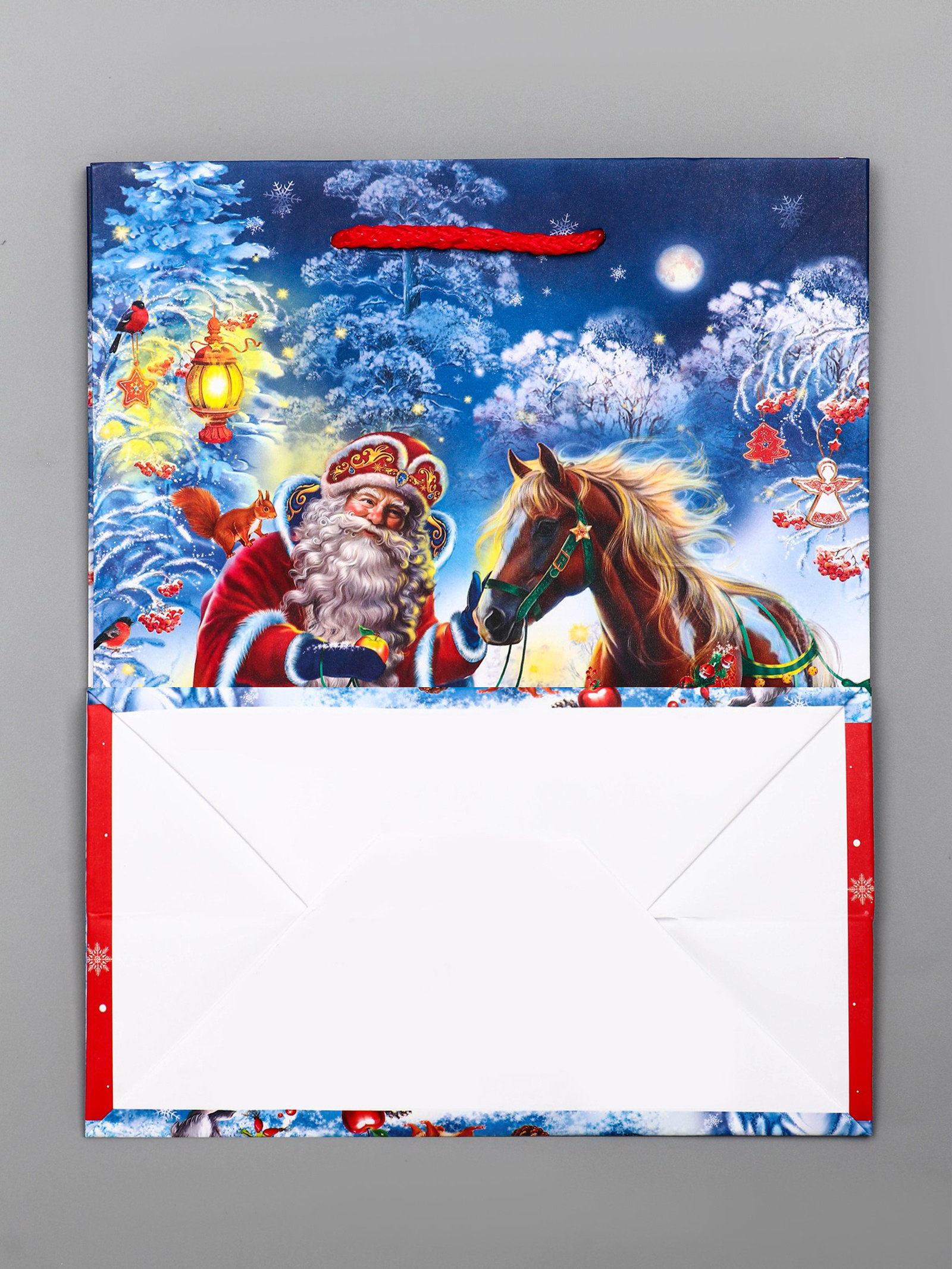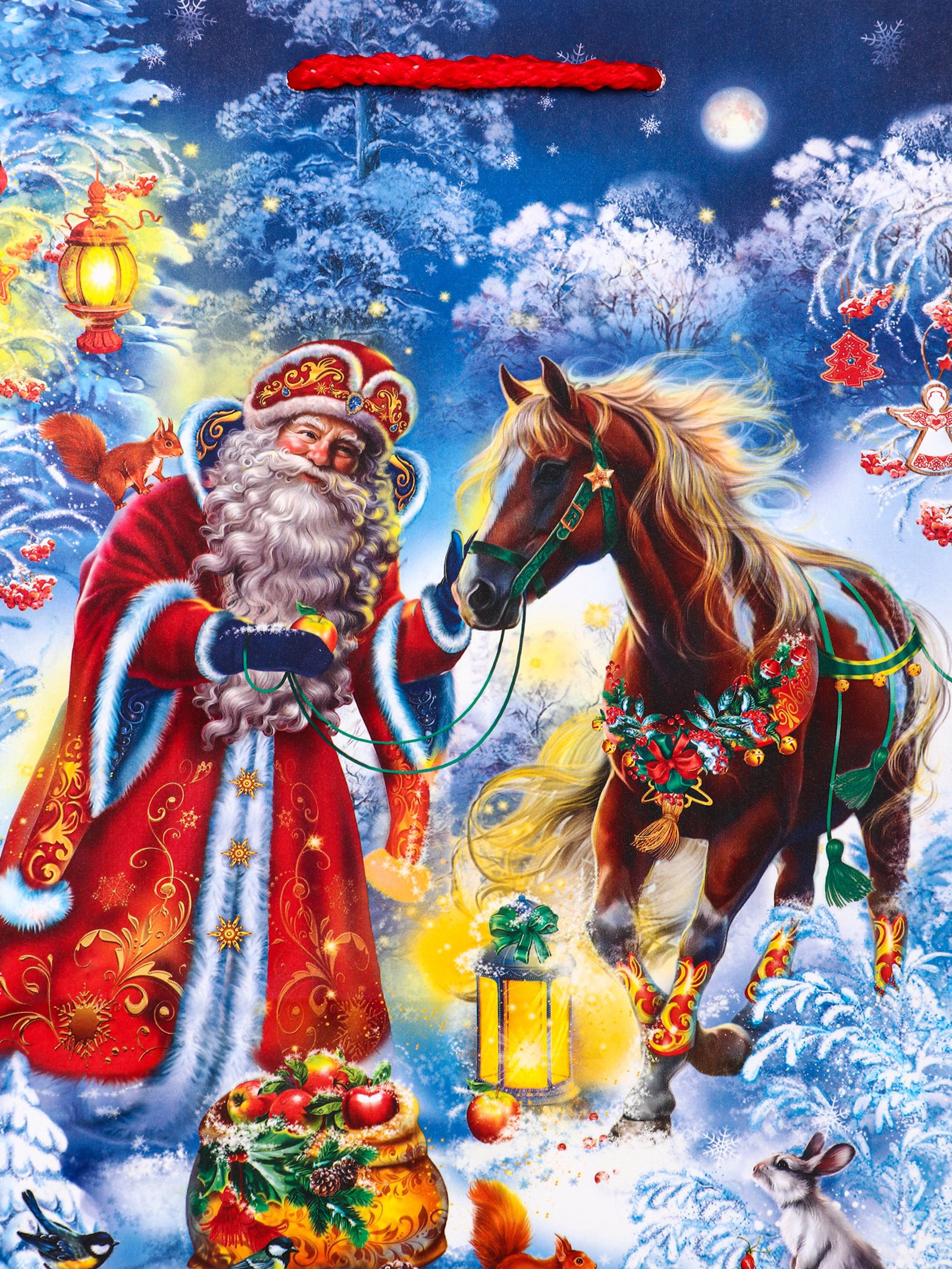Для праздничных моментов: Яркое оформление с традиционным сюжетом сразу создаёт новогоднее настроение. Пакет "Дед Мороз с Конём" готовое решение для быстрой и красивой упаковки праздничных презентов. | ||