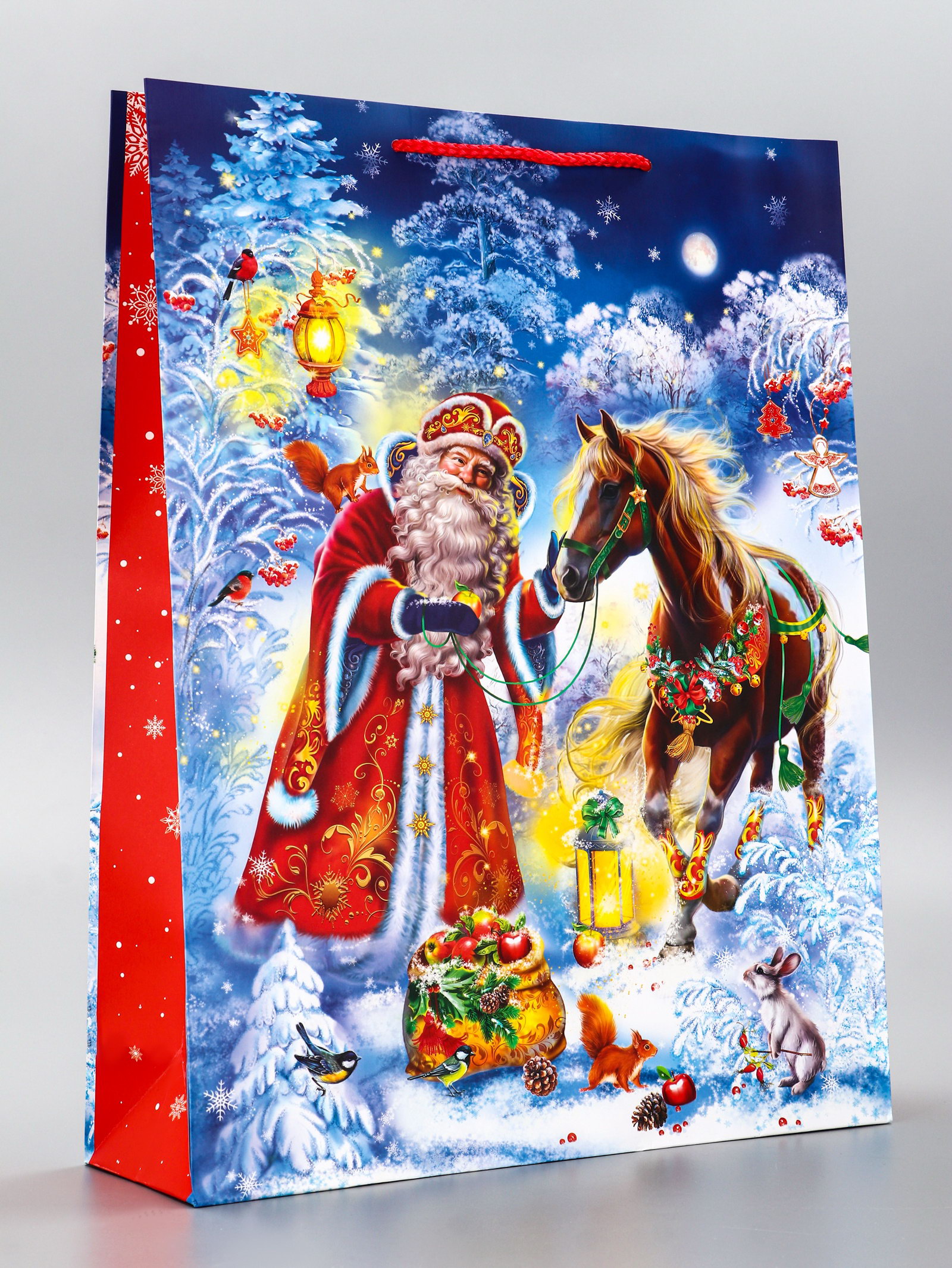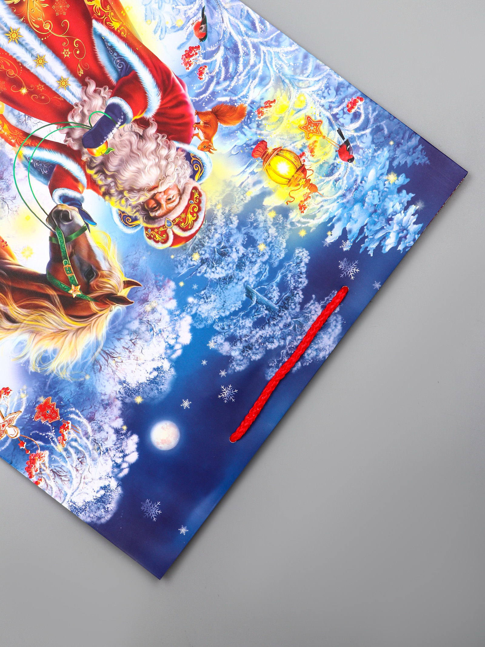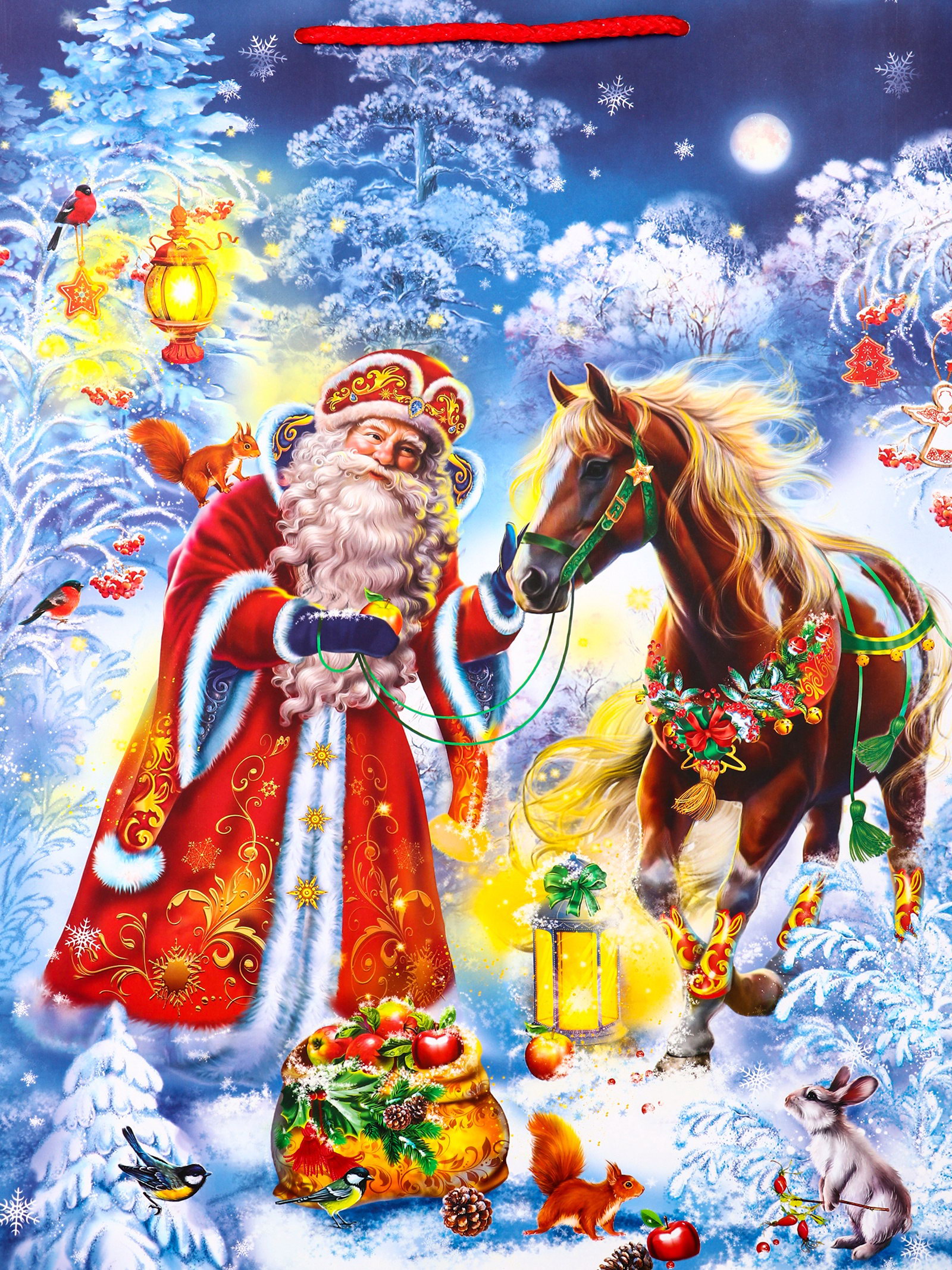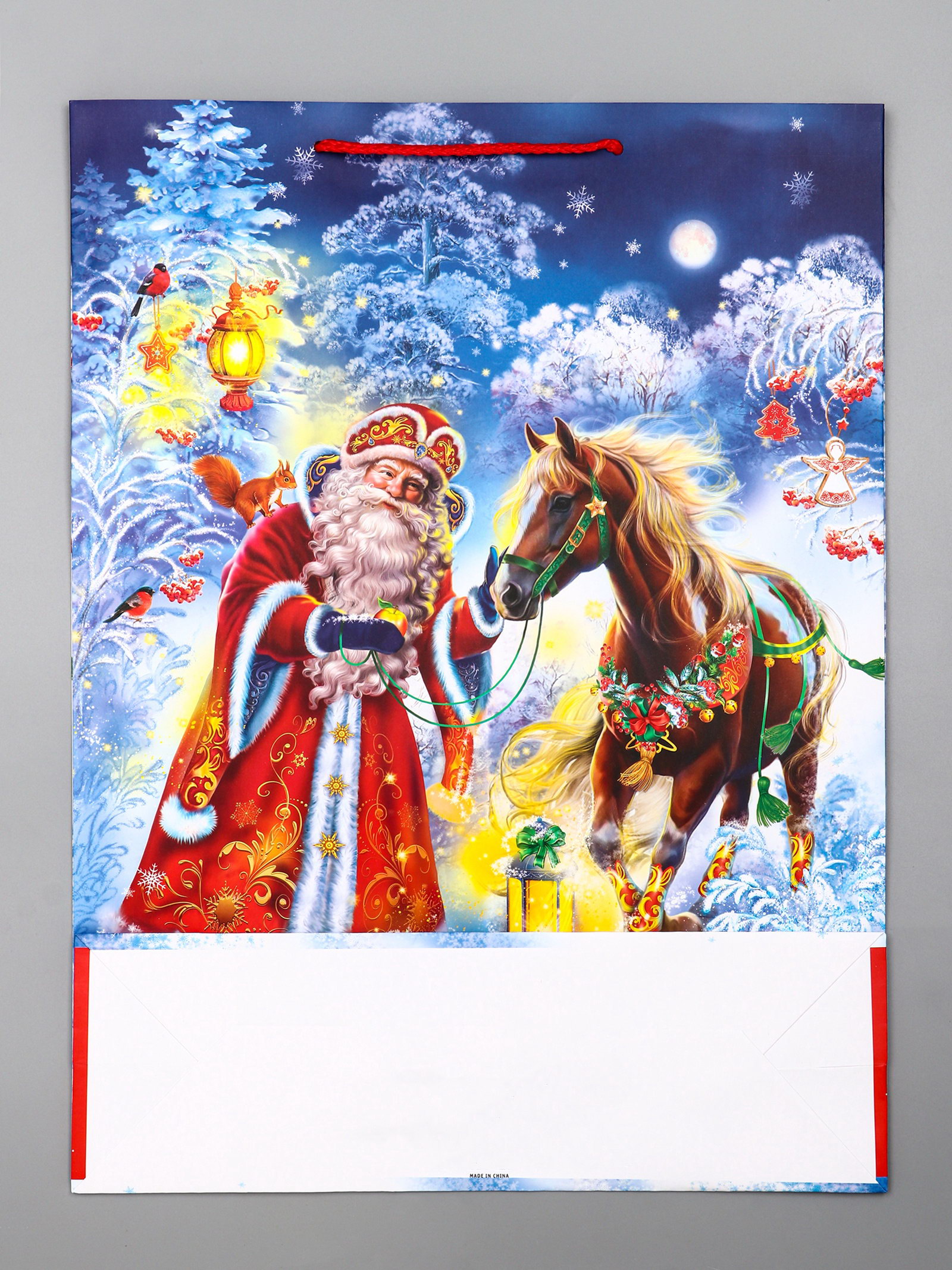 Пакет подарочный новогодний ламинированный, "Дед Мороз и Конь", 33x10x42.5 см, Китай