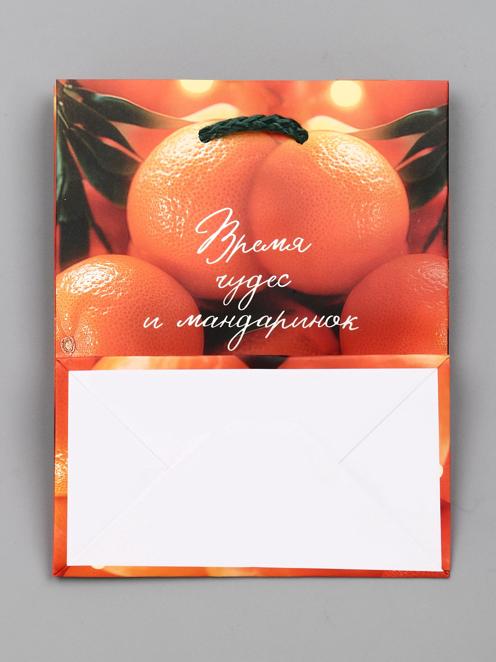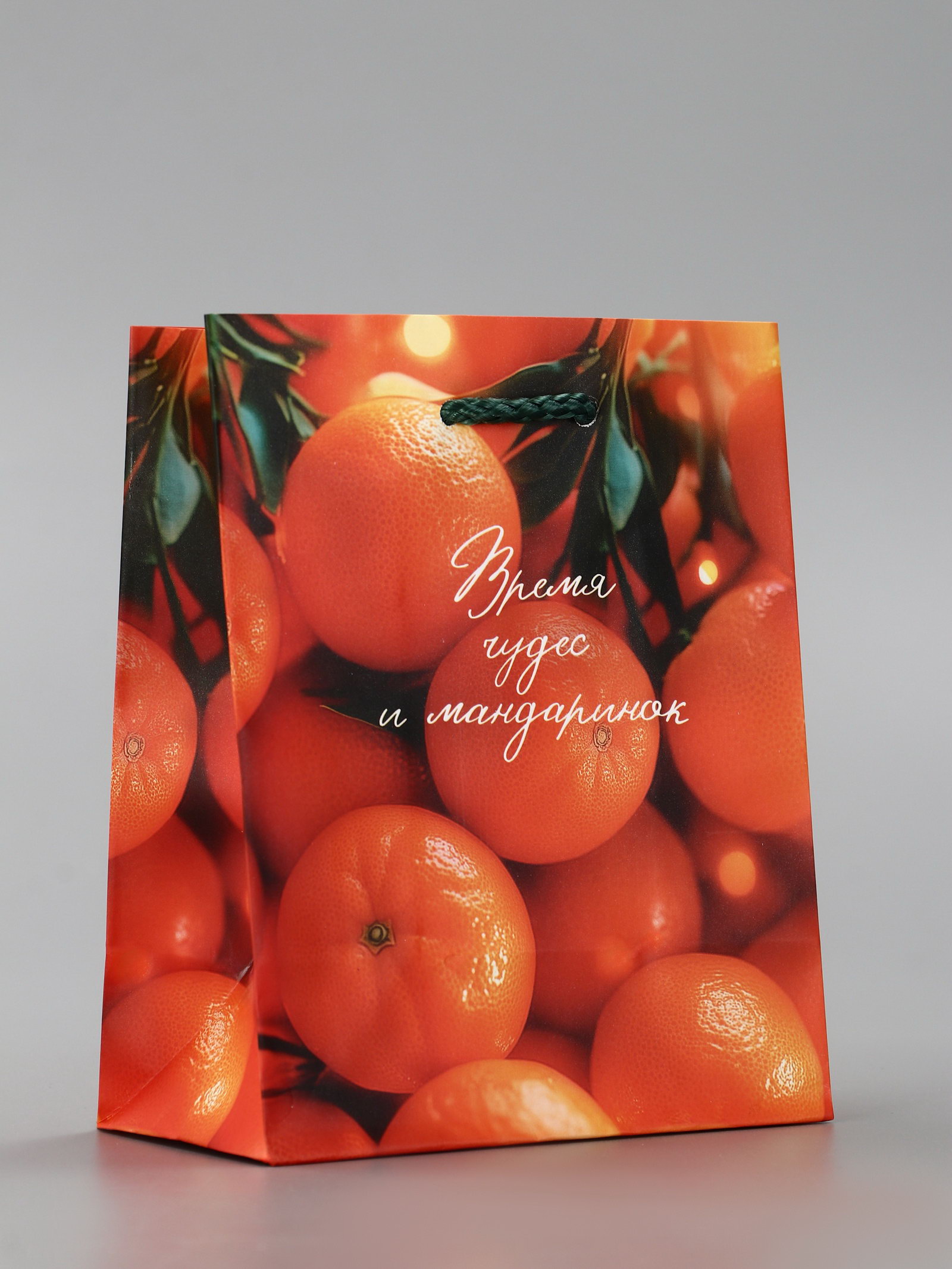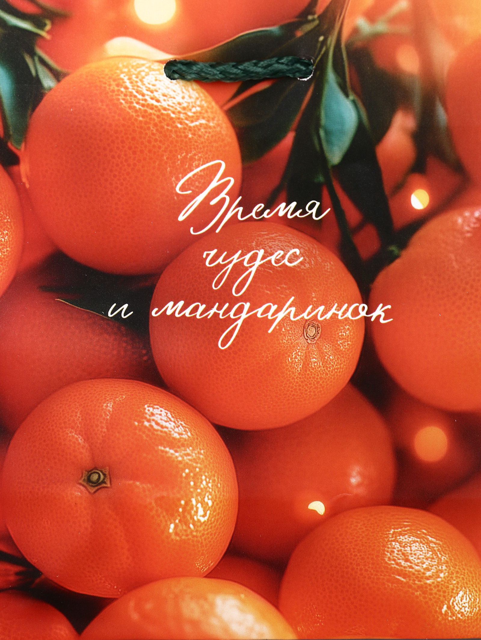 Пакет подарочный новогодний ламинированный, "Новогодние мандарины", 11.5x6.5x14.5 см, Китай