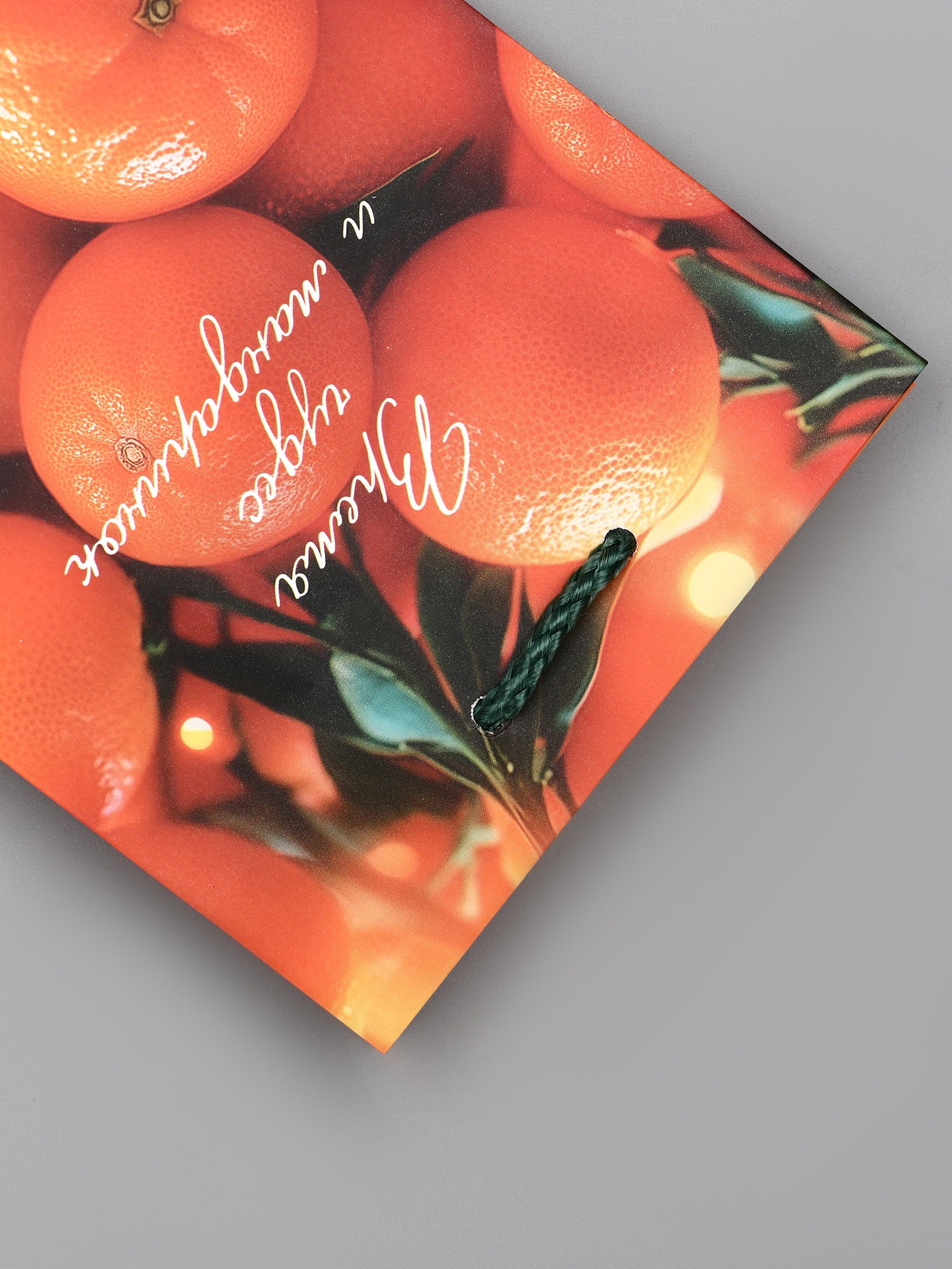 Идеальный выбор для сладких подарков: Этот пакет особенно подходит для презентов, связанных с угощениями и сладостями. Образ мандаринов напоминает о детском ожидании праздника, семейных традициях и том особом аромате, который ассоциируется с Новым годом. "Новогодние мандарины" это упаковка, которая сама по себе вызывает ощущение праздника. | ||
