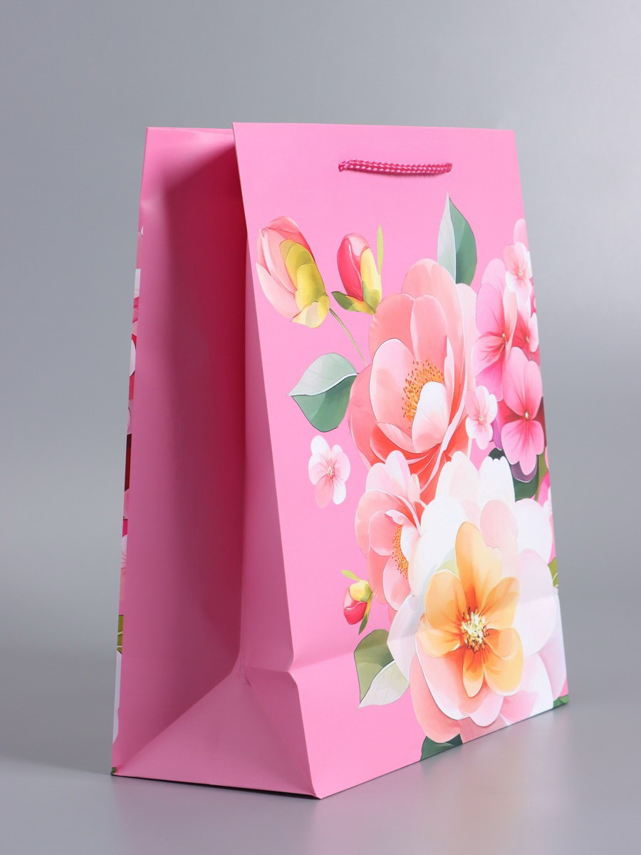 Цвет: Разноцветный, Розовый Для кого: Для девочки, Для женщины Тематика: Женская, Цветочно-растительная Тематика праздника: 14 Февраля, 8 Марта, Универсальная тематика Размер упаковки: 26 x 0.2 x 32 см. tnved: 4819300000 Температурное ограничение: Нет Отделка пакета: Ламинация Вид ручки: Ручка-шнур Плотность, г/?2: 180 Примерный размер: L (~ 26см x 33см) Дизайн: С рисунком, надписью Ширина, см: 12 Длина, см: 26 Расширение: Боковая складка Форма: Прямоугольная Вид: Бумажный пакет Рисунок: Да Высота, см: 32 Форма пакета: Вертикальный Дарите самые светлые пожелания! Ламинированный подарочный пакет с надписью "Счастья и радости" это упаковка, наполненная позитивными эмоциями. Её яркий цветочный дизайн и доброе послание создают атмосферу праздника и тепла.