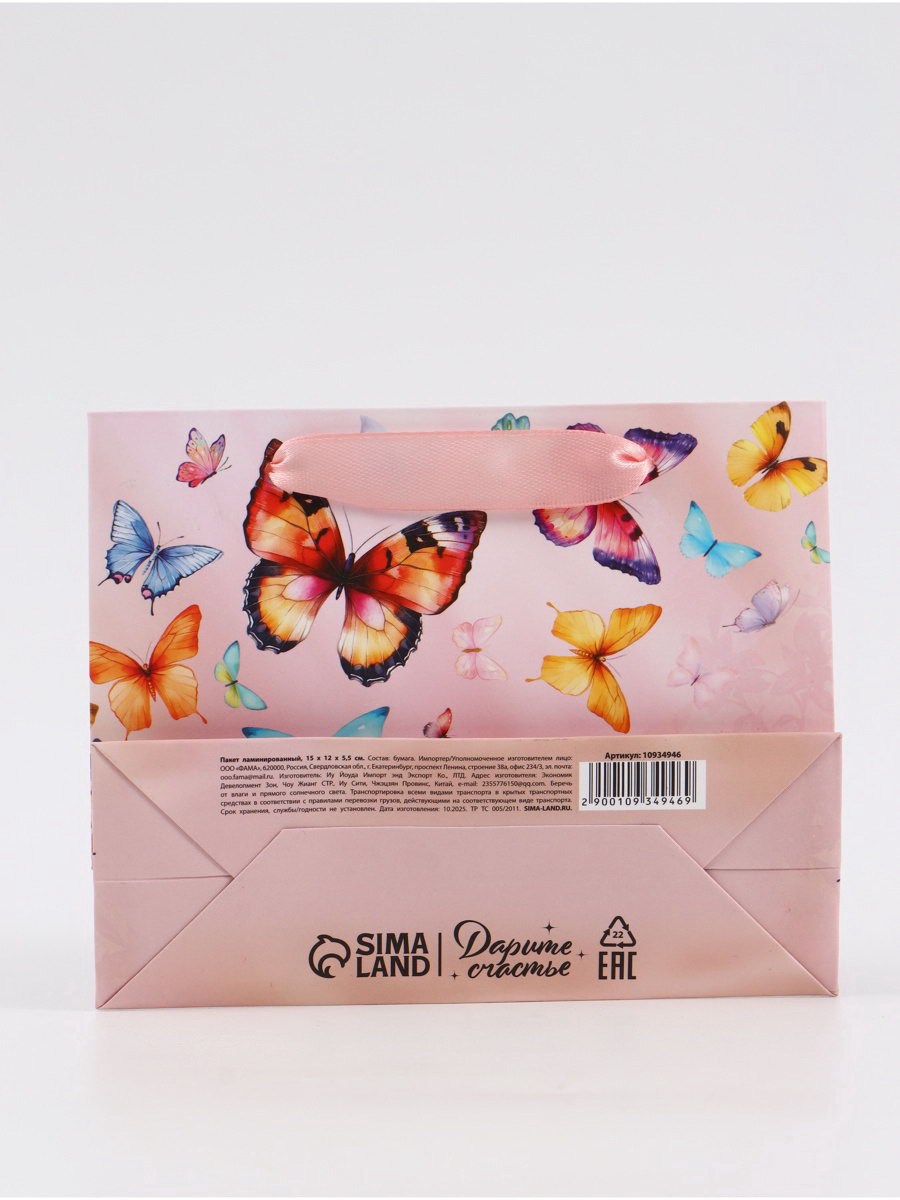 Для кого: Для девочки, Для женщины Тематика праздника: 8 Марта, Универсальная тематика Тематика: Бабочки, Надписи, цифры, буквы Размер упаковки: 15 x 12 x 0.5 см. tnved: 4819400000 Плотность, г/?2: 157 Цвет: Розовый Дизайн: С рисунком, надписью Примерный размер: S (~ 12см x 16см) Вид ручки: Ручка-лента Отделка пакета: Ламинация | ||