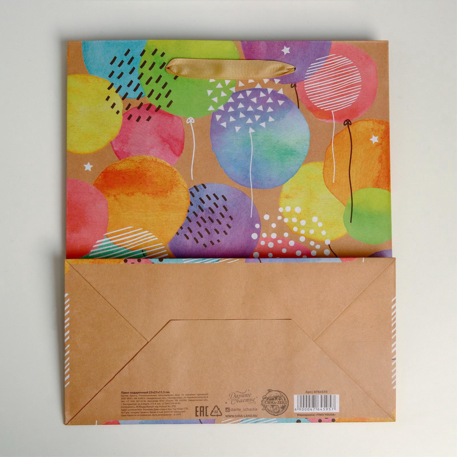 Тематика: Воздушные шары, Шары Размер упаковки: 23 x 0.3 x 27 см. Цвет: Разноцветный Для кого: Унисекс tnved: 4819400000 Примерный размер: ML (~ 23см x 27см) Тематика праздника: День рождения Вид ручки: Ручка-лента Особенности: Без особенностей Отделка пакета: Крафт Плотность, г/?2: 150 Допустимый вес вложения, г: 1000 | ||