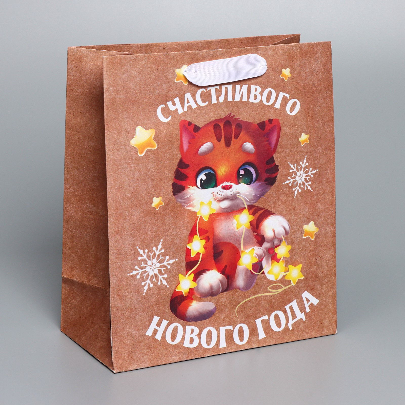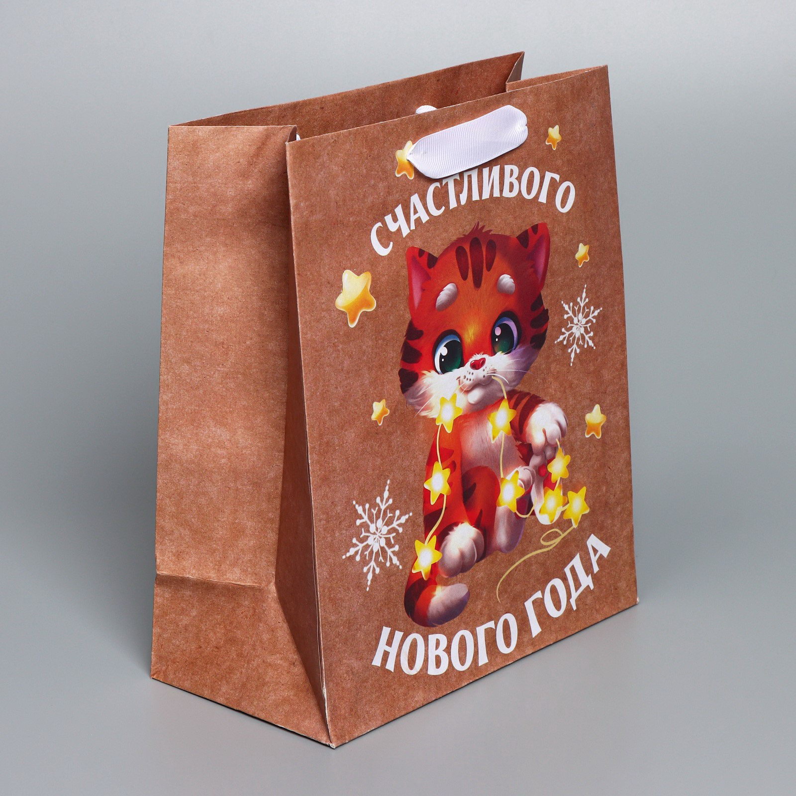 Пакет крафтовый вертикальный "Новогодние огоньки", ML 23 x 27 x 11.5 см, 11.5x27x23 см., Дарите Счастье, Китай