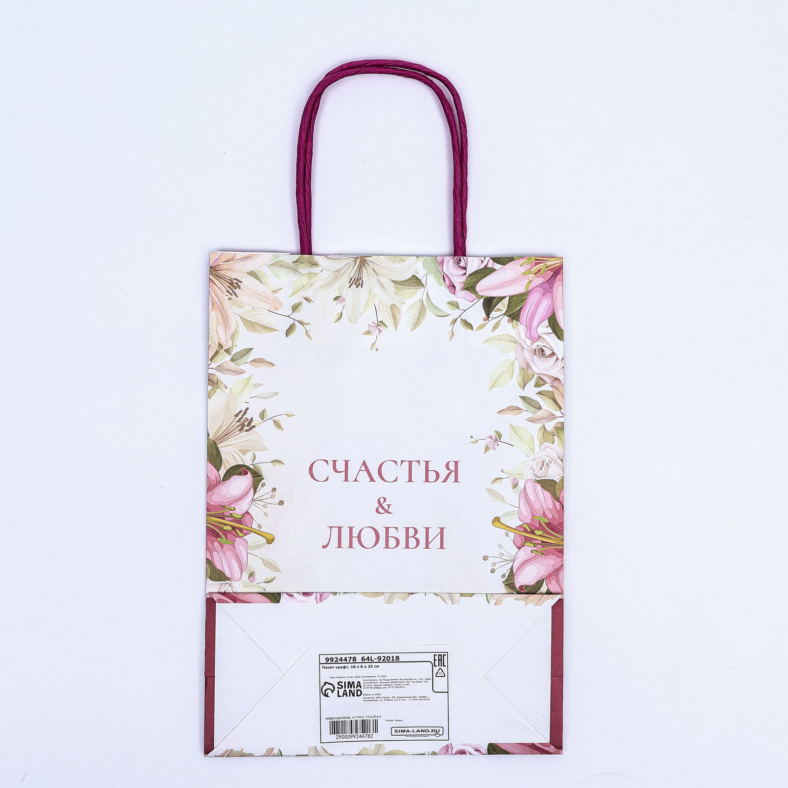 Пакет крафт "Счастья & Любви" 18x8x25 см, 8x18x25 см., UPAK LAND, Китай