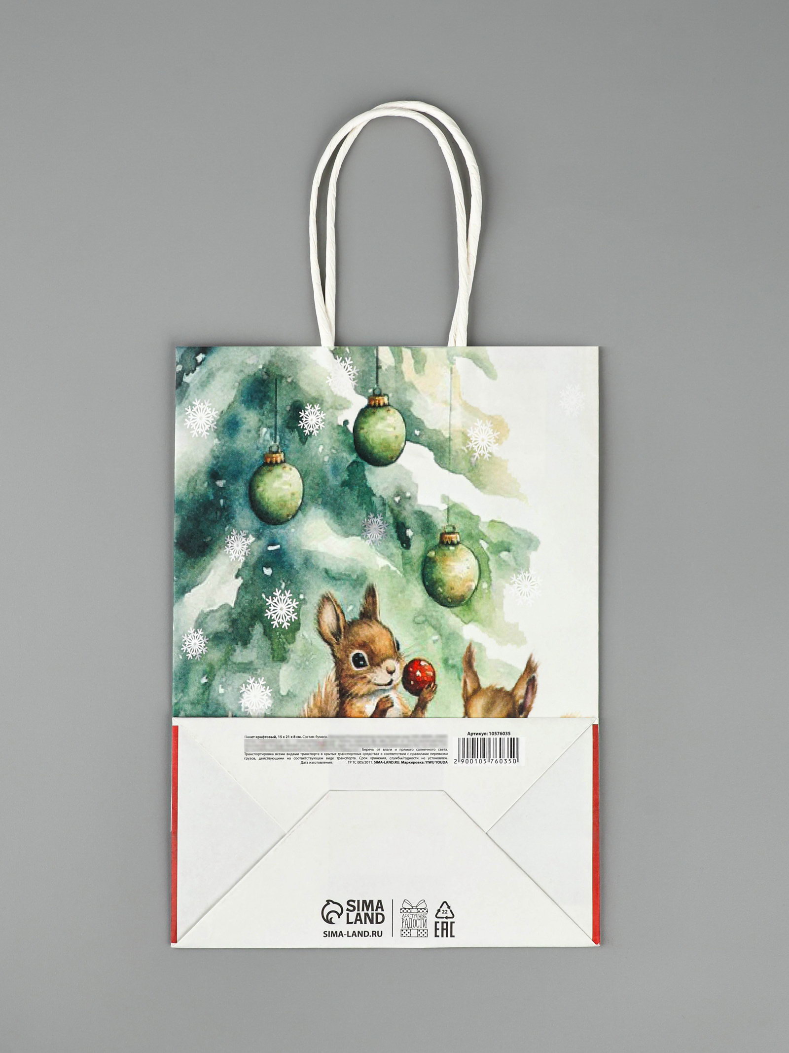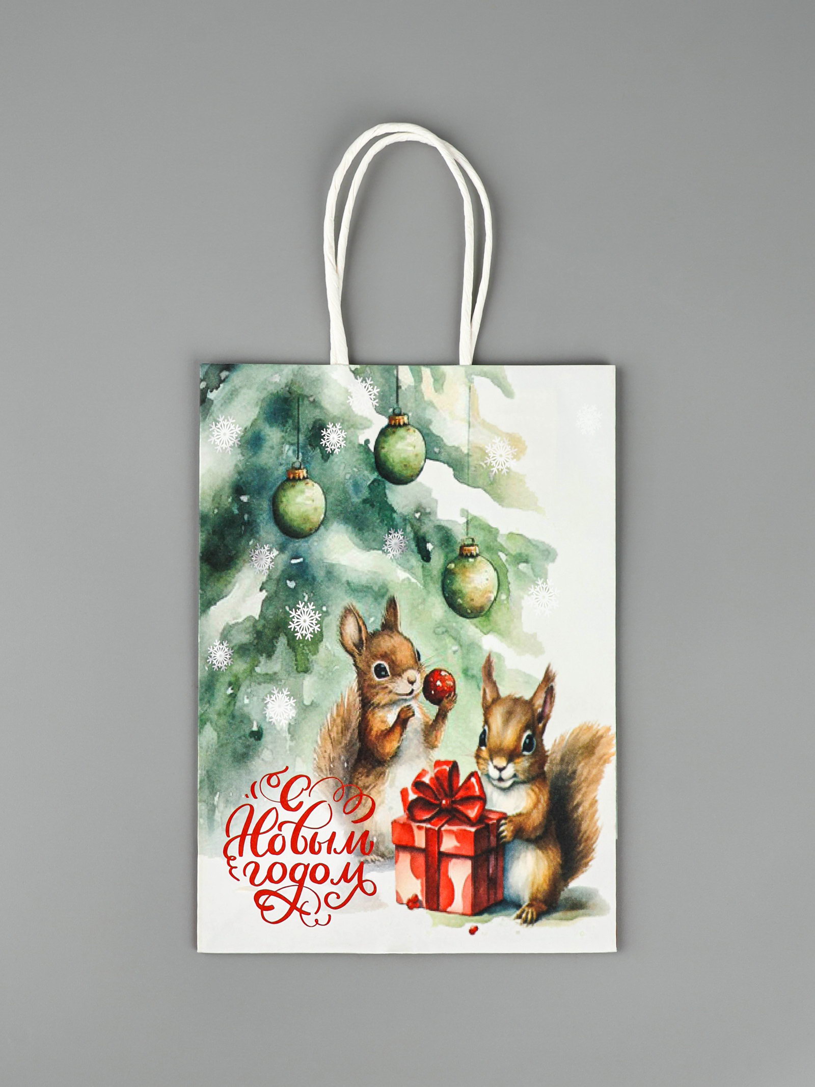 Пакет бумажный подарочный новогодний крафт "Белки" 15x21x8 см, 8x15x21 см., Дарите Счастье, Китай