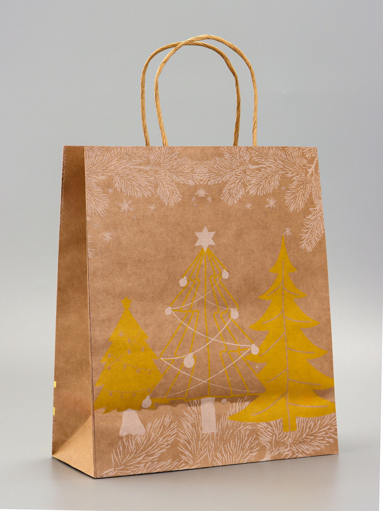 Пакет подарочный новогодний, крафт с золотым тиснением, круглая ручка, "Рождественский лес" 33x25x12 см, 120 г, 25x33x12 см., UPAK LAND, Китай