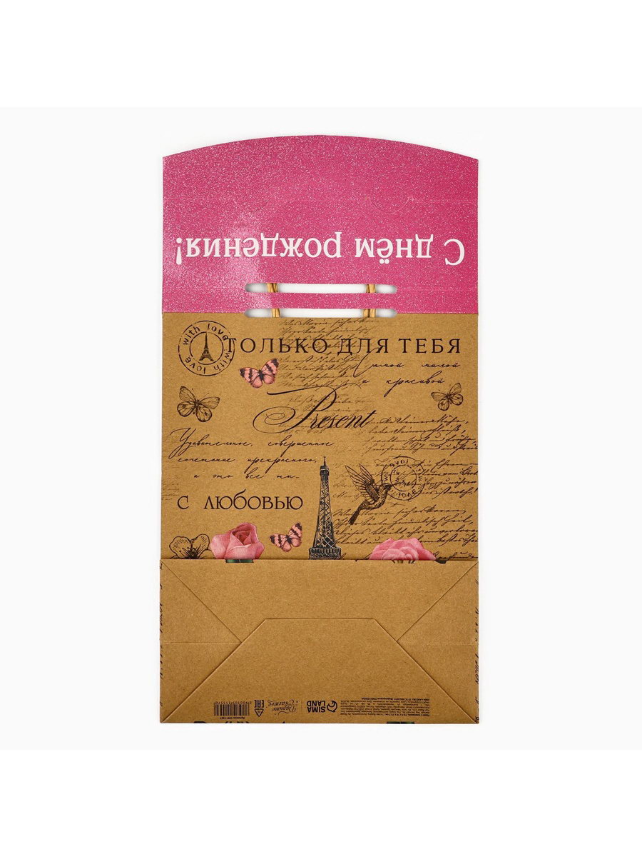 Пакет с клапаном "С Днём рождения", крафт, глиттер, 19.5 x 10 x 25 см, 10x19.5x25.2 см., Дарите Счастье, Китай